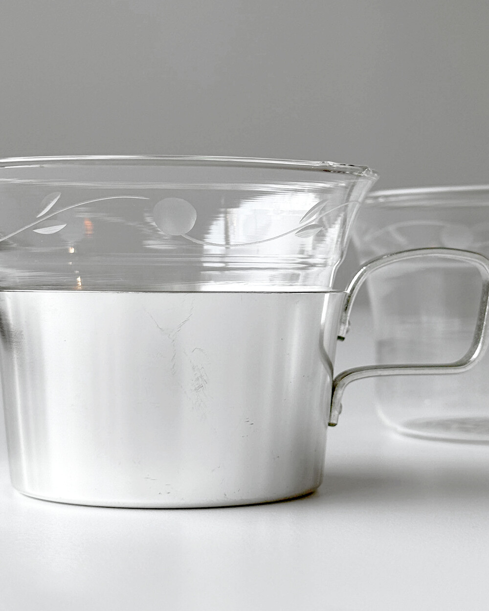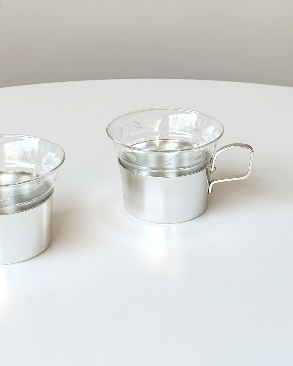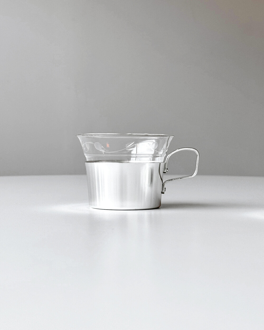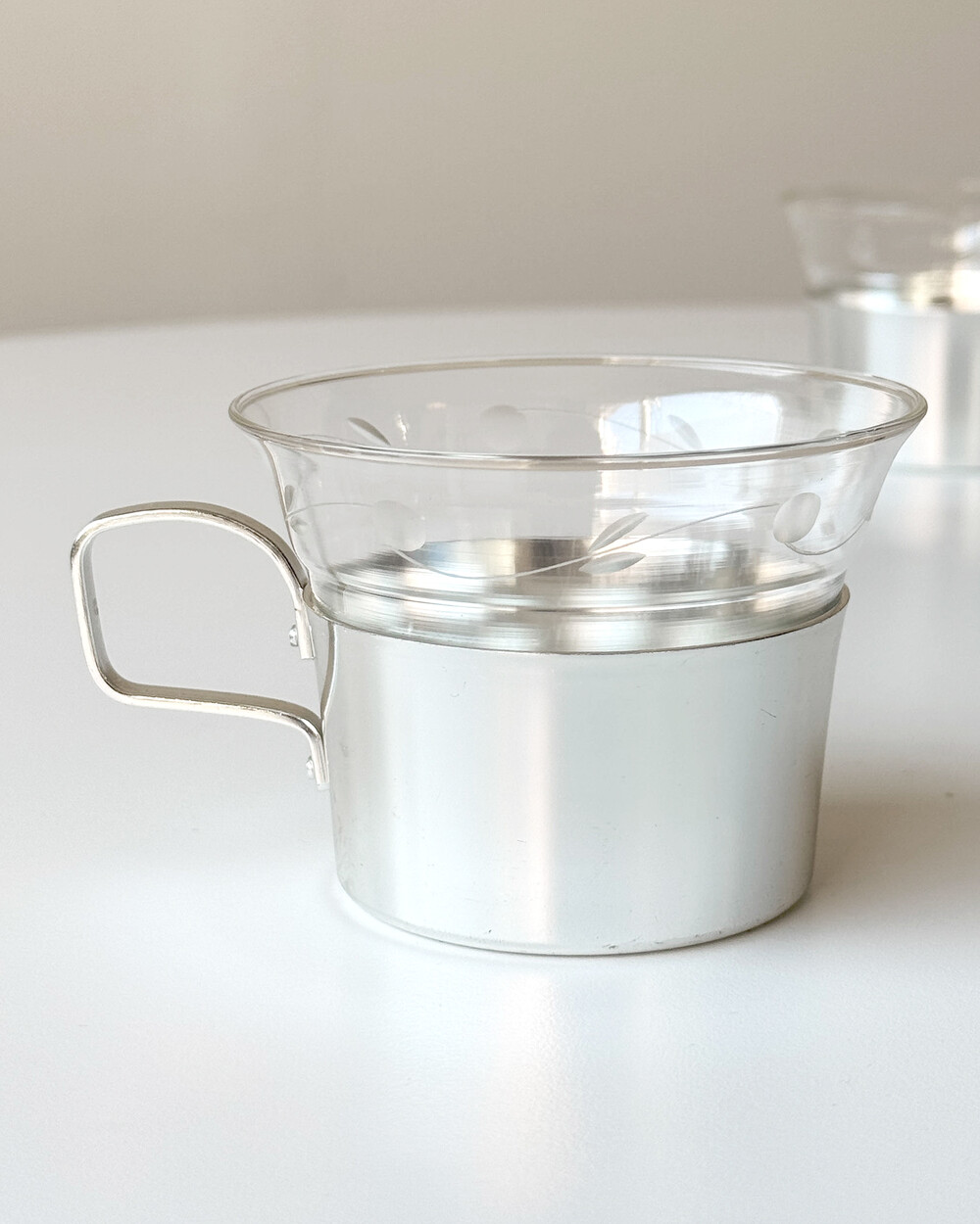 섬세한 카빙 패턴이 장식된 글라스와 견고하면서도 가벼운 실버 메탈 홀더가 조화된, 1950년대 동독의 유리회사 Heise Glas에서 제작된 호텔웨어 라인입니다.