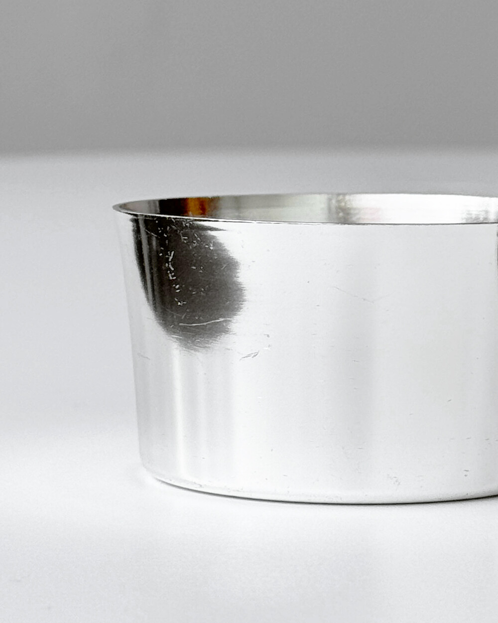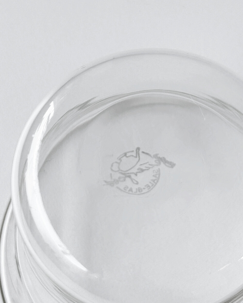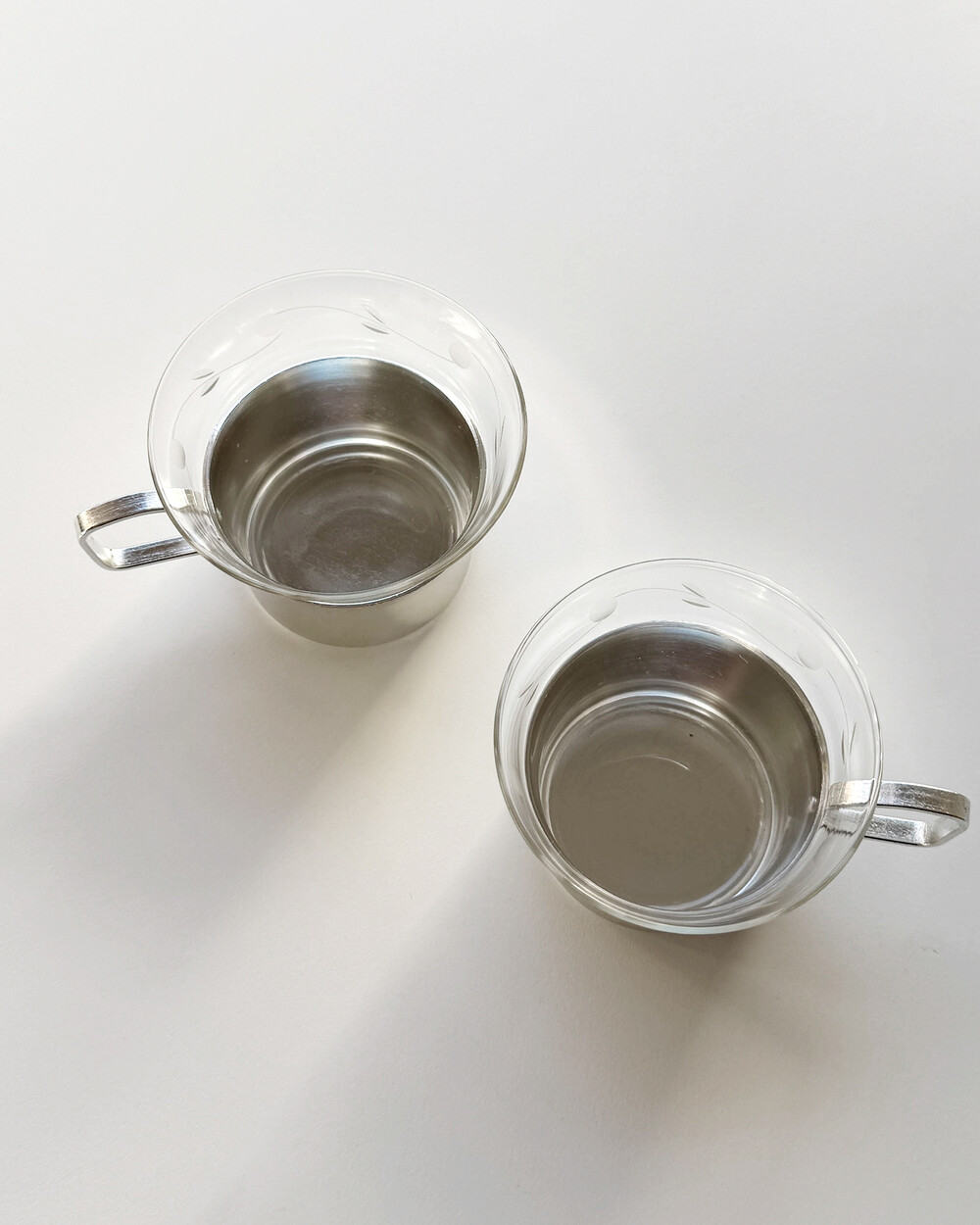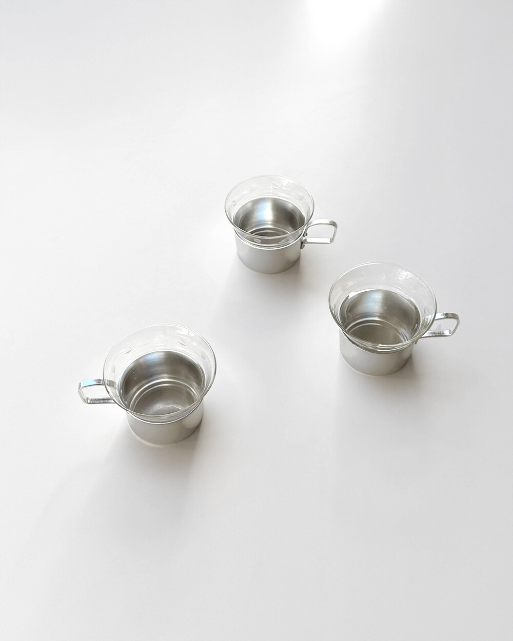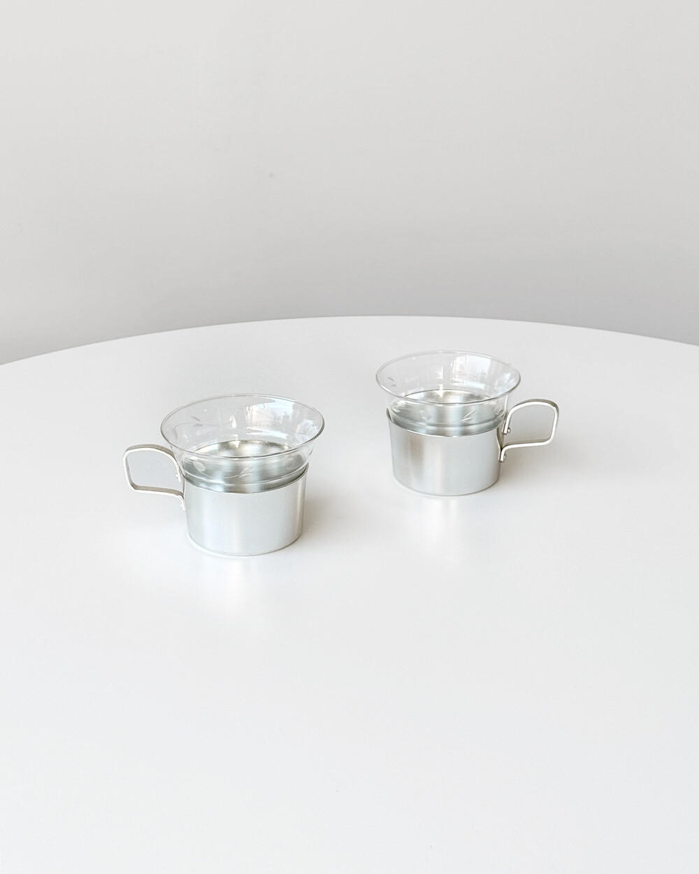 섬세한 카빙 패턴이 장식된 글라스와 견고하면서도 가벼운 실버 메탈 홀더가 조화된, 1950년대 동독의 유리회사 Heise Glas에서 제작된 호텔웨어 라인입니다.