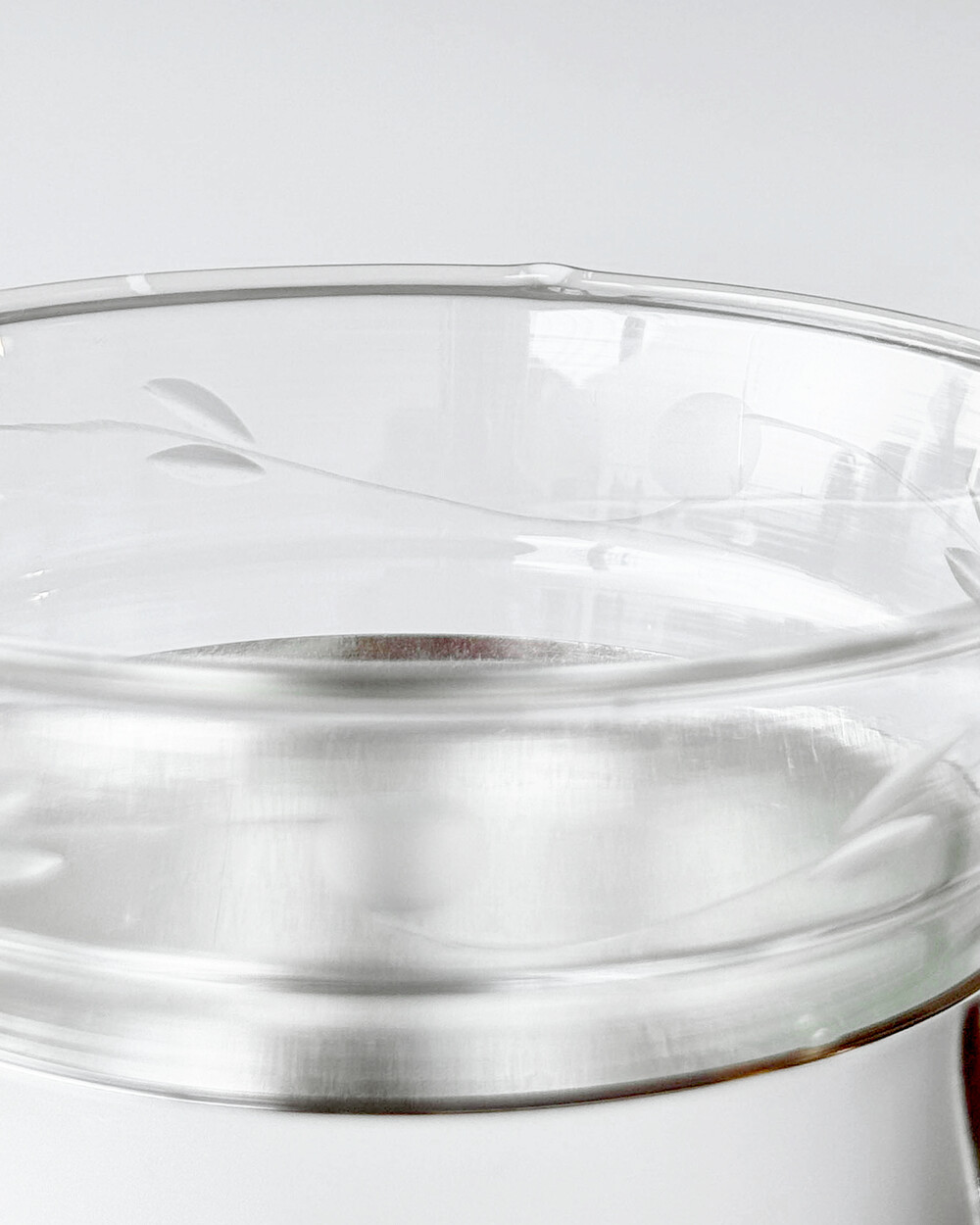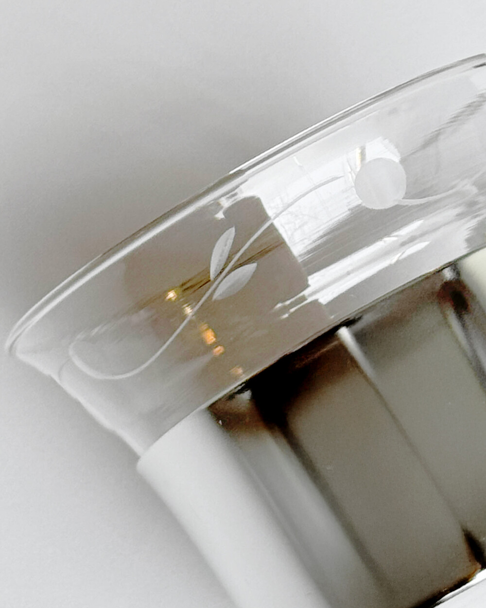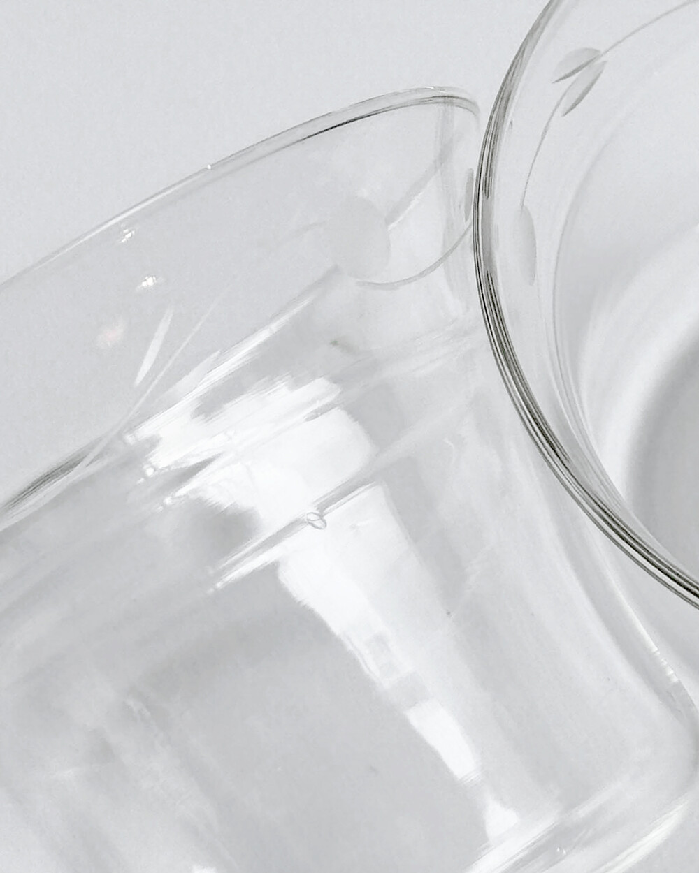 투명한 글라스 위의 섬세한 라인과 도트, 잎사귀 패턴은 핸드 카빙으로 장식되어 있습니다.