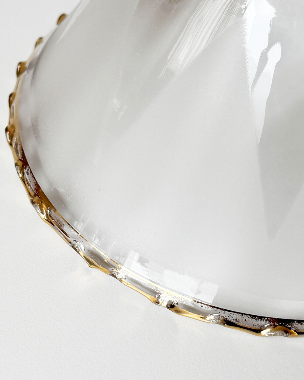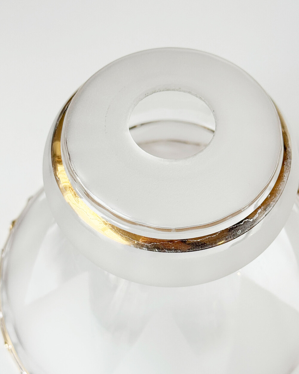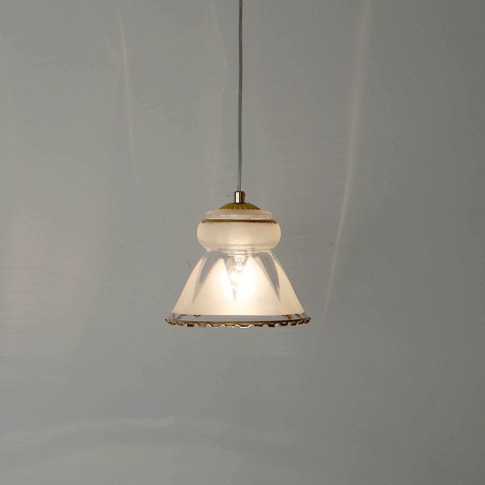 상단의 부드러운 반투명 프로스트 패턴과 가장자리를 따라 둘러진 섬세한 골드 라인이 조화를 이루며, 점등 시 빛이 은은하게 퍼져 글라스의 입체적인 형태를 차분하게 드러냅니다. 다이닝 테이블이나 침실, 작은 코너 공간에 부담 없이 매치하기 좋은 아담한 사이즈의 조명입니다.