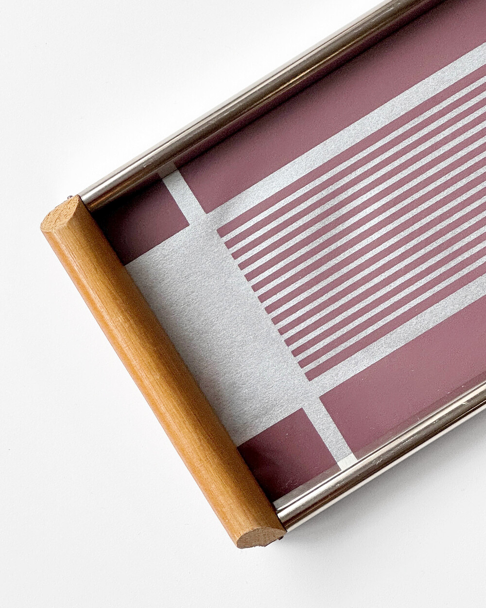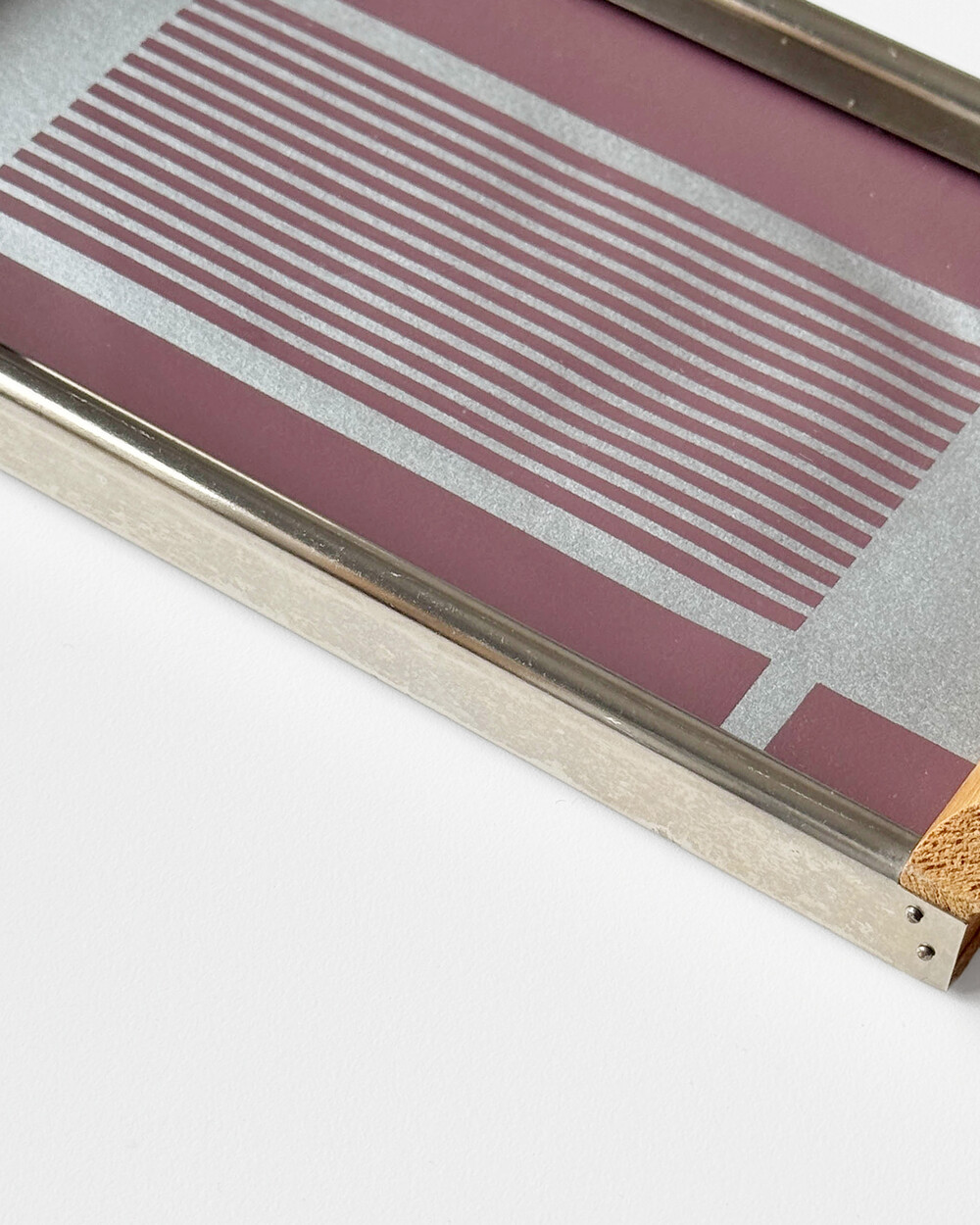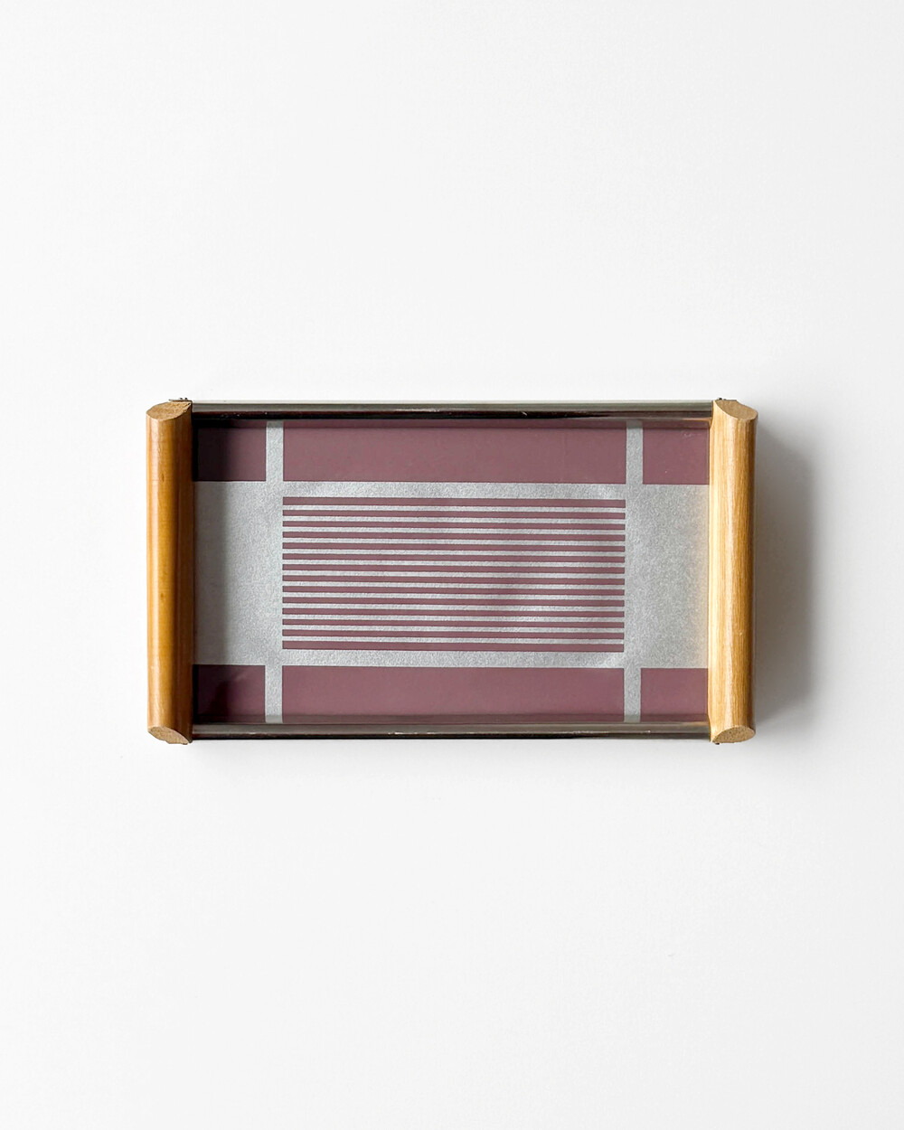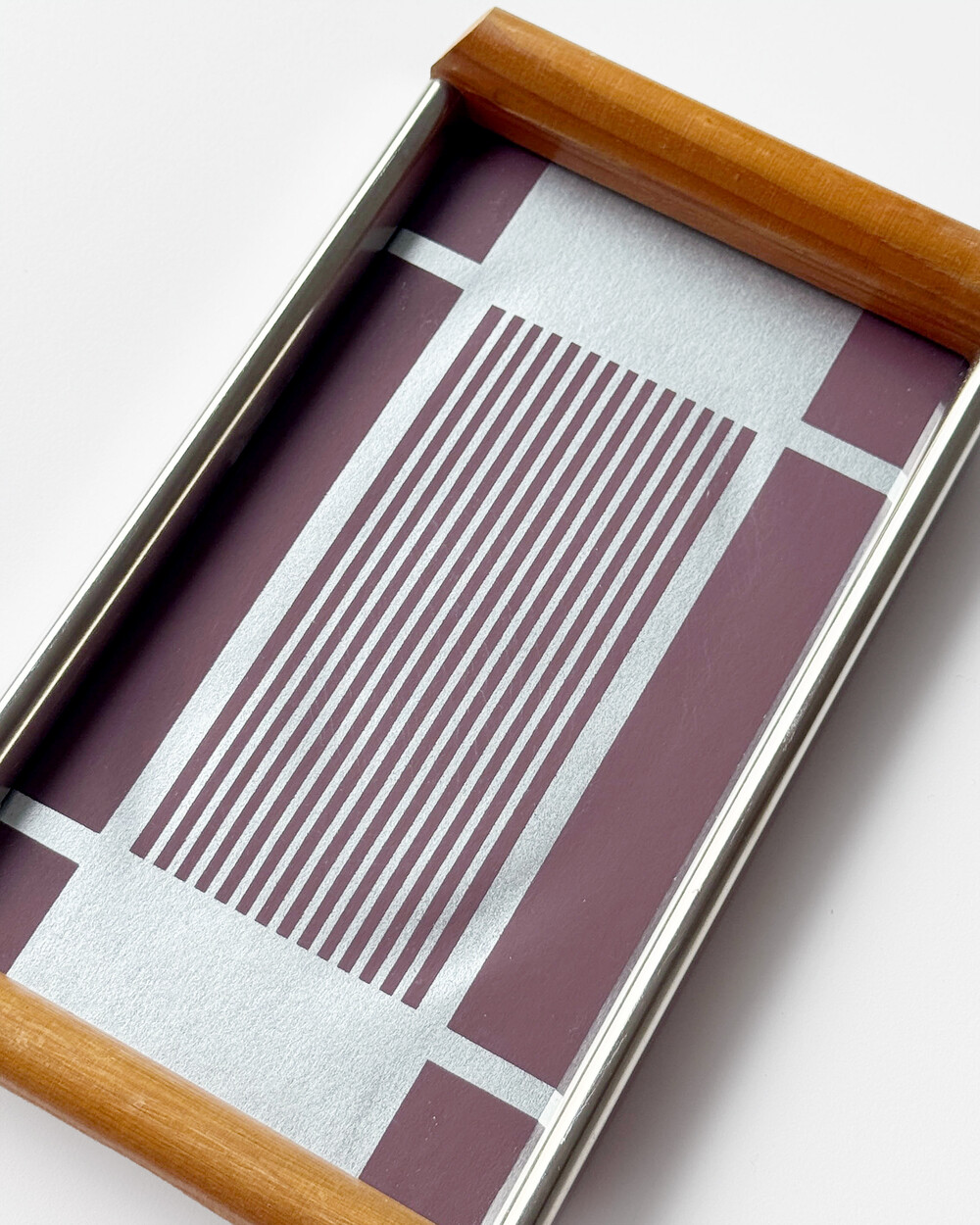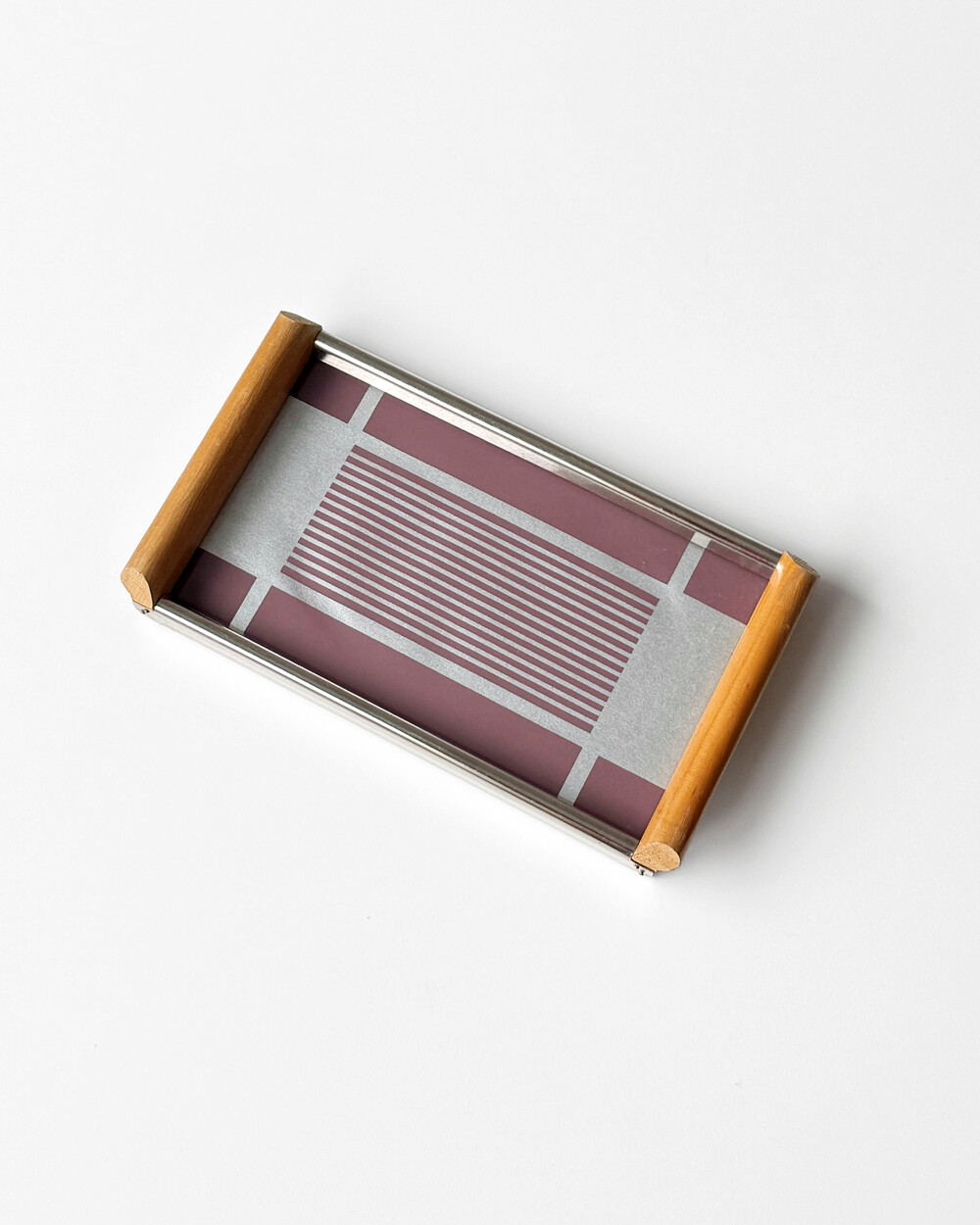 심플한 격자 패턴이 실크스크린 기법으로 장식된 서빙 트레이입니다. 1960년대 동독의 국영 가구 회사 VEB Bürstenwerke Schönheide에서 제작되었으며, 기능적인 구조와 절제된 장식성이 균형 있게 조화되어 있습니다.
