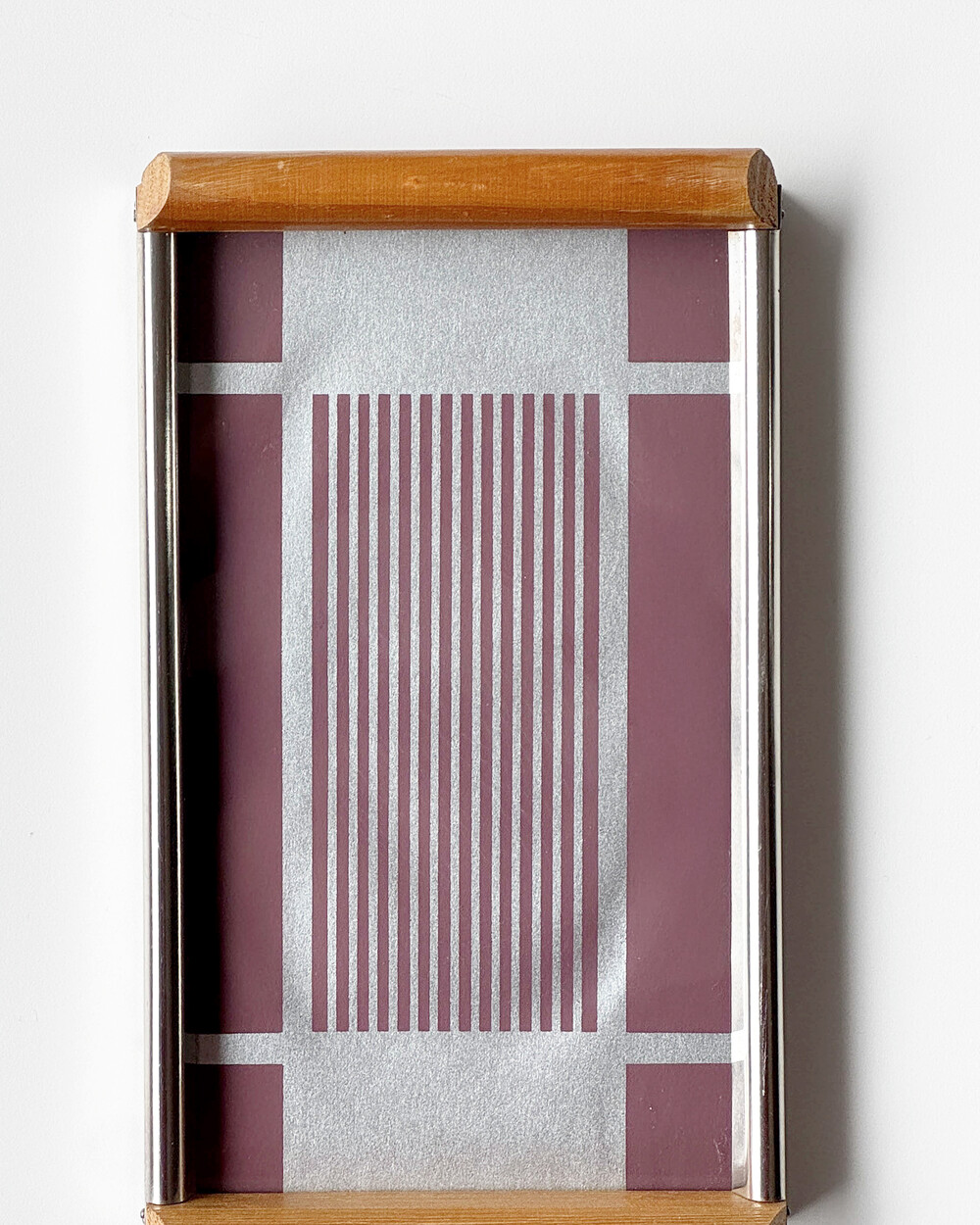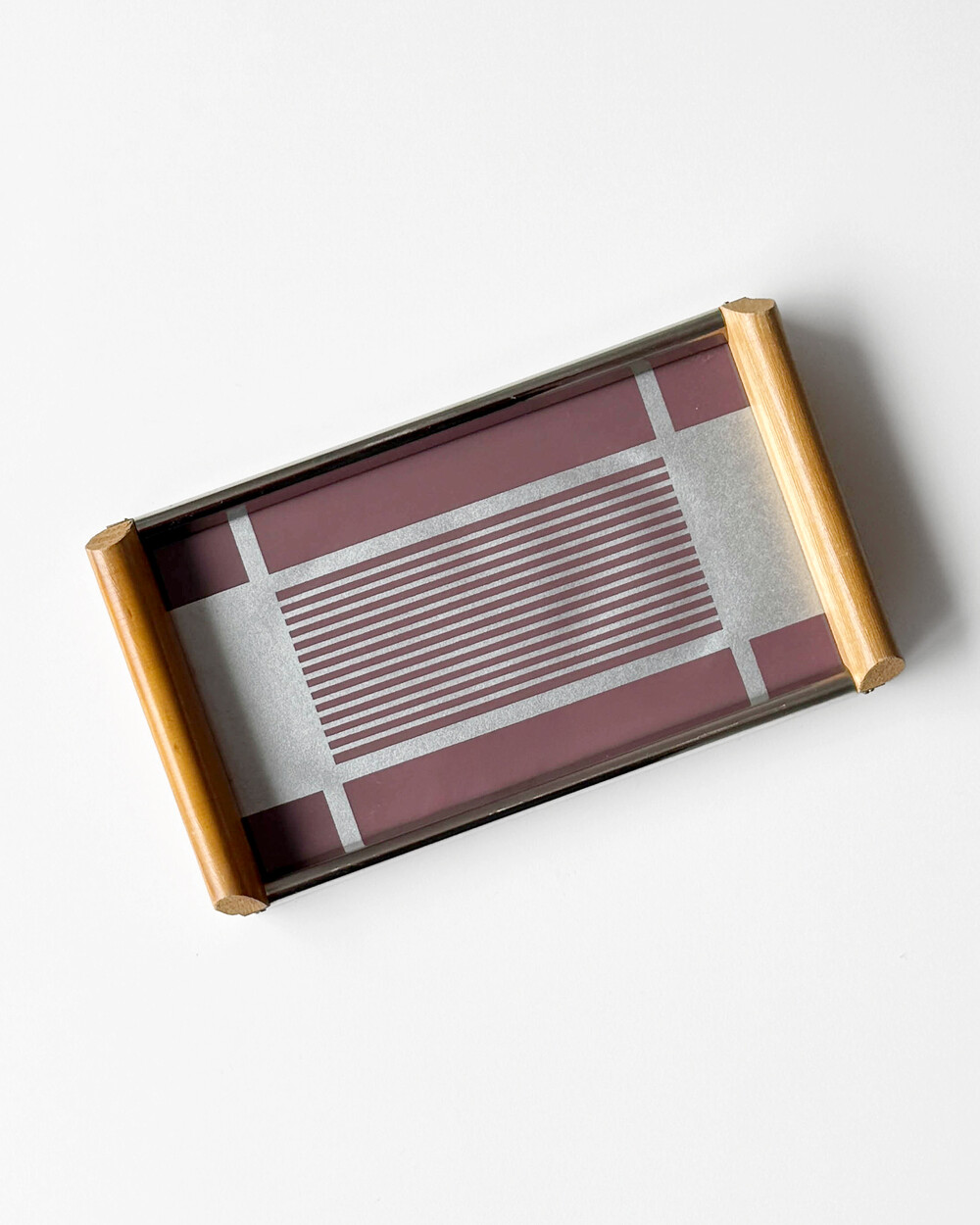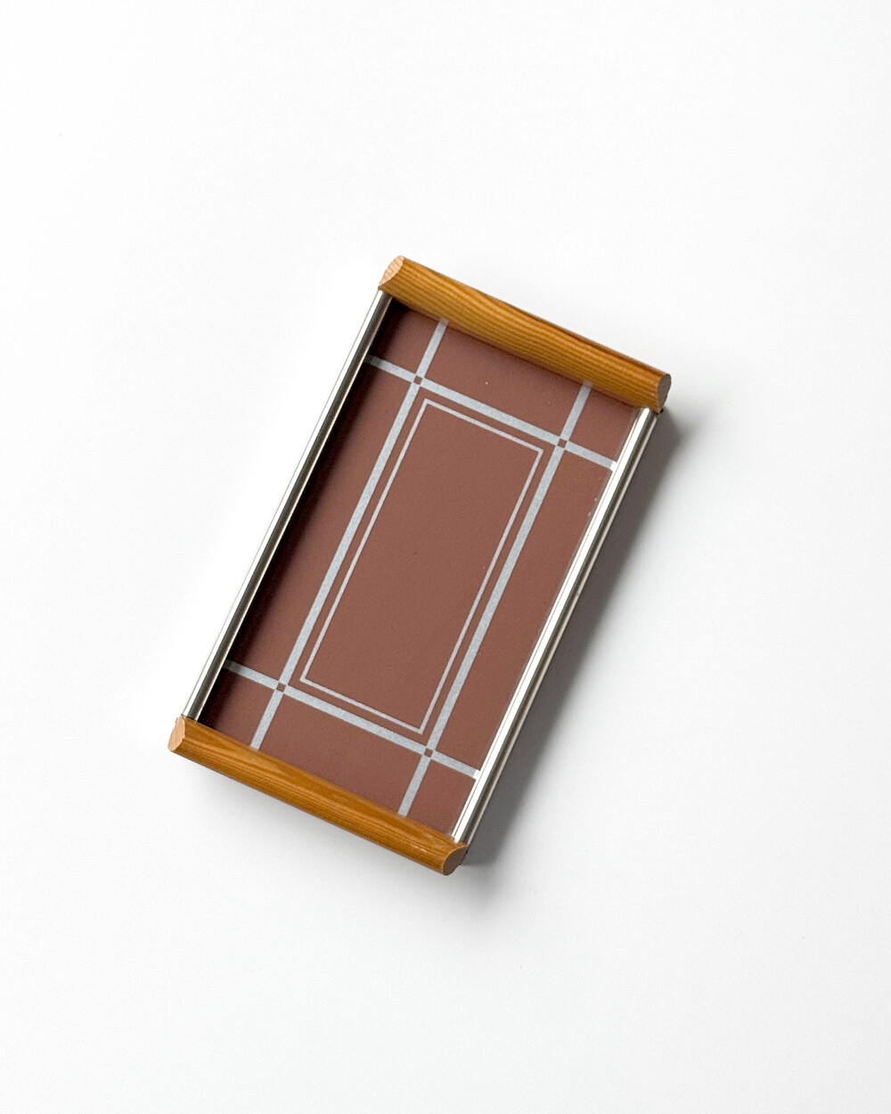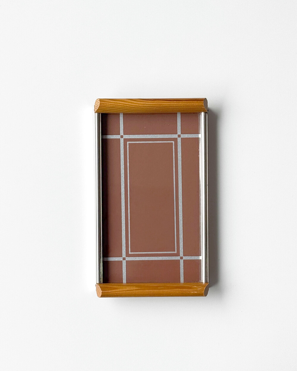 심플한 격자 패턴이 실크스크린 기법으로 장식된 서빙 트레이입니다. 1960년대 동독의 국영 가구 회사 VEB Bürstenwerke Schönheide에서 제작되었으며, 기능적인 구조와 절제된 장식성이 균형 있게 조화되어 있습니다.
