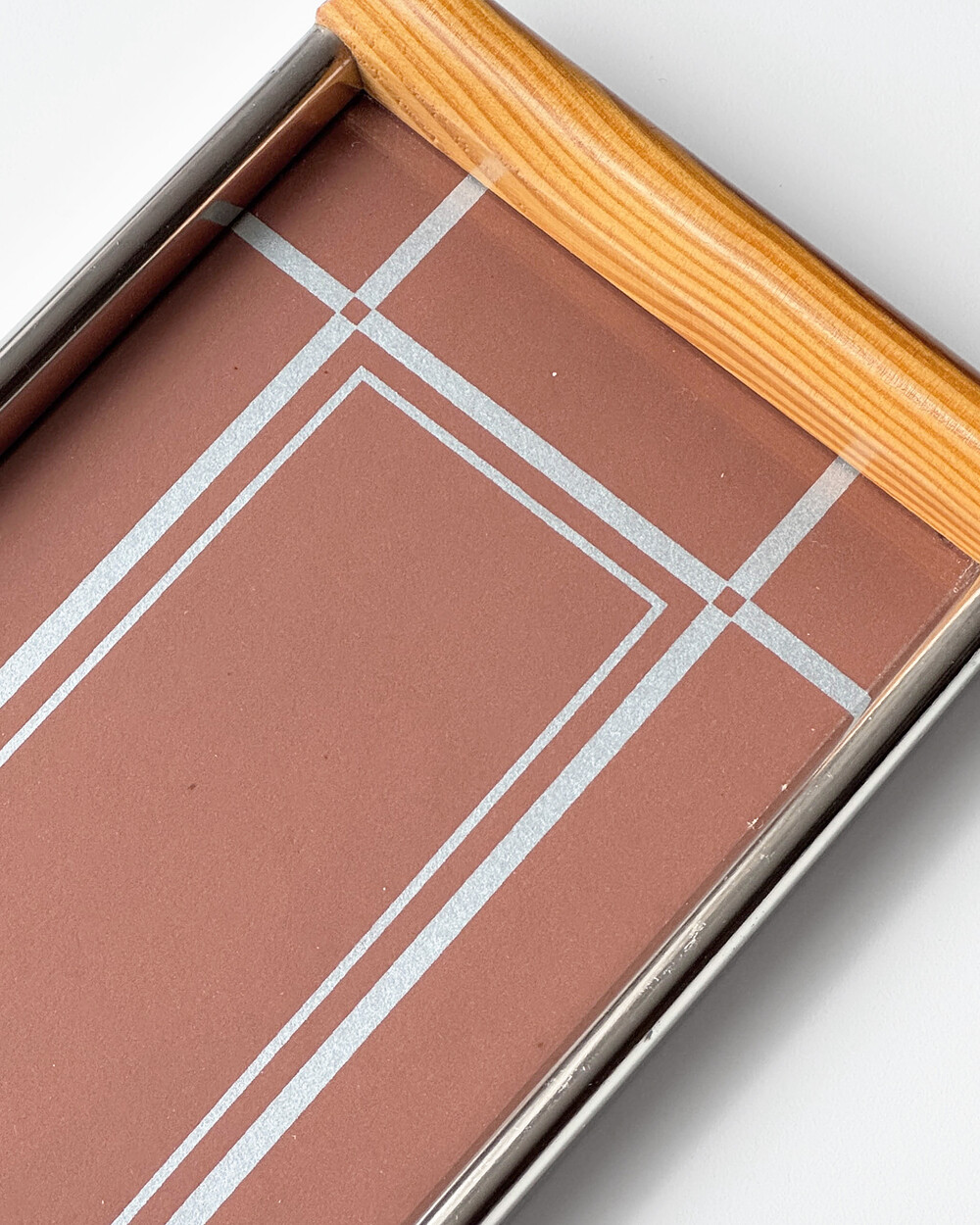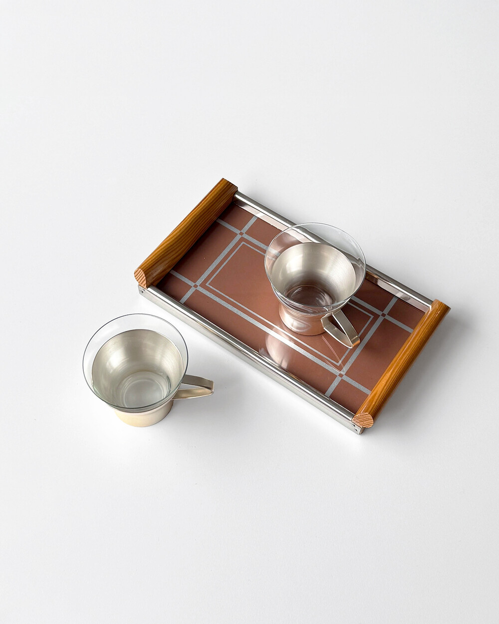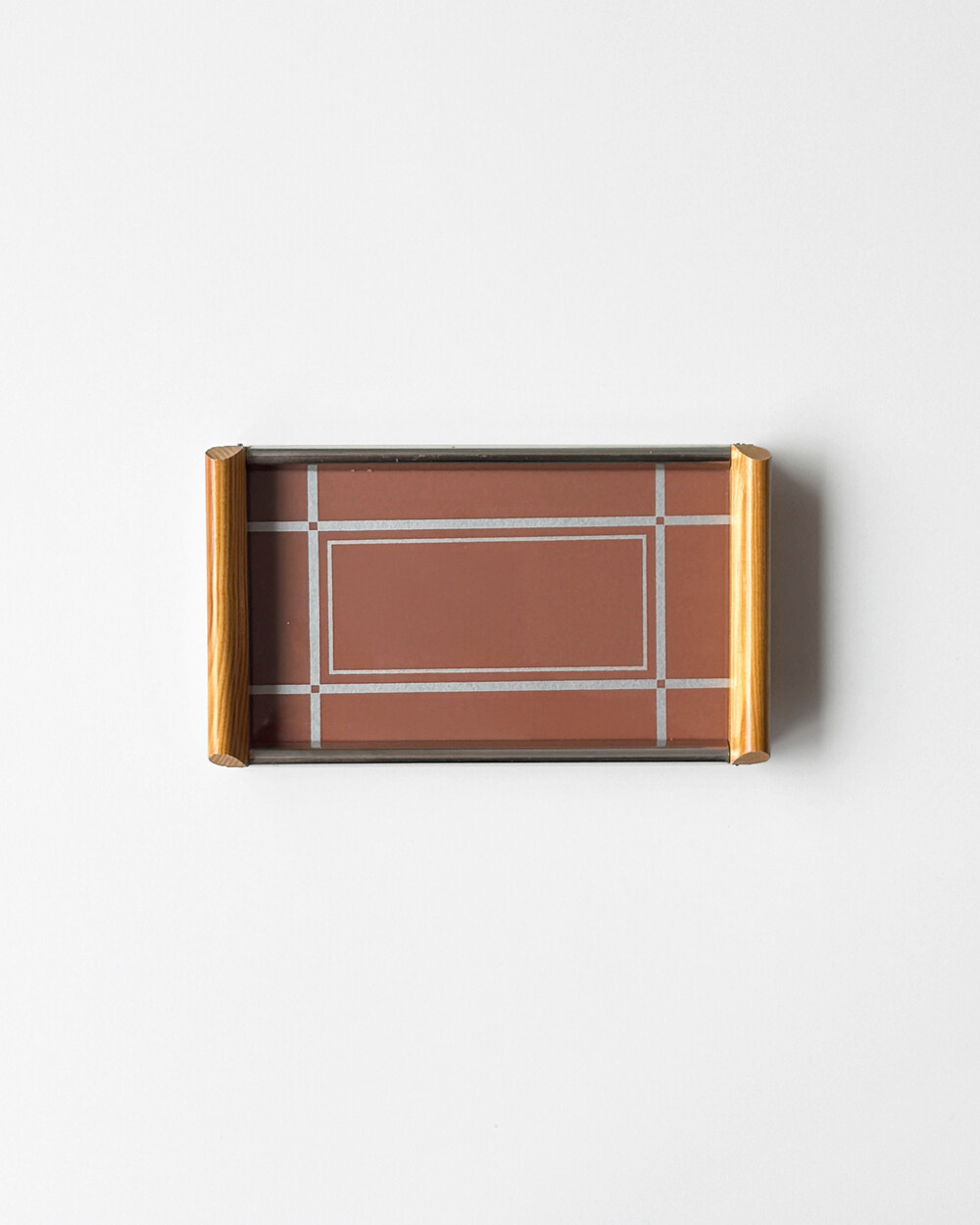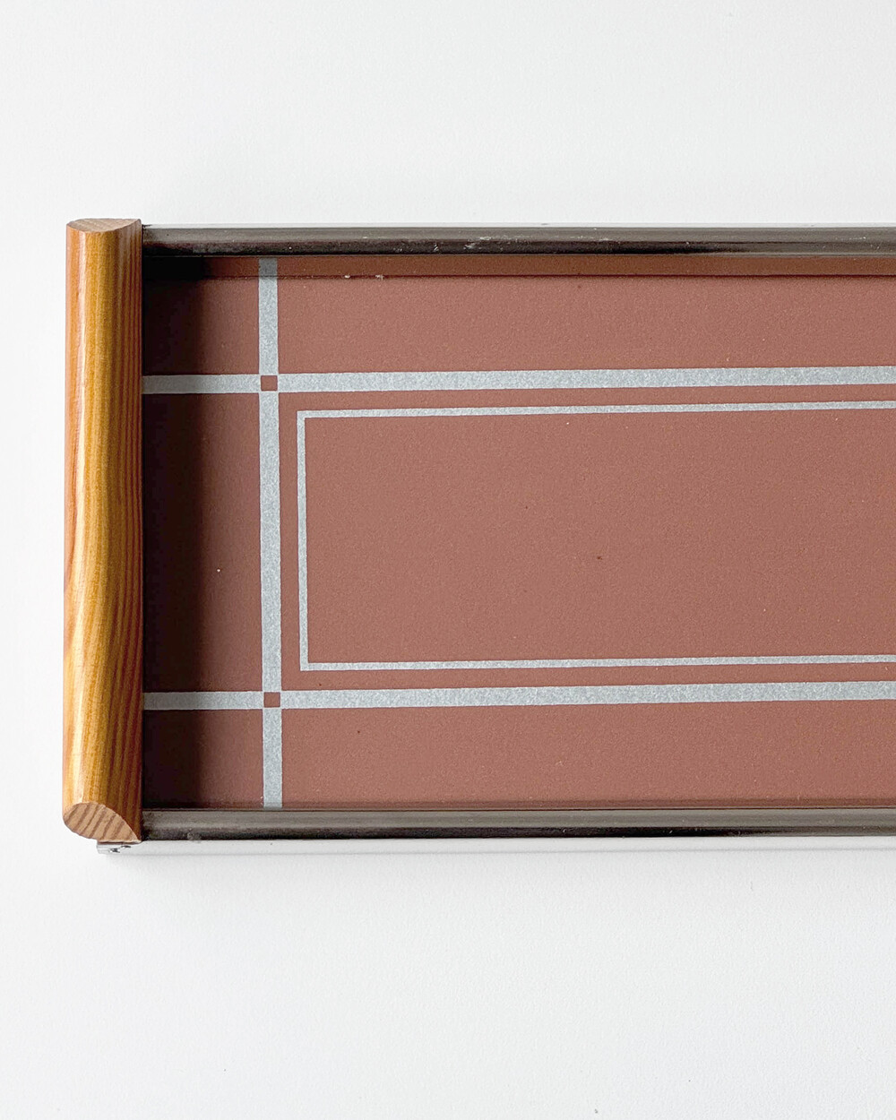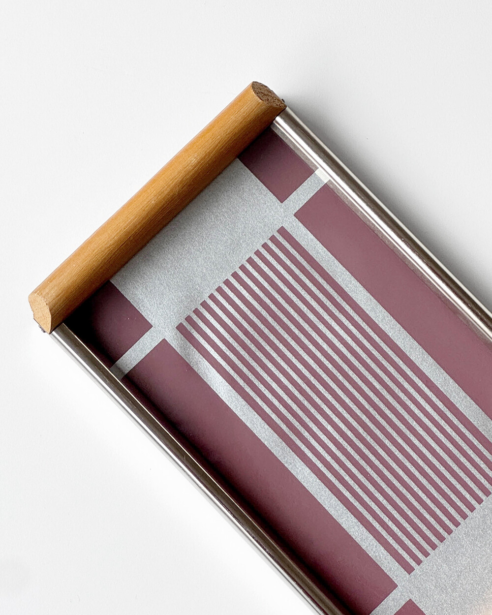 심플한 격자 패턴이 실크스크린 기법으로 장식된 서빙 트레이입니다. 1960년대 동독의 국영 가구 회사 VEB Bürstenwerke Schönheide에서 제작되었으며, 기능적인 구조와 절제된 장식성이 균형 있게 조화되어 있습니다.