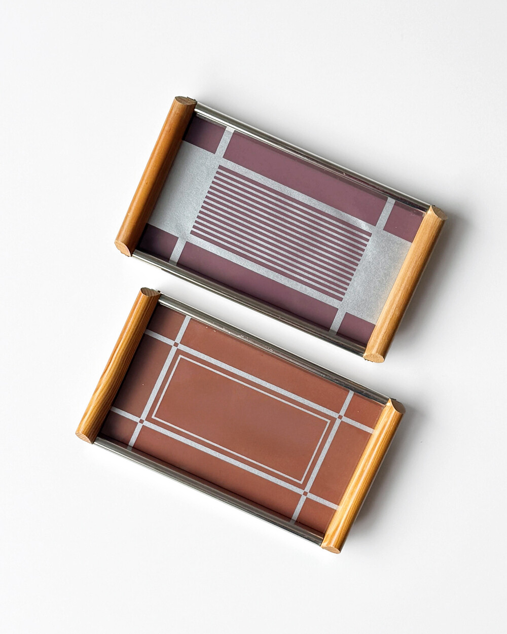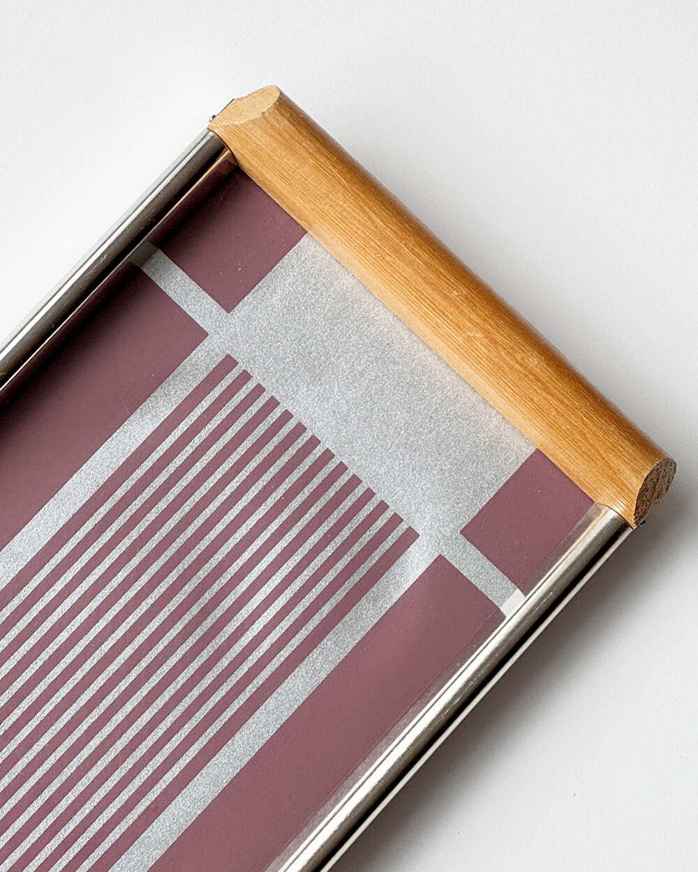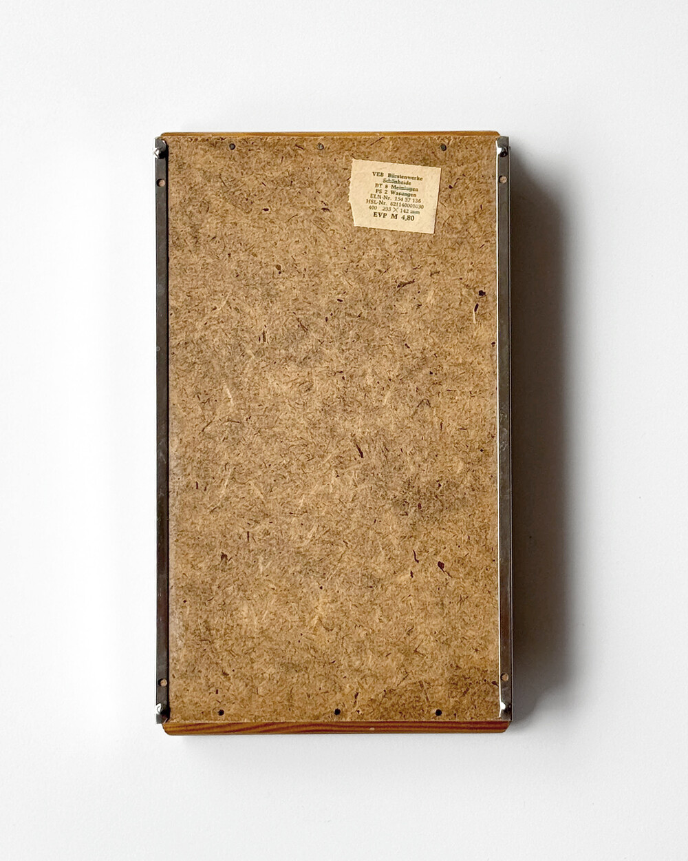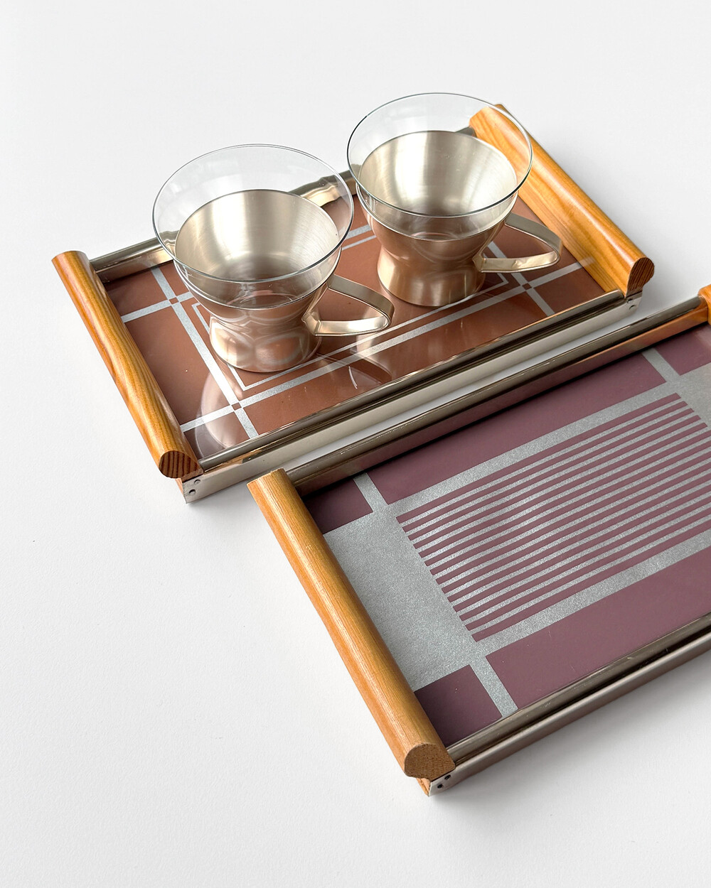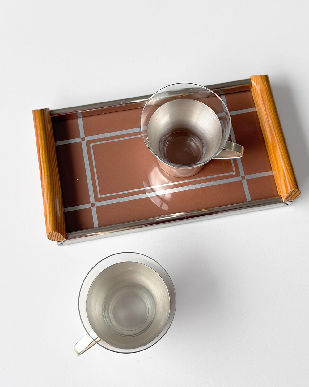 심플한 격자 패턴이 실크스크린 기법으로 장식된 서빙 트레이입니다. 1960년대 동독의 국영 가구 회사 VEB Bürstenwerke Schönheide에서 제작되었으며, 기능적인 구조와 절제된 장식성이 균형 있게 조화되어 있습니다.