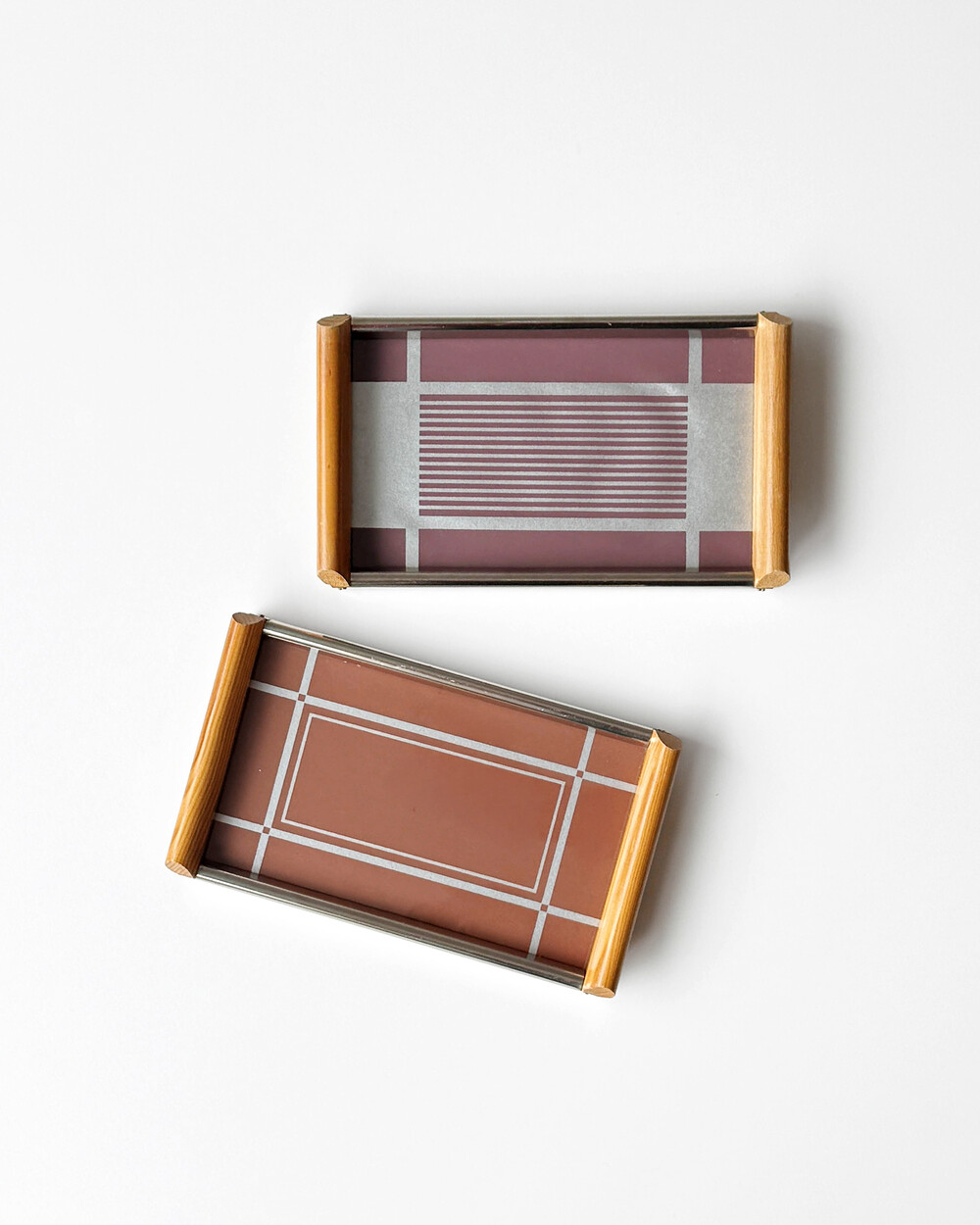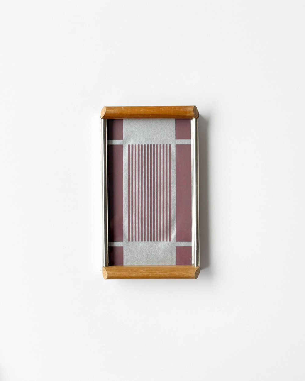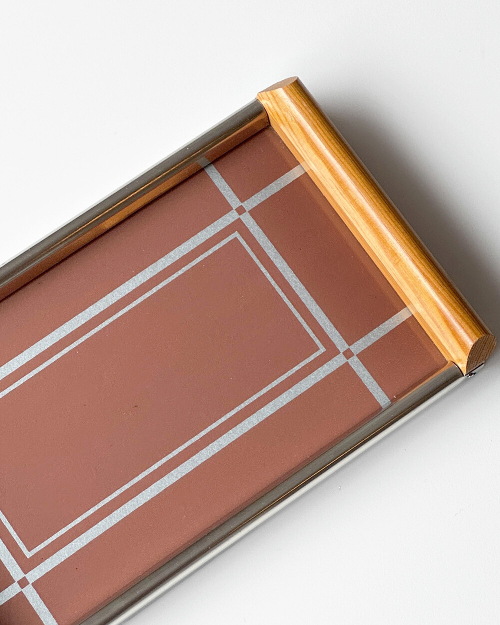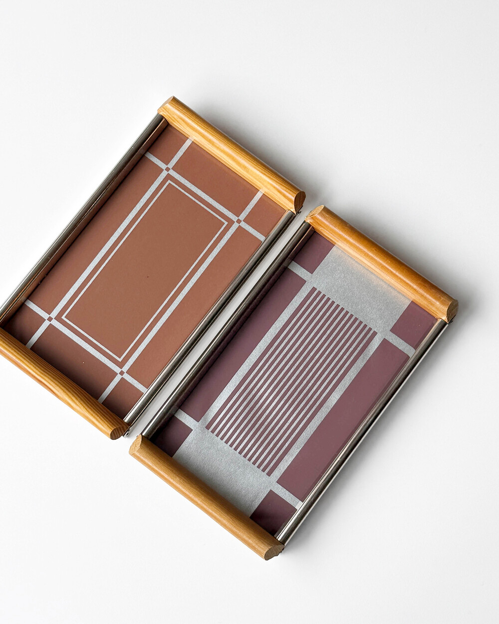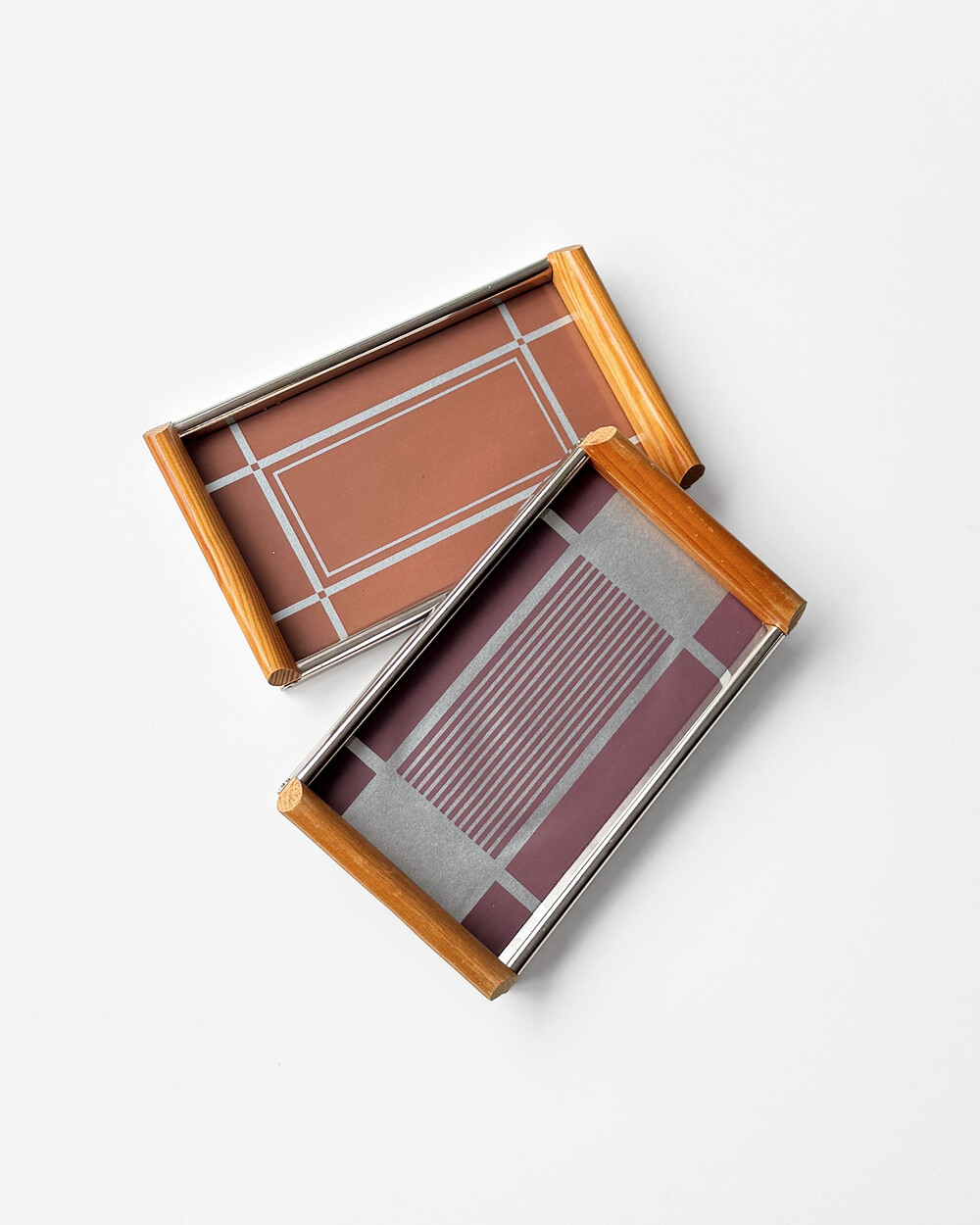 심플한 격자 패턴이 실크스크린 기법으로 장식된 서빙 트레이입니다. 1960년대 동독의 국영 가구 회사 VEB Bürstenwerke Schönheide에서 제작되었으며, 기능적인 구조와 절제된 장식성이 균형 있게 조화되어 있습니다.
