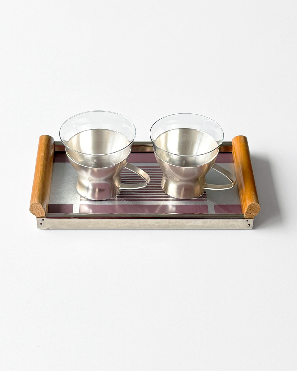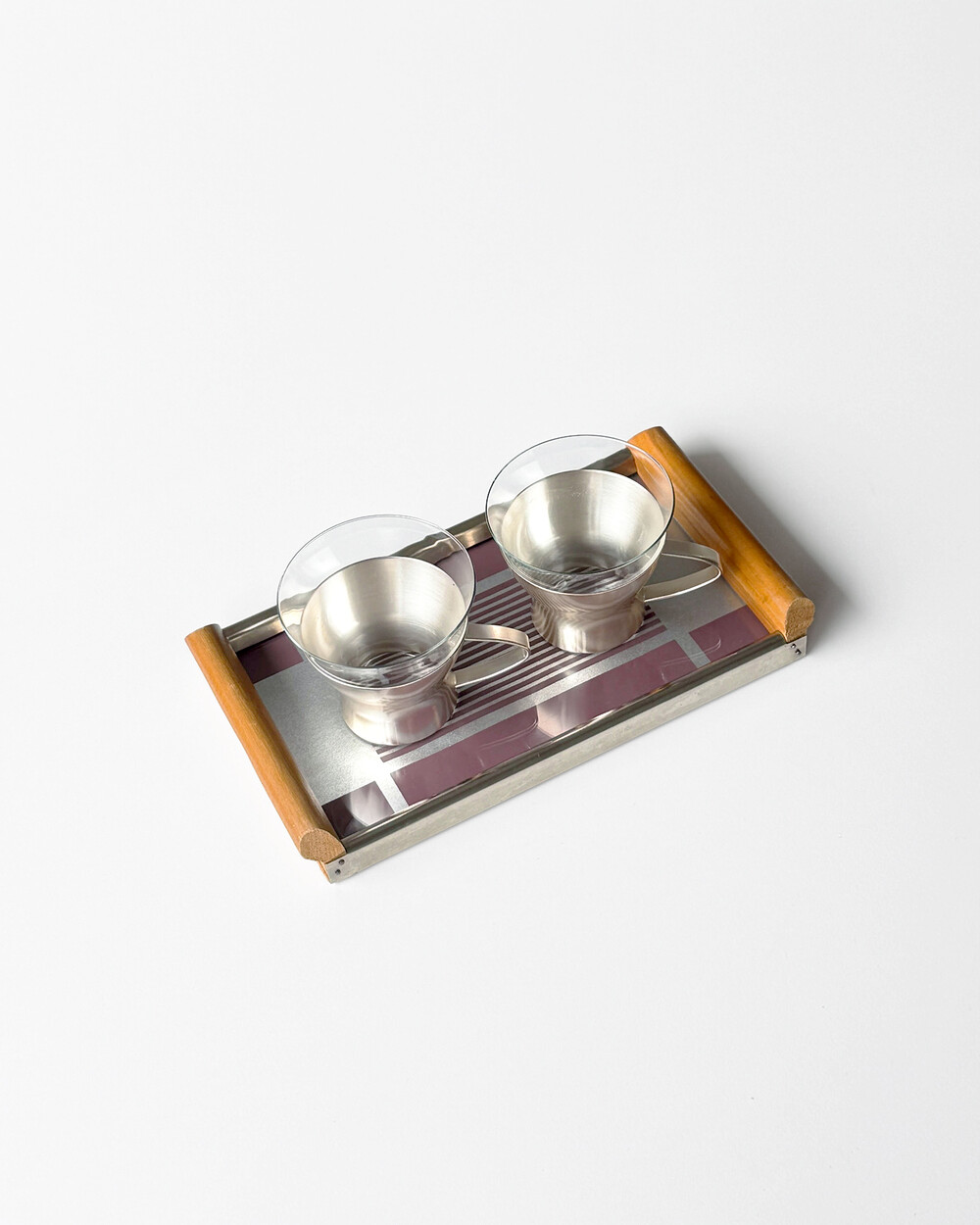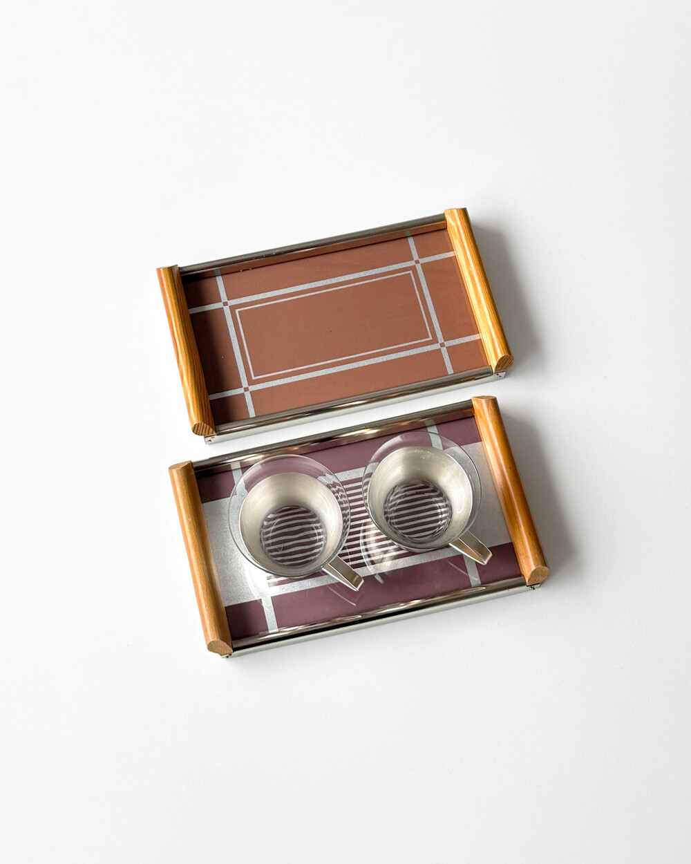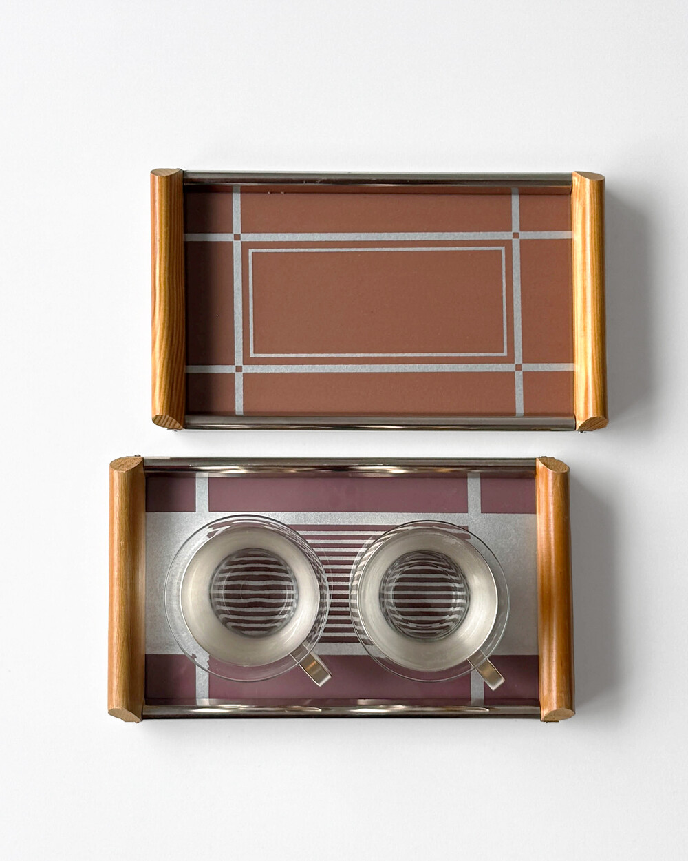 심플한 격자 패턴이 실크스크린 기법으로 장식된 서빙 트레이입니다. 1960년대 동독의 국영 가구 회사 VEB Bürstenwerke Schönheide에서 제작되었으며, 기능적인 구조와 절제된 장식성이 균형 있게 조화되어 있습니다.
