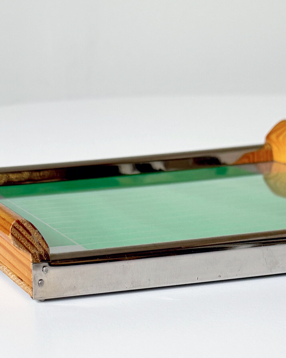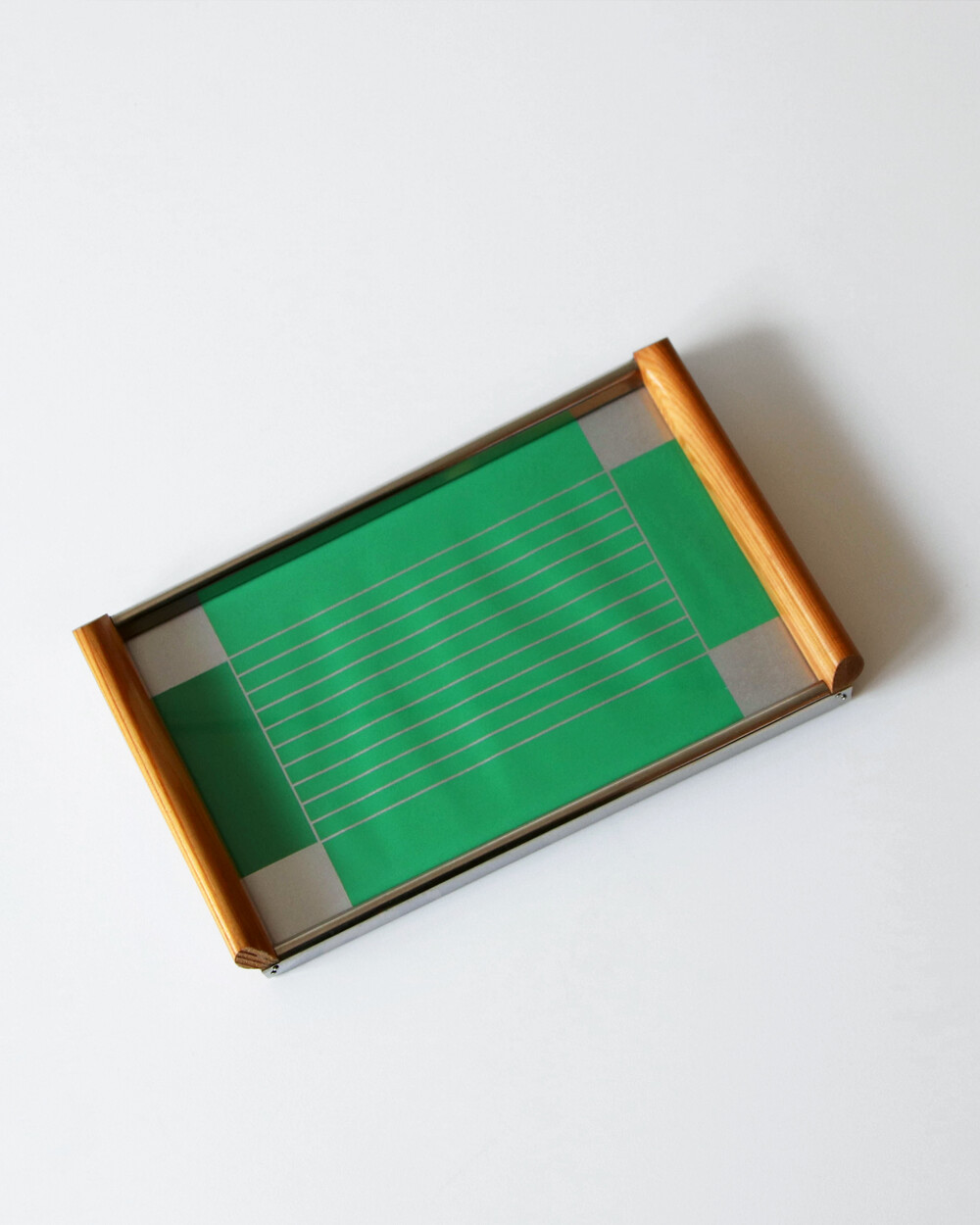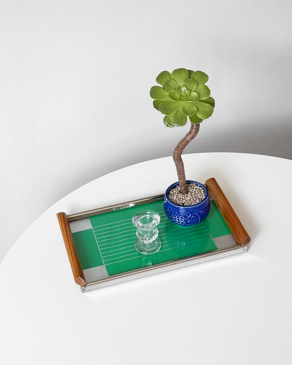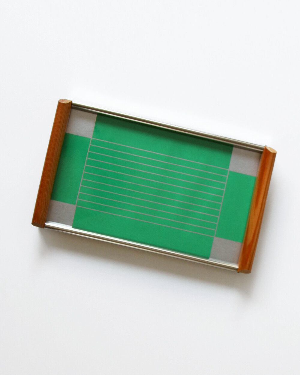 실버&그린 컬러에 심플한 라인 패턴이 포인트로 더해진 장식용 트레이로 1950~60년대 서독일(DDR)의 가구회사 Holzsieb BT Wasungen에서 제작 되었습니다.