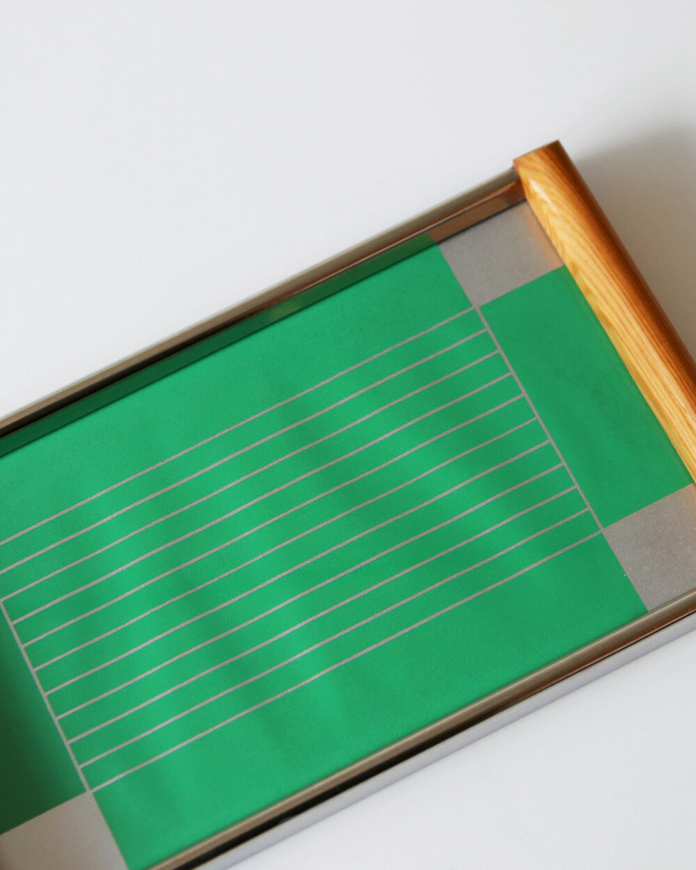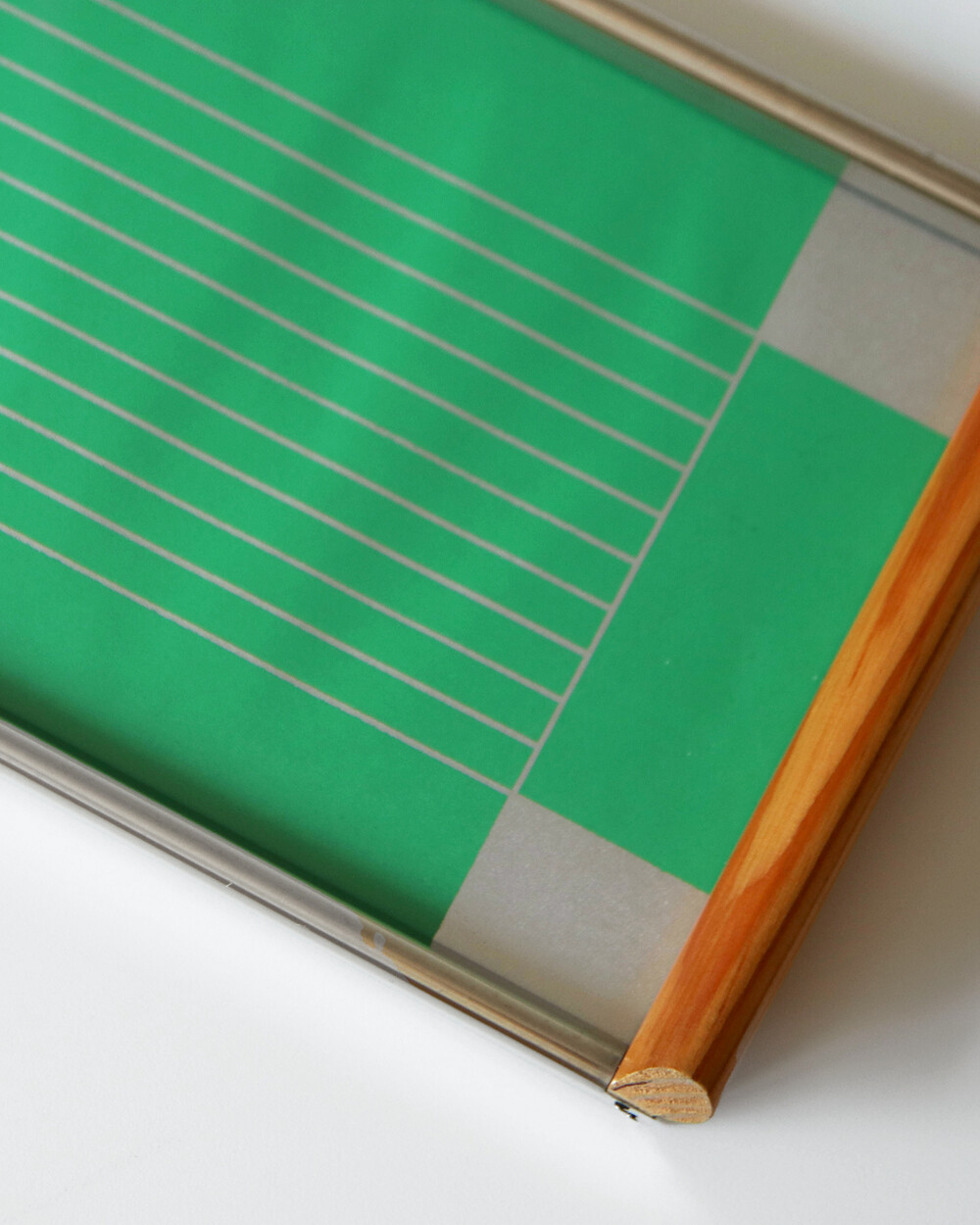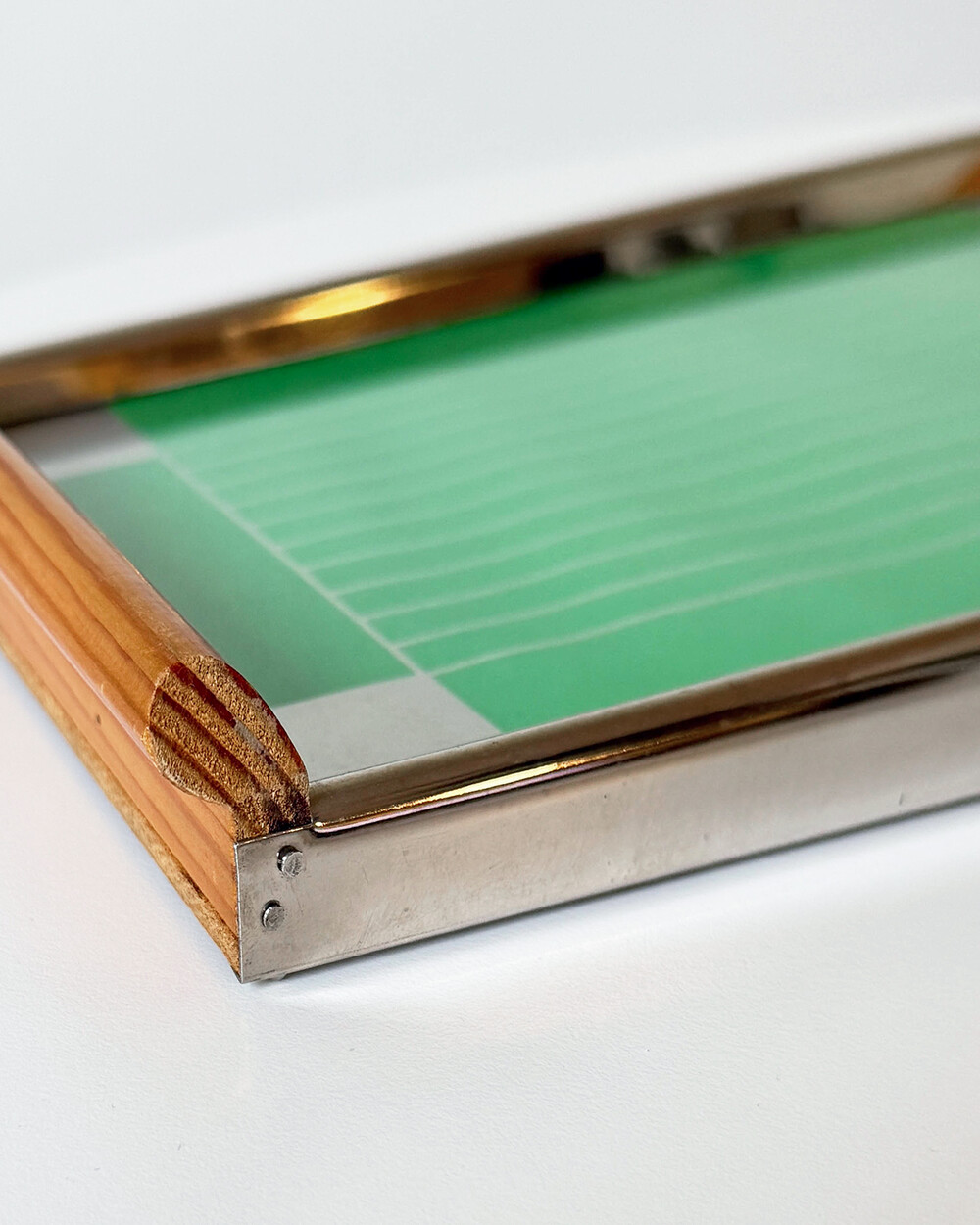 실버&그린 컬러에 심플한 라인 패턴이 포인트로 더해진 장식용 트레이로 1950~60년대 서독일(DDR)의 가구회사 Holzsieb BT Wasungen에서 제작 되었습니다.
