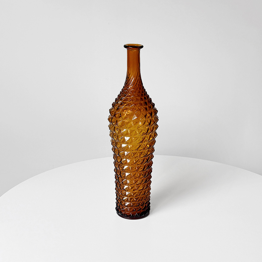 다이아몬드 컷 패턴이 장식된 Genie Bottle 형태의 브라운 글라스 카라프로, 1960년대 이탈리아 Empoli 지역에서 제작되었습니다. 몰드 프레스 기법으로 완성된 두꺼운 글라스 표면은 입체적인 텍스처를 지니며, 빛의 각도에 따라 깊이 있는 반짝임을 드러냅니다.
