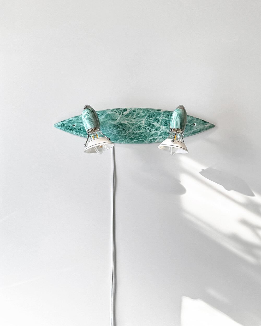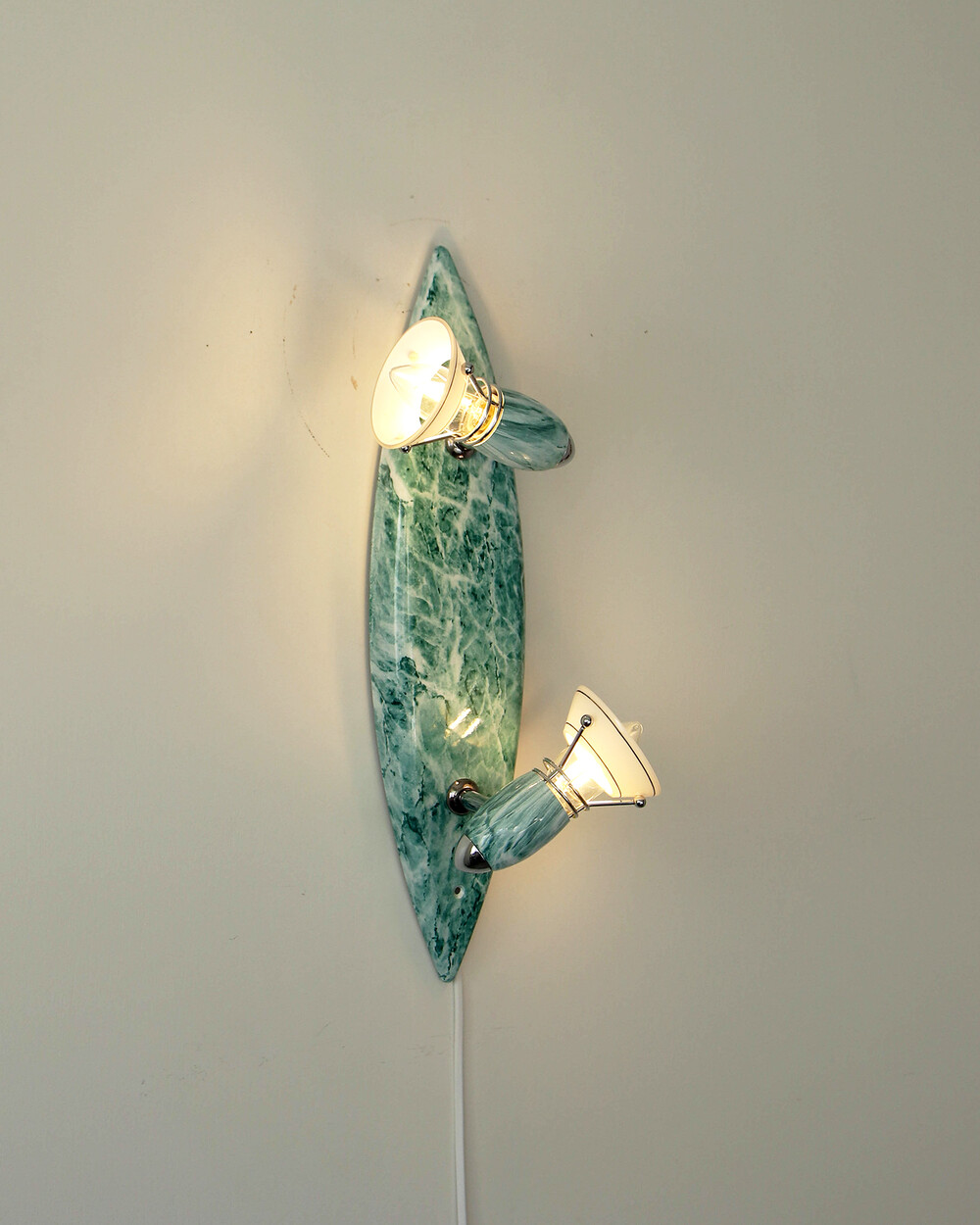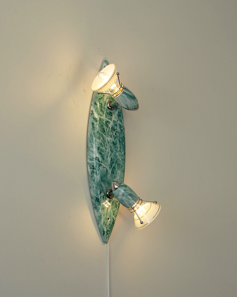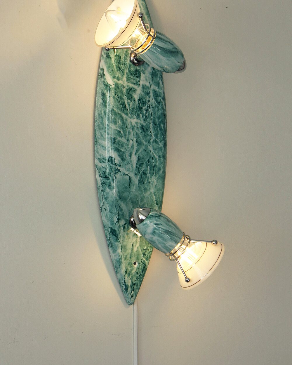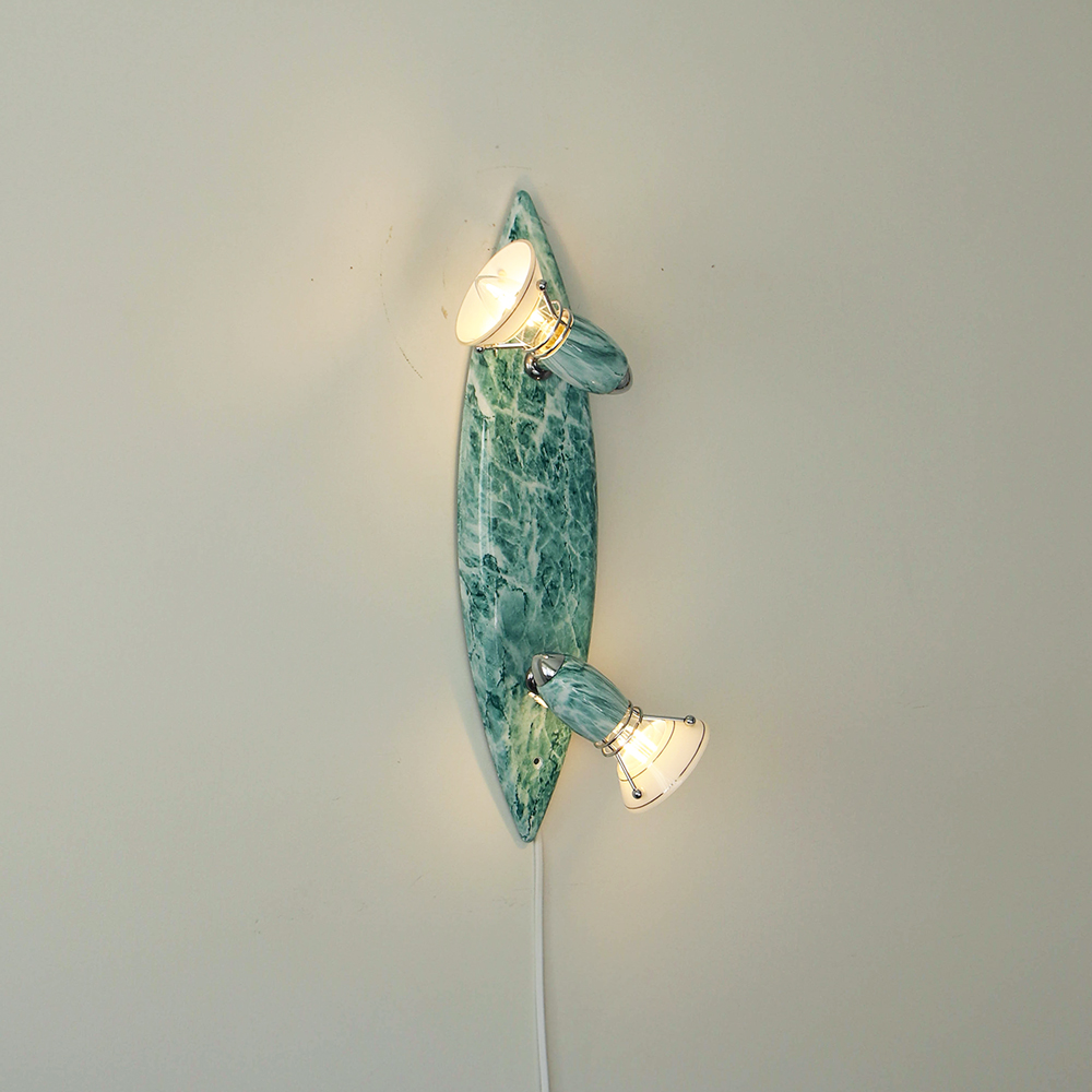 물결처럼 흐르는 푸른색 마블 패턴이 장식된 메탈 조명입니다.1980–90년대 독일 조명 브랜드 Variant에서 제작된 제품으로, 기능적인 면이 강조된 디자인에 과감한 컬러와 실험적인 패턴이 더해진 것이 특징입니다. 천장과 벽 겸용으로 설치할 수 있으며, 양쪽의 라이트는 각각 각도 조절이 가능해 벽면을 강조하는 간접 조명부터 집중 조명까지 연출할 수 있습니다.