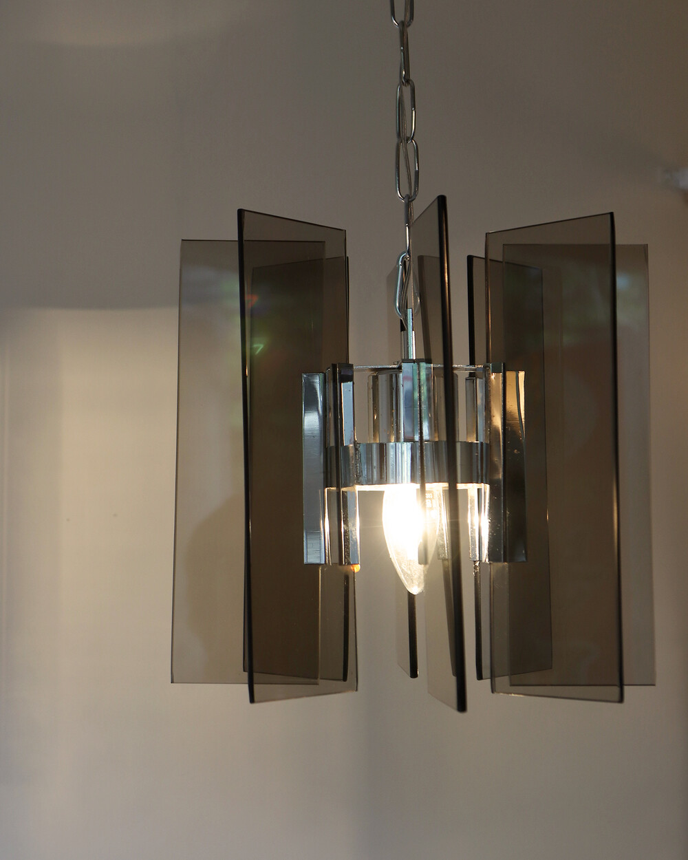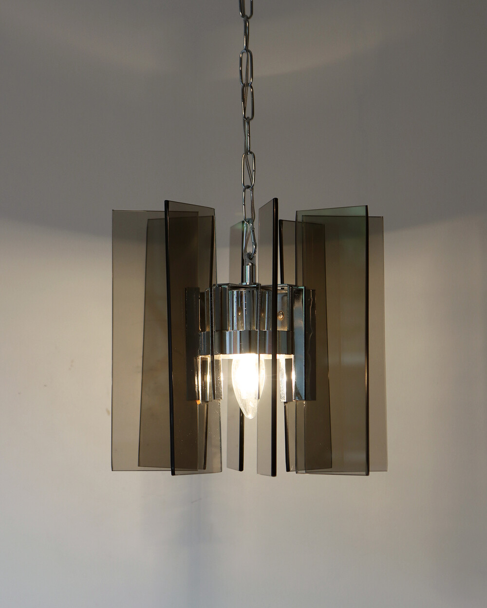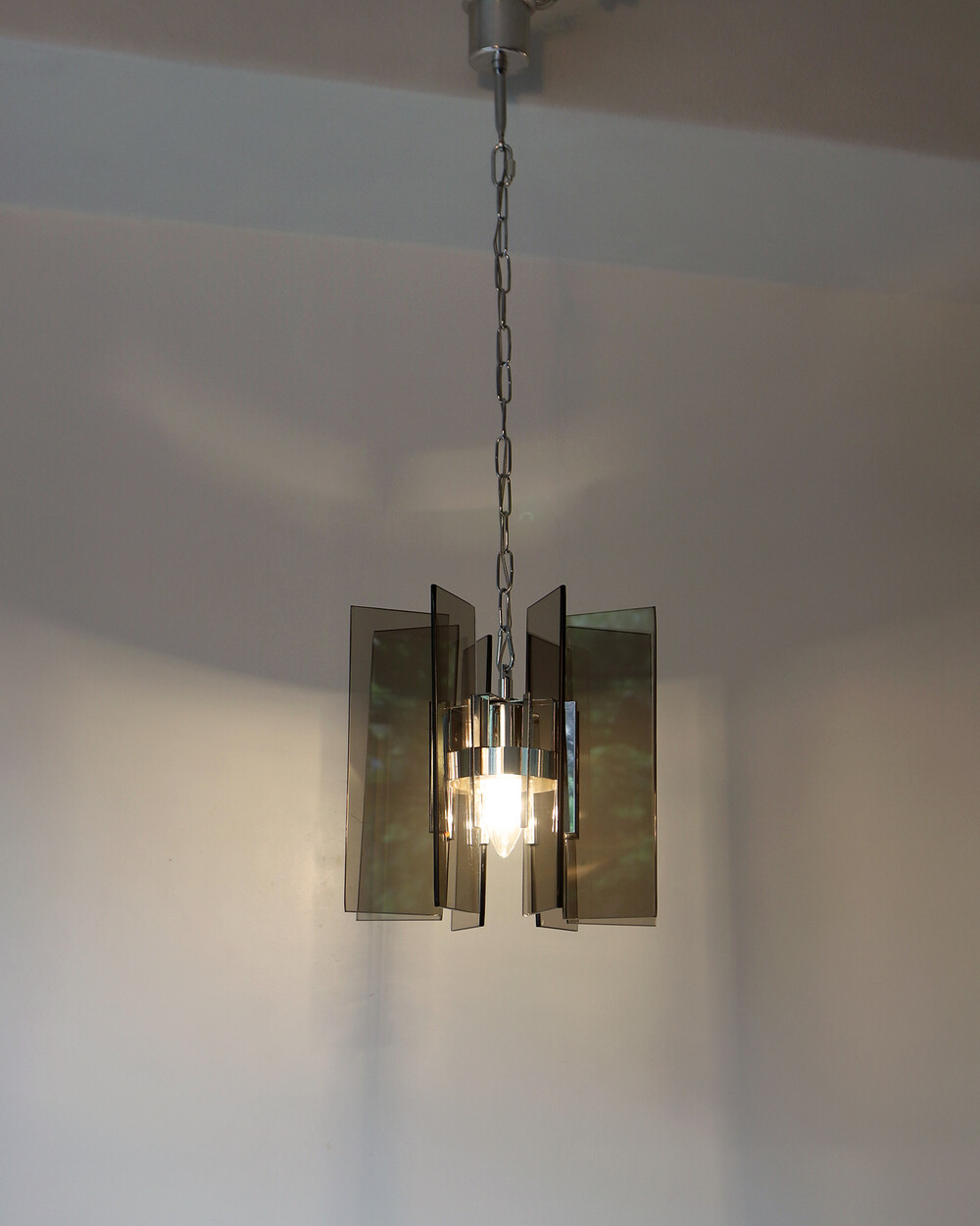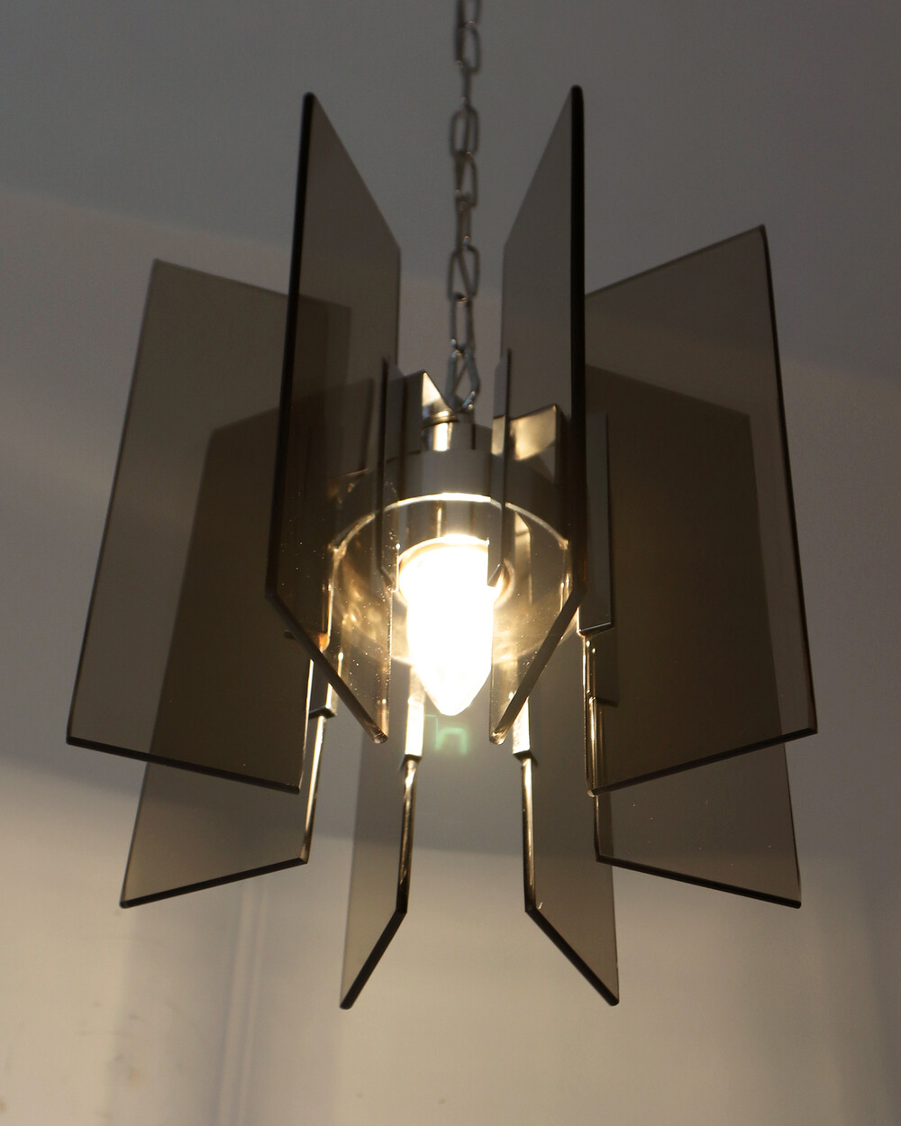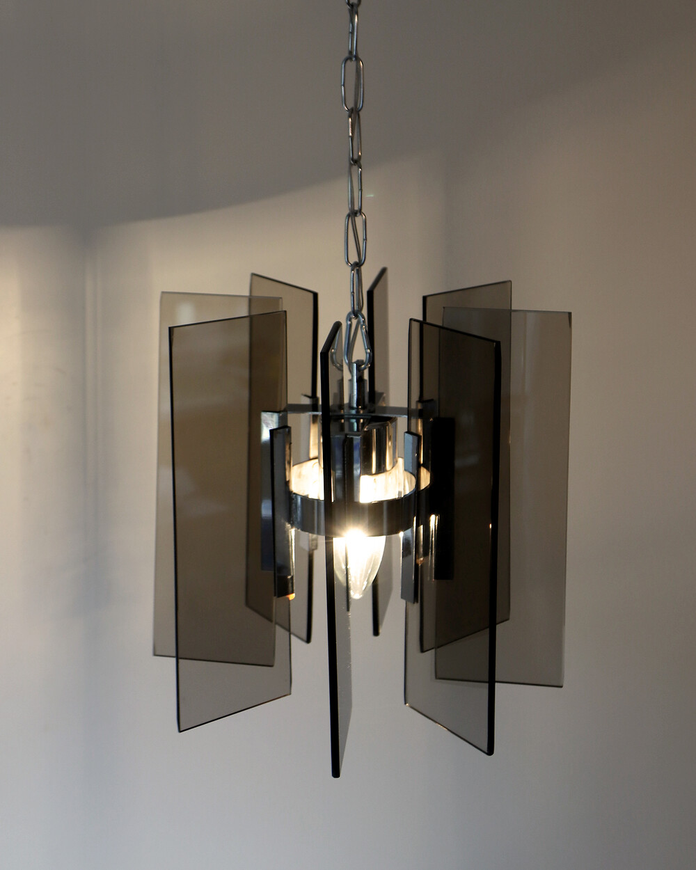 투명한 스모크 글라스와 크롬 메탈이 조화를 이루는 펜던트 조명으로, 1960년대 이탈리아에서 만들어졌습니다. 입체적인 조형과 모던한 실루엣이 시선을 끌며, 점등 시 유리 패널에 반사되는 빛이 특히 아름답게 퍼집니다.