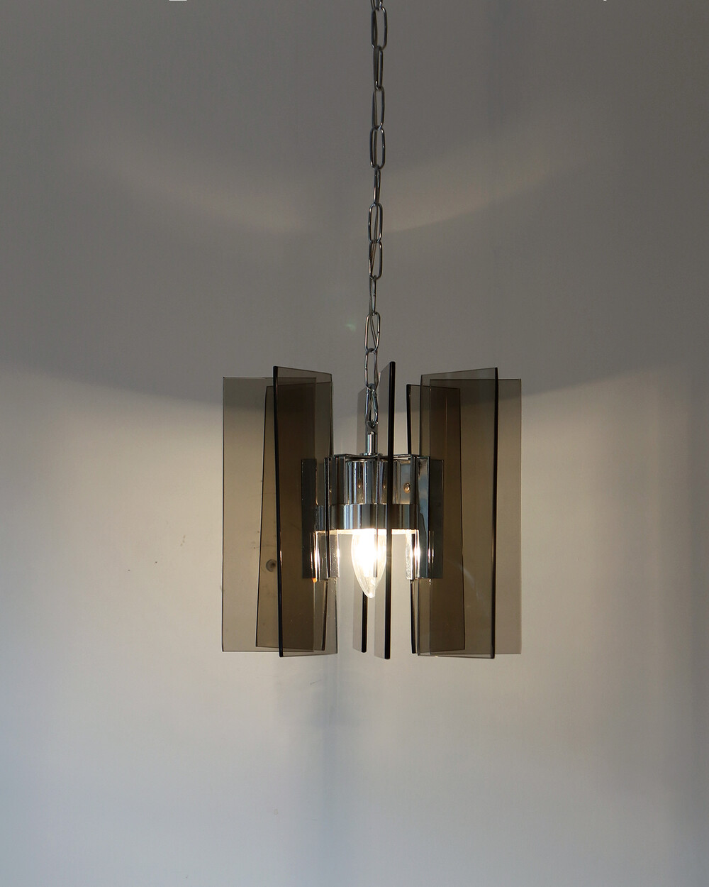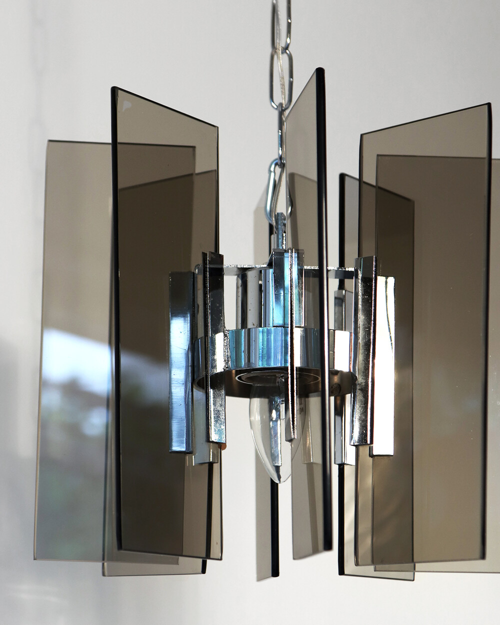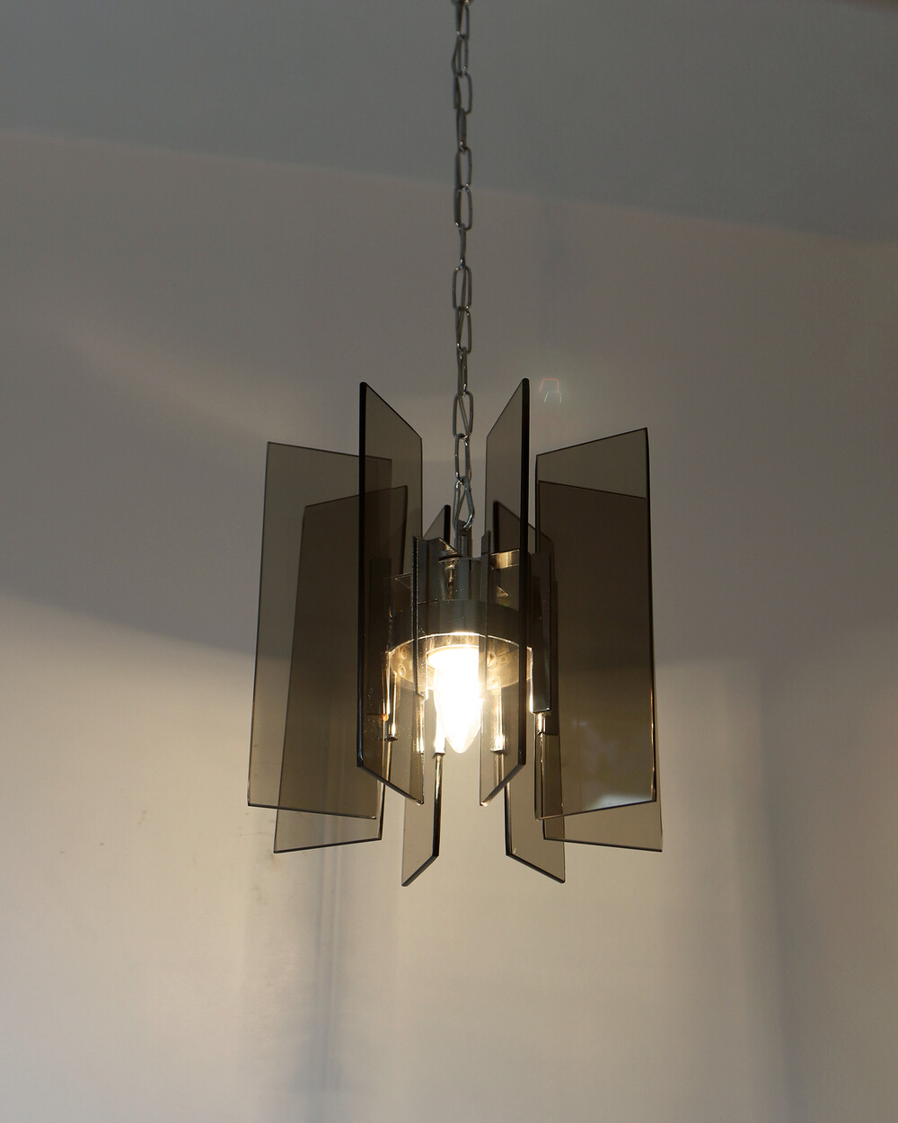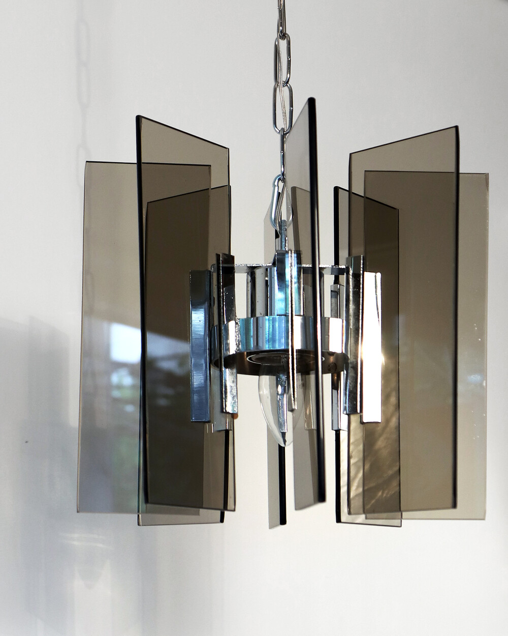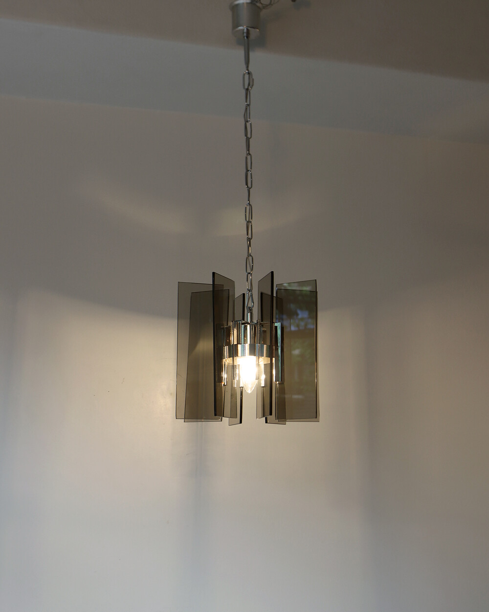 투명한 스모크 글라스와 크롬 메탈이 조화를 이루는 펜던트 조명으로, 1960년대 이탈리아에서 만들어졌습니다. 입체적인 조형과 모던한 실루엣이 시선을 끌며, 점등 시 유리 패널에 반사되는 빛이 특히 아름답게 퍼집니다.