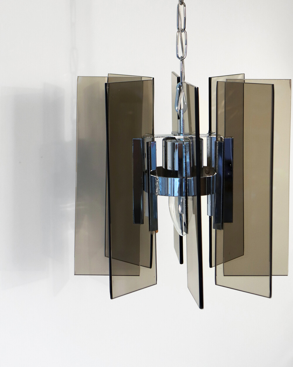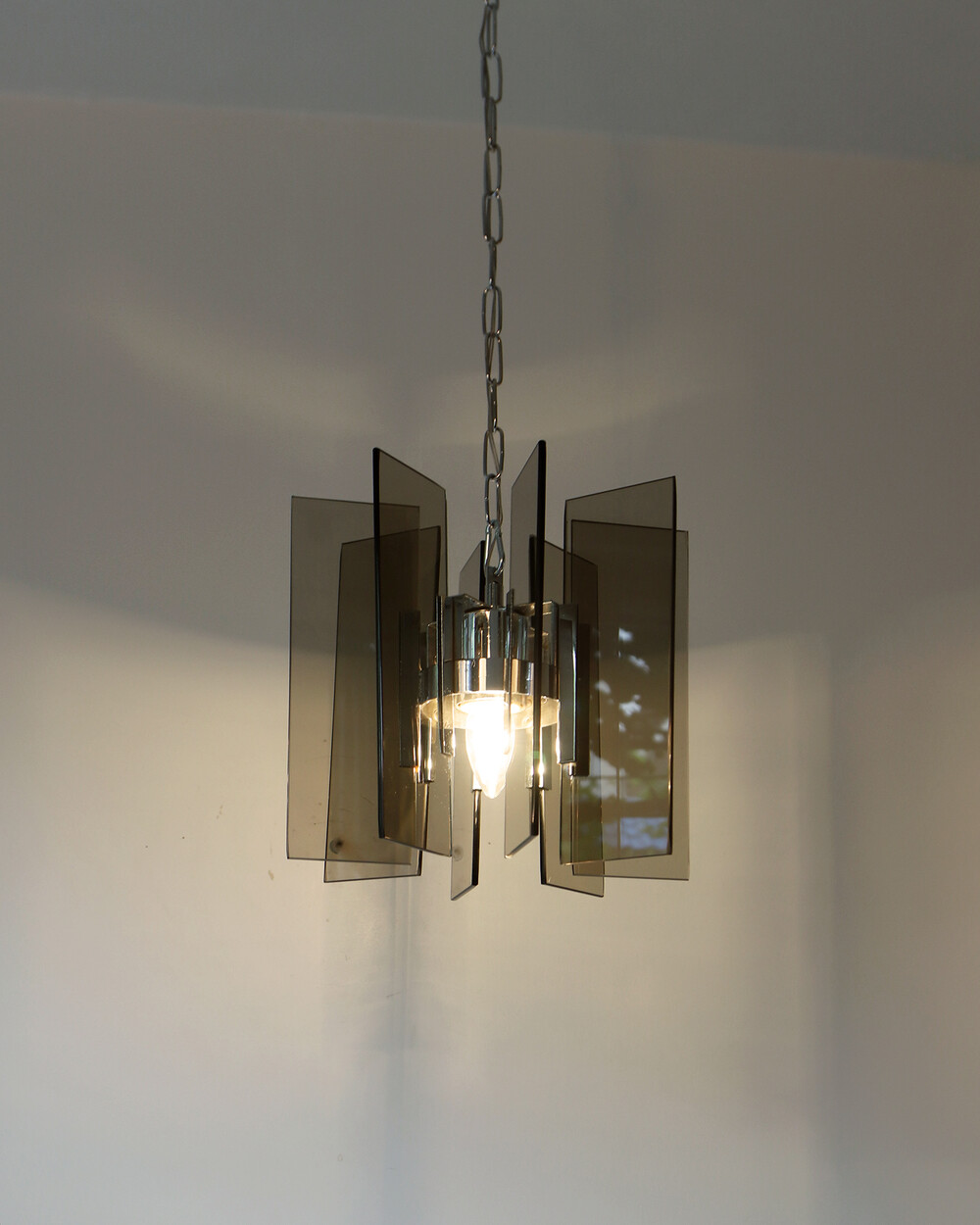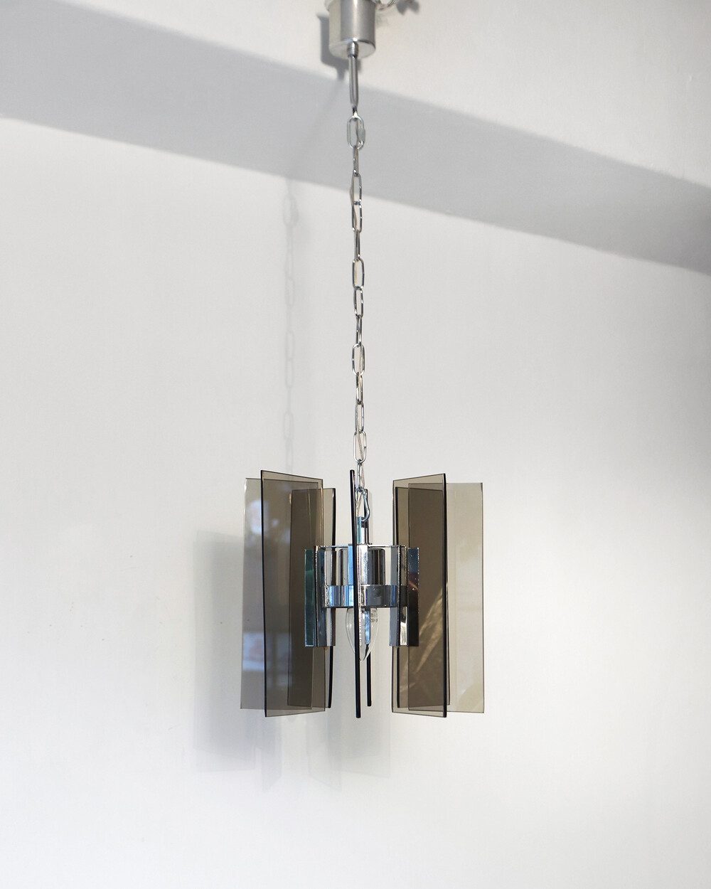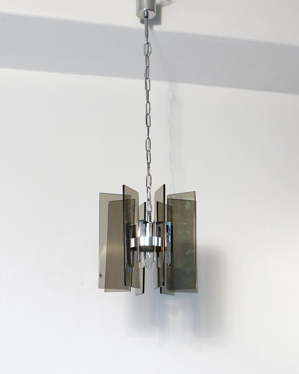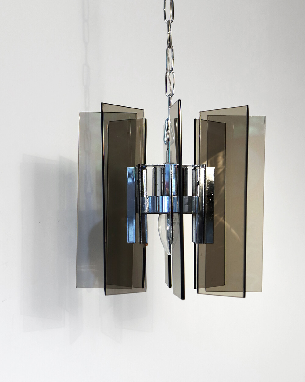 투명한 스모크 글라스와 크롬 메탈이 조화를 이루는 펜던트 조명으로, 1960년대 이탈리아에서 만들어졌습니다. 입체적인 조형과 모던한 실루엣이 시선을 끌며, 점등 시 유리 패널에 반사되는 빛이 특히 아름답게 퍼집니다.