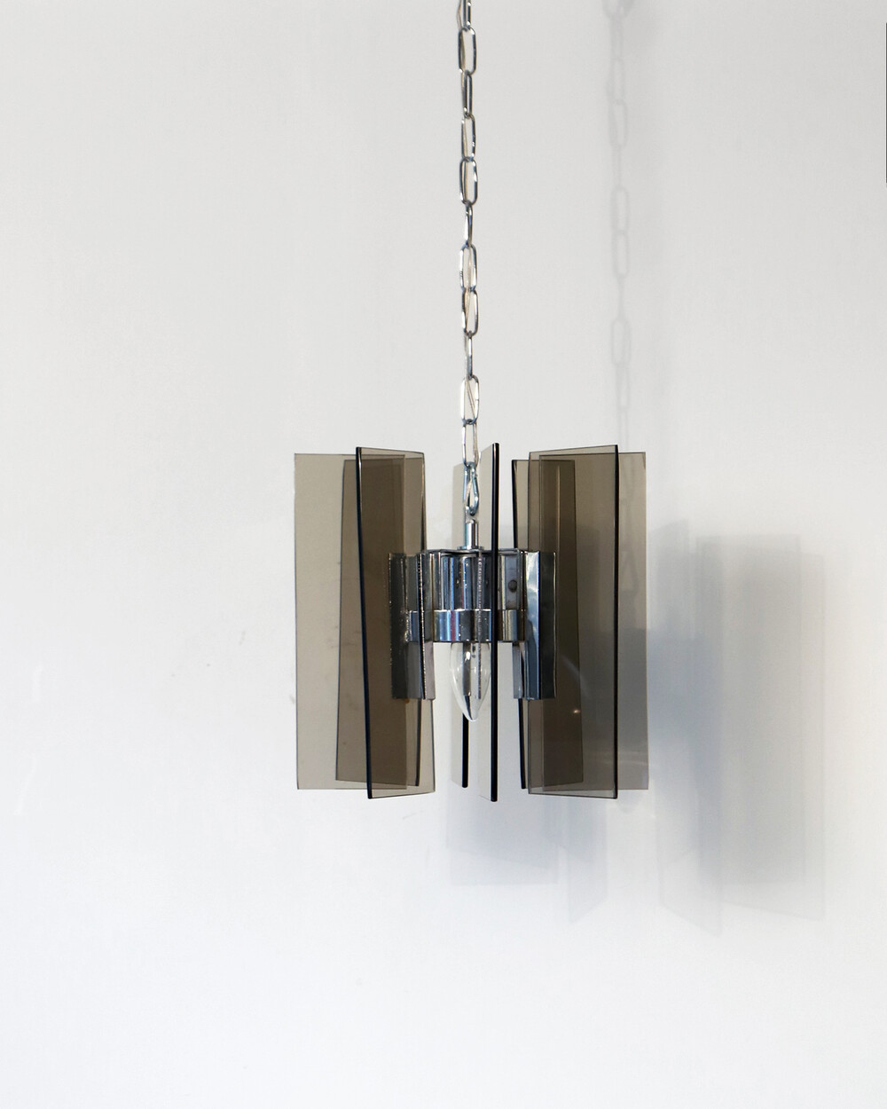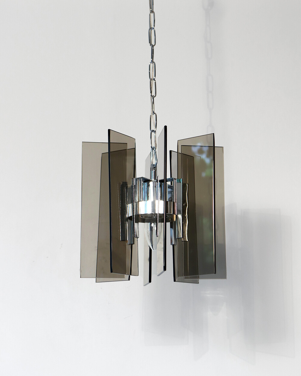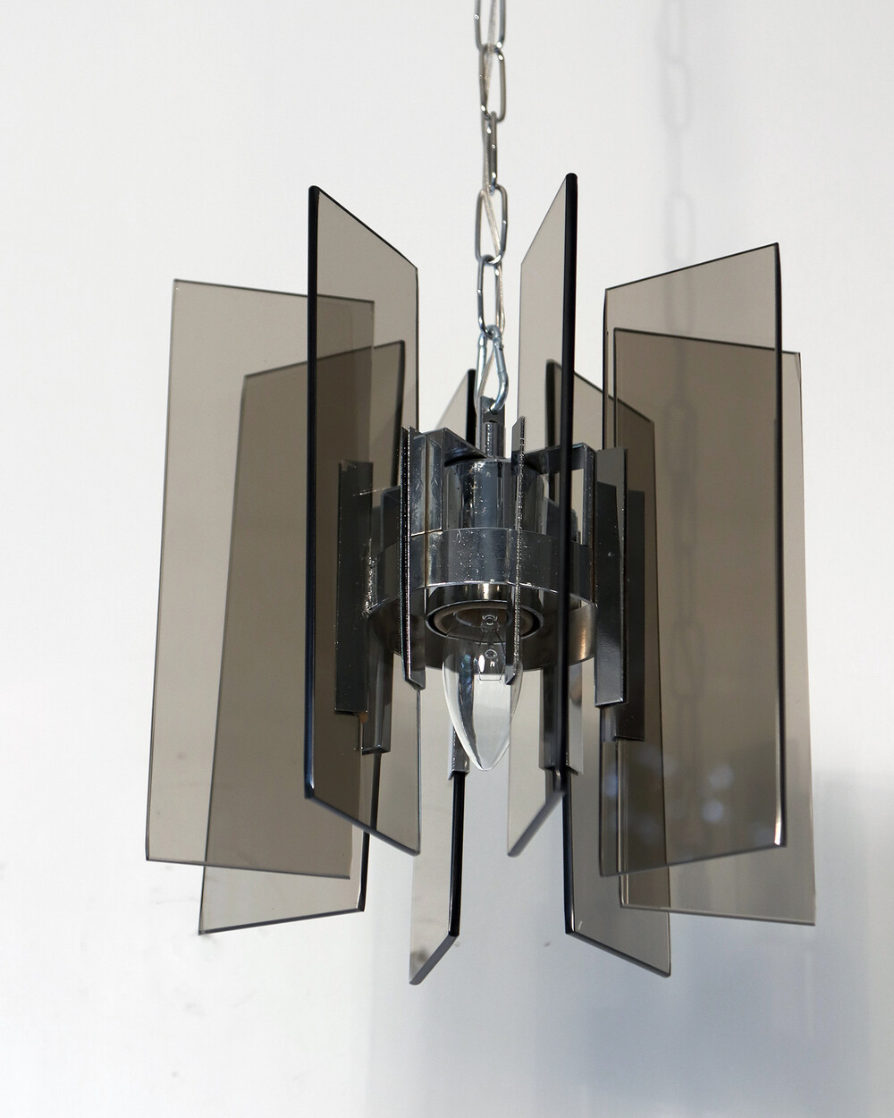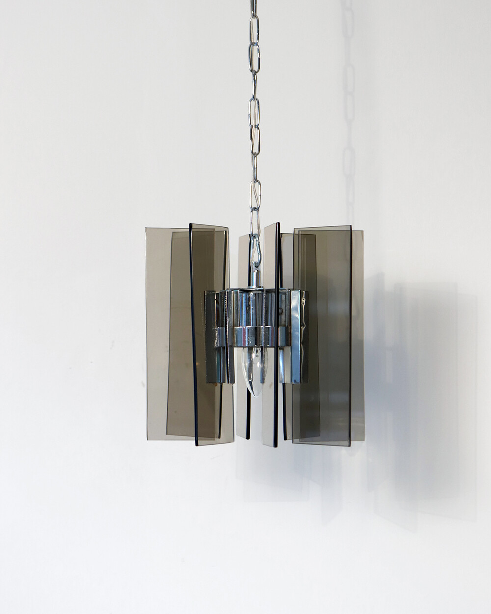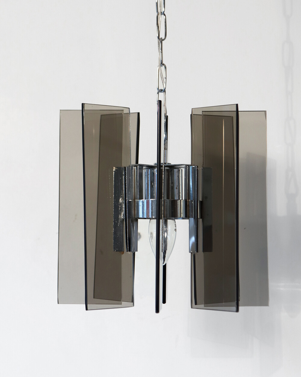 투명한 스모크 글라스와 크롬 메탈이 조화를 이루는 펜던트 조명으로, 1960년대 이탈리아에서 만들어졌습니다. 입체적인 조형과 모던한 실루엣이 시선을 끌며, 점등 시 유리 패널에 반사되는 빛이 특히 아름답게 퍼집니다.