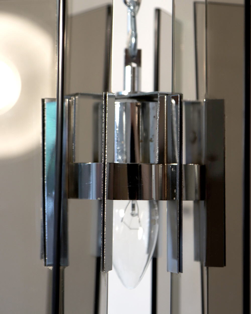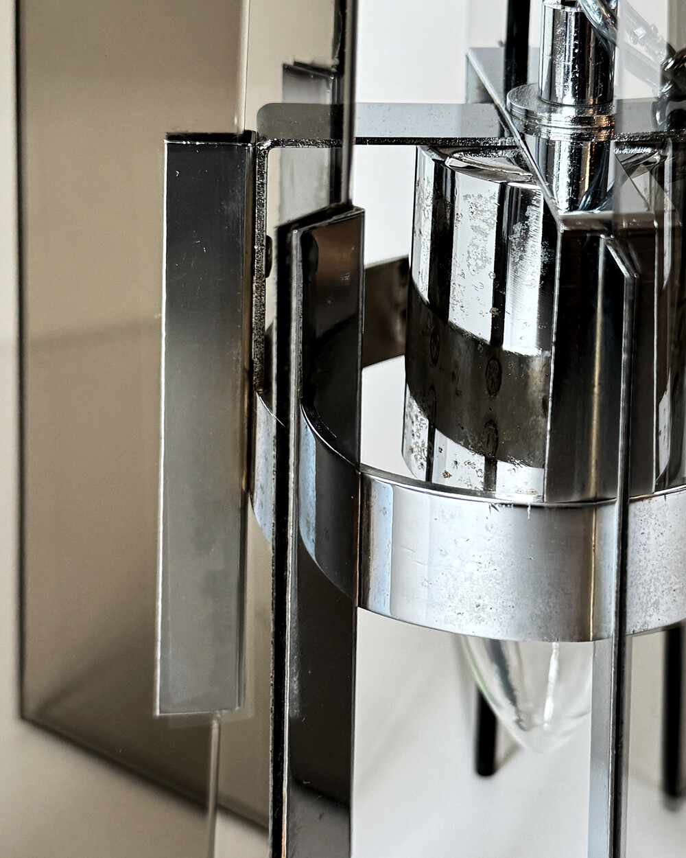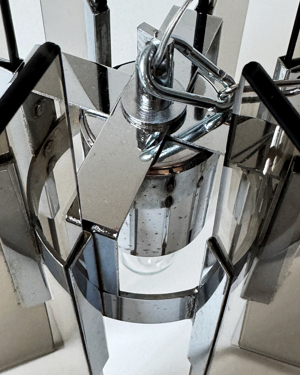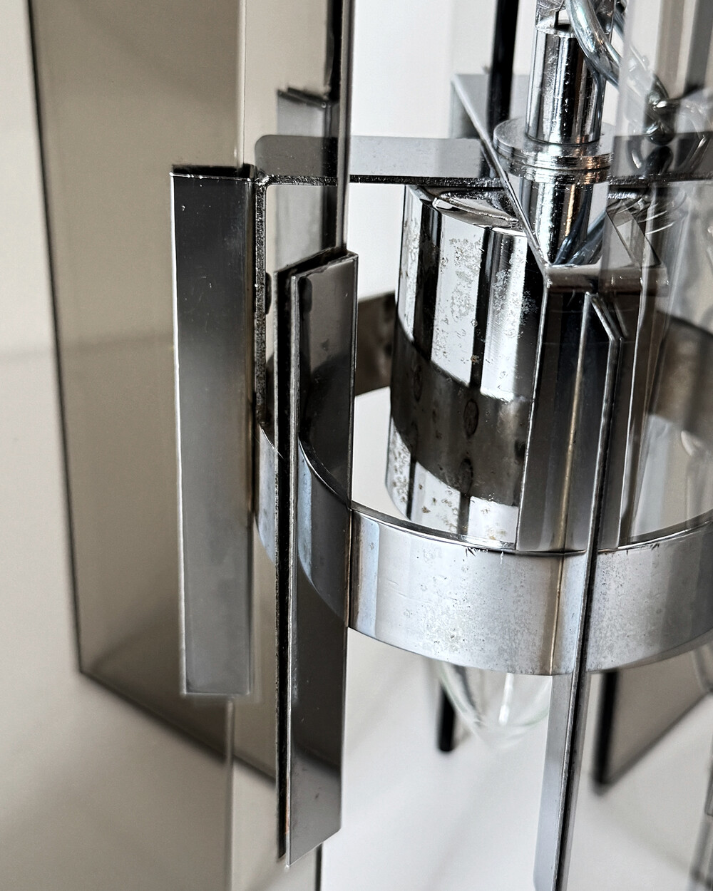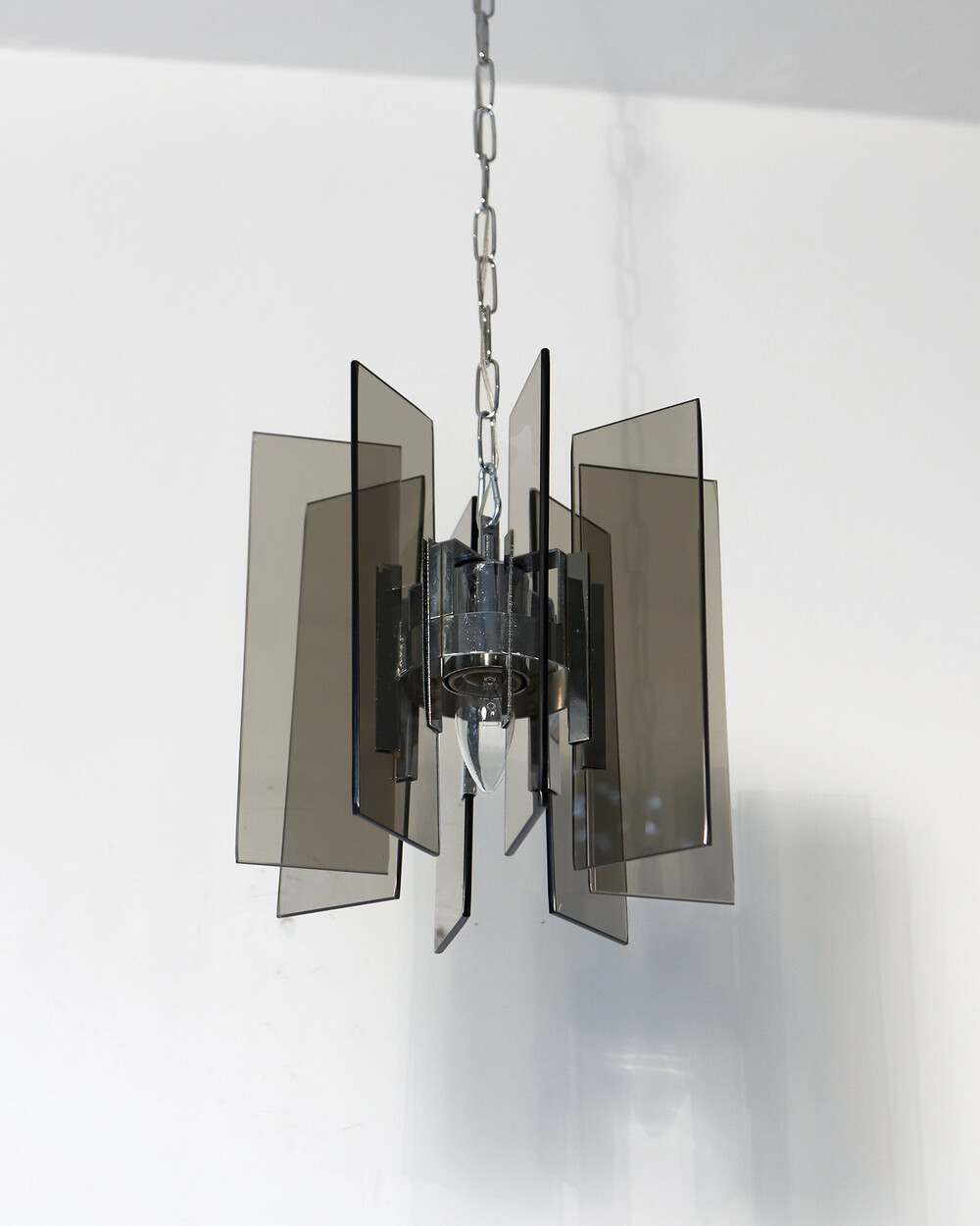 투명한 스모크 글라스와 크롬 메탈이 조화를 이루는 펜던트 조명으로, 1960년대 이탈리아에서 만들어졌습니다. 입체적인 조형과 모던한 실루엣이 시선을 끌며, 점등 시 유리 패널에 반사되는 빛이 특히 아름답게 퍼집니다.