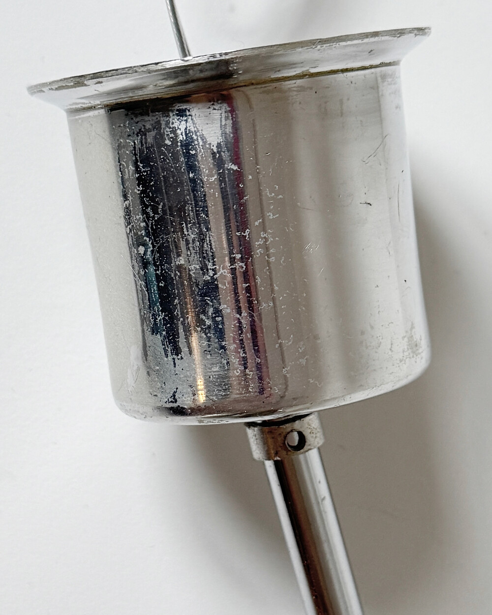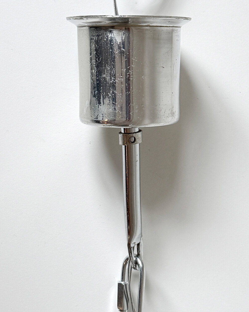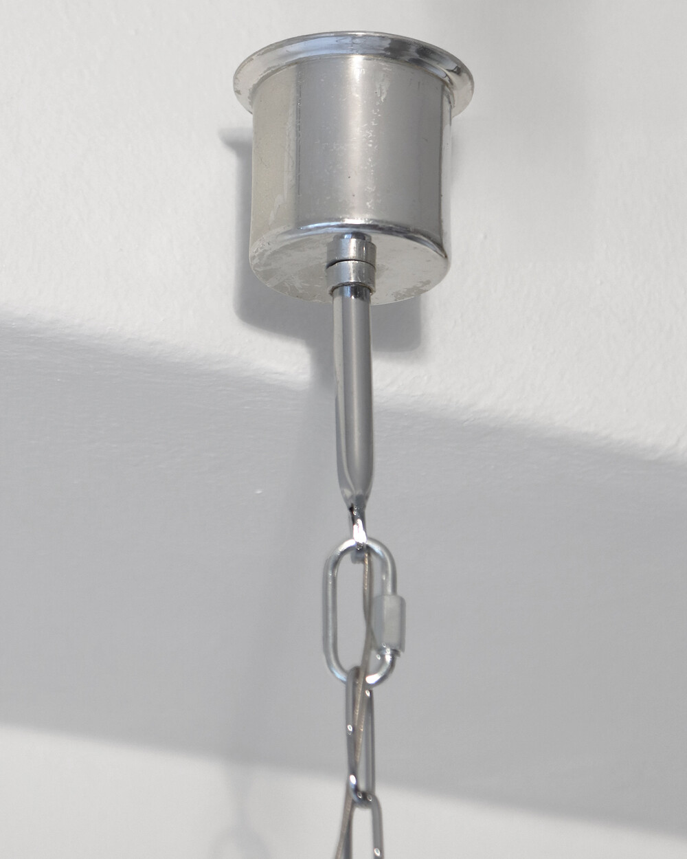 천장 전선 커버는 컵 형태의 메탈 소재로 만들어졌으며, 아래로 체인이 연결되어 있습니다.
