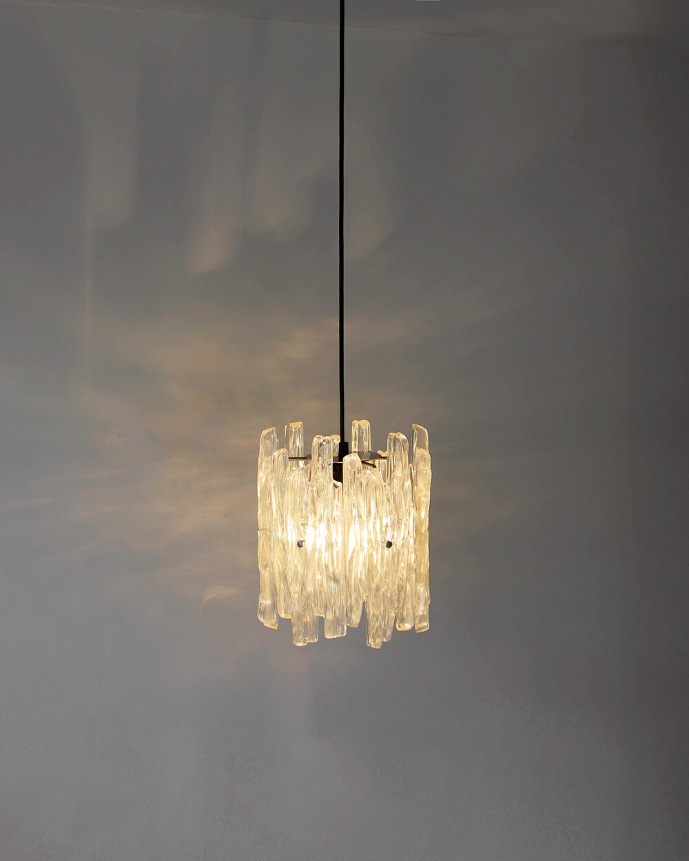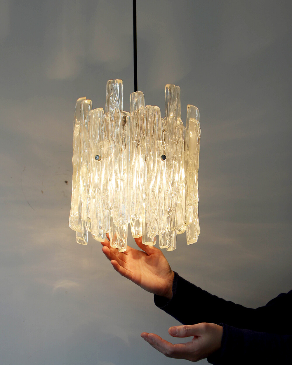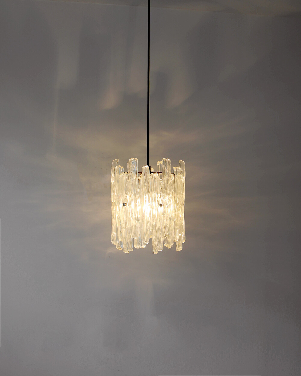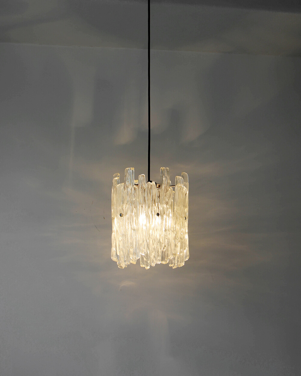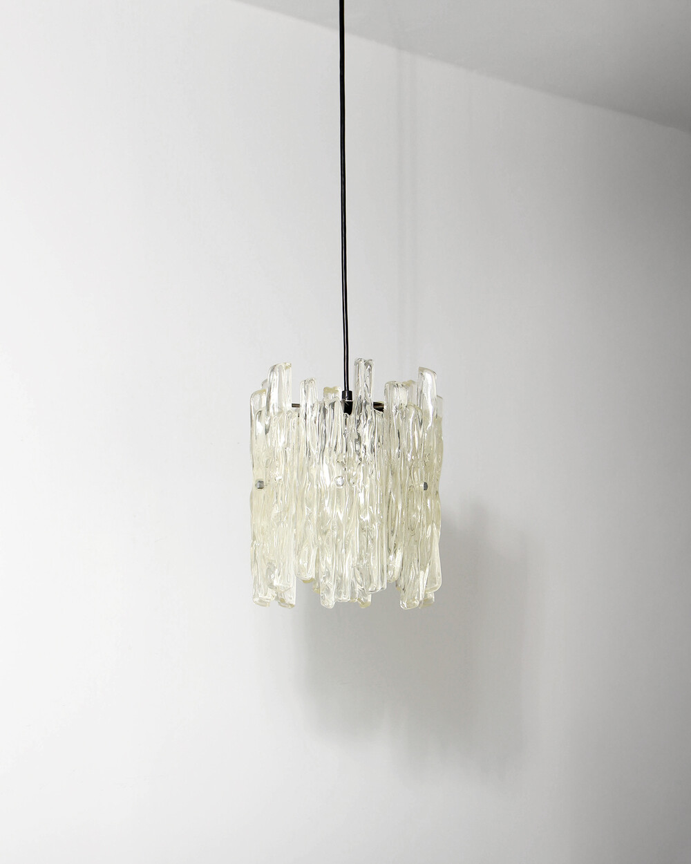 투명한 얼음 기둥을 형상화한 1960년대 오스트리아 J.T. Kalmar에서 제작된 아크릴 아이스 펜던트 램프입니다.러프한 굴곡을 지닌 아크릴 모듈들이 겹겹이 배열되어, 고드름이 매달린 듯한 조형을 이룹니다.점등 시 빛이 아크릴 단면을 따라 부드럽게 굴절·확산되며, 공간에 은은한 반사와 깊이를 더합니다.