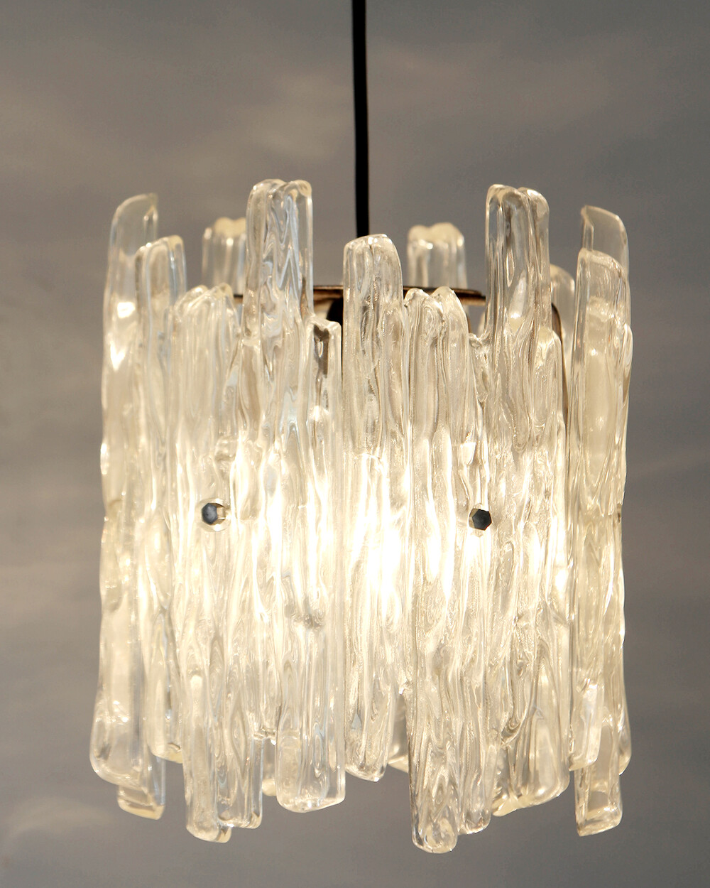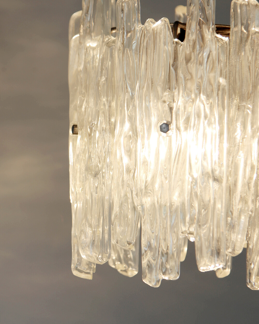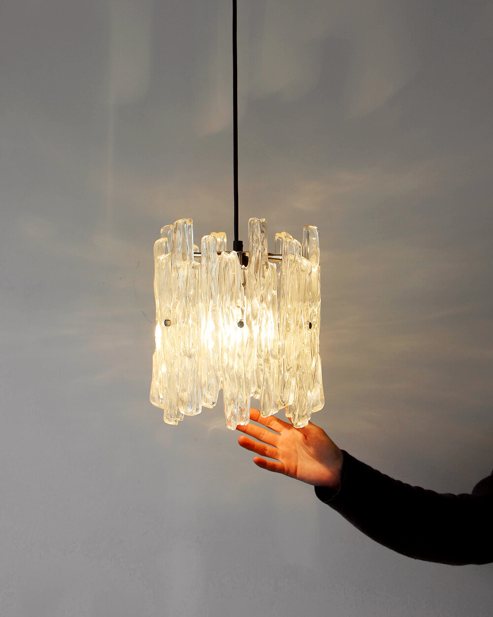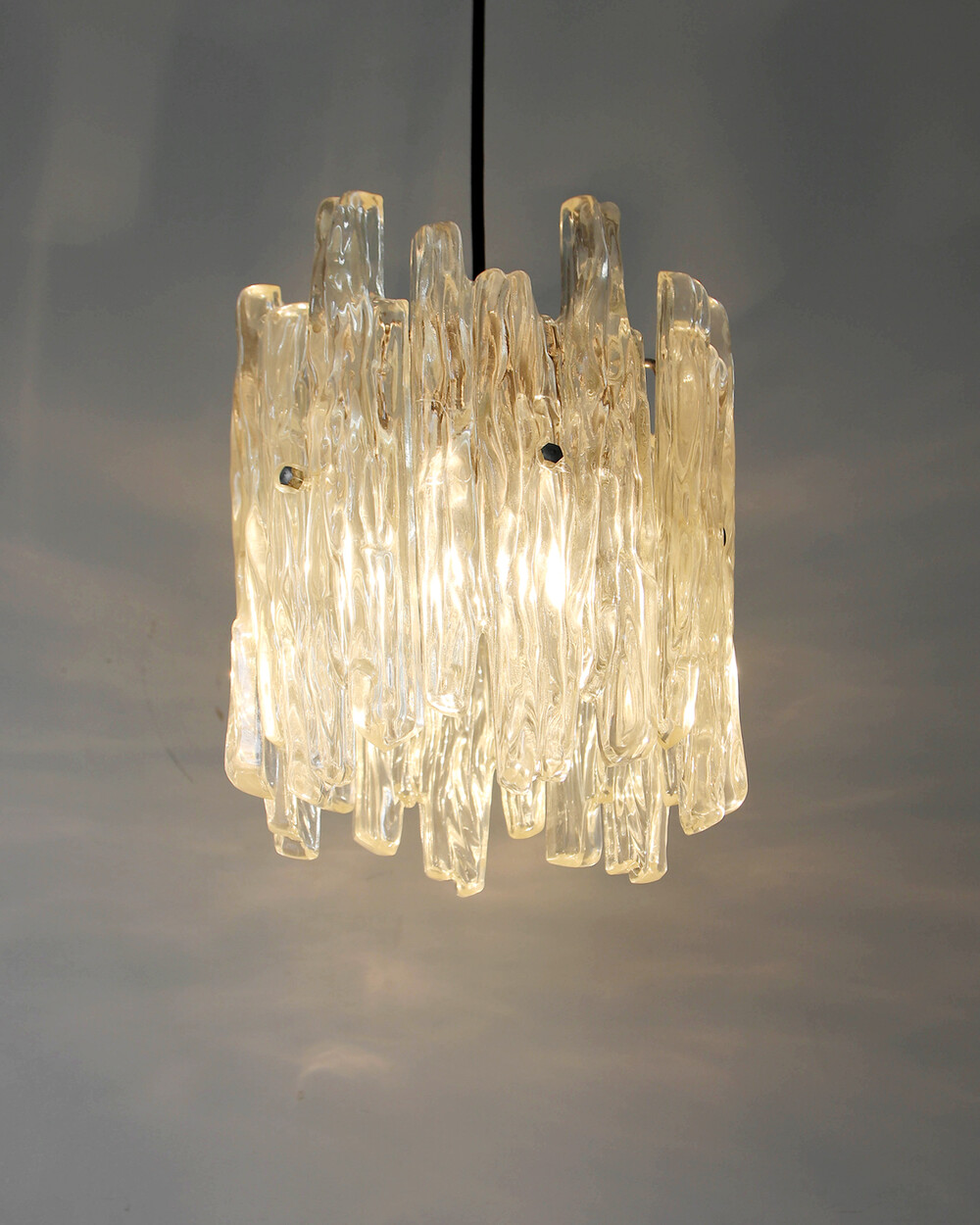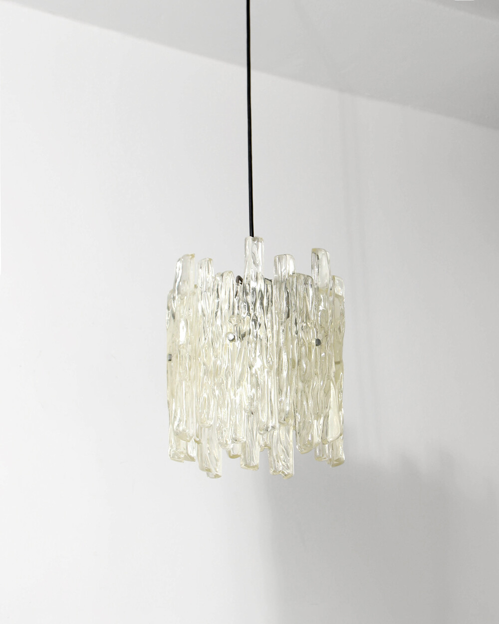투명한 얼음 기둥을 형상화한 1960년대 오스트리아 J.T. Kalmar에서 제작된 아크릴 아이스 펜던트 램프입니다.러프한 굴곡을 지닌 아크릴 모듈들이 겹겹이 배열되어, 고드름이 매달린 듯한 조형을 이룹니다.점등 시 빛이 아크릴 단면을 따라 부드럽게 굴절·확산되며, 공간에 은은한 반사와 깊이를 더합니다.