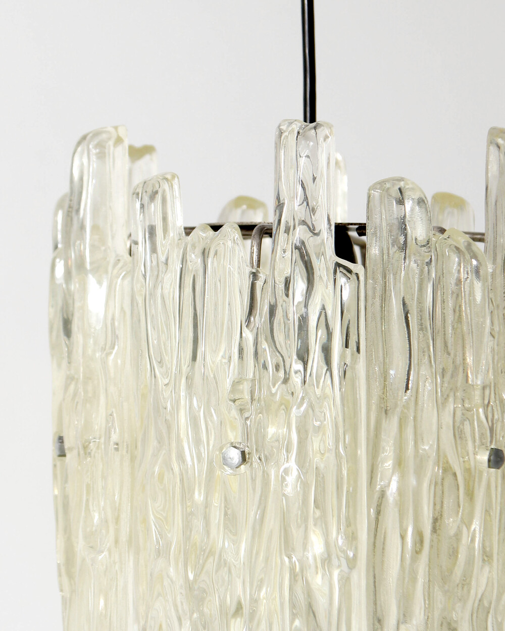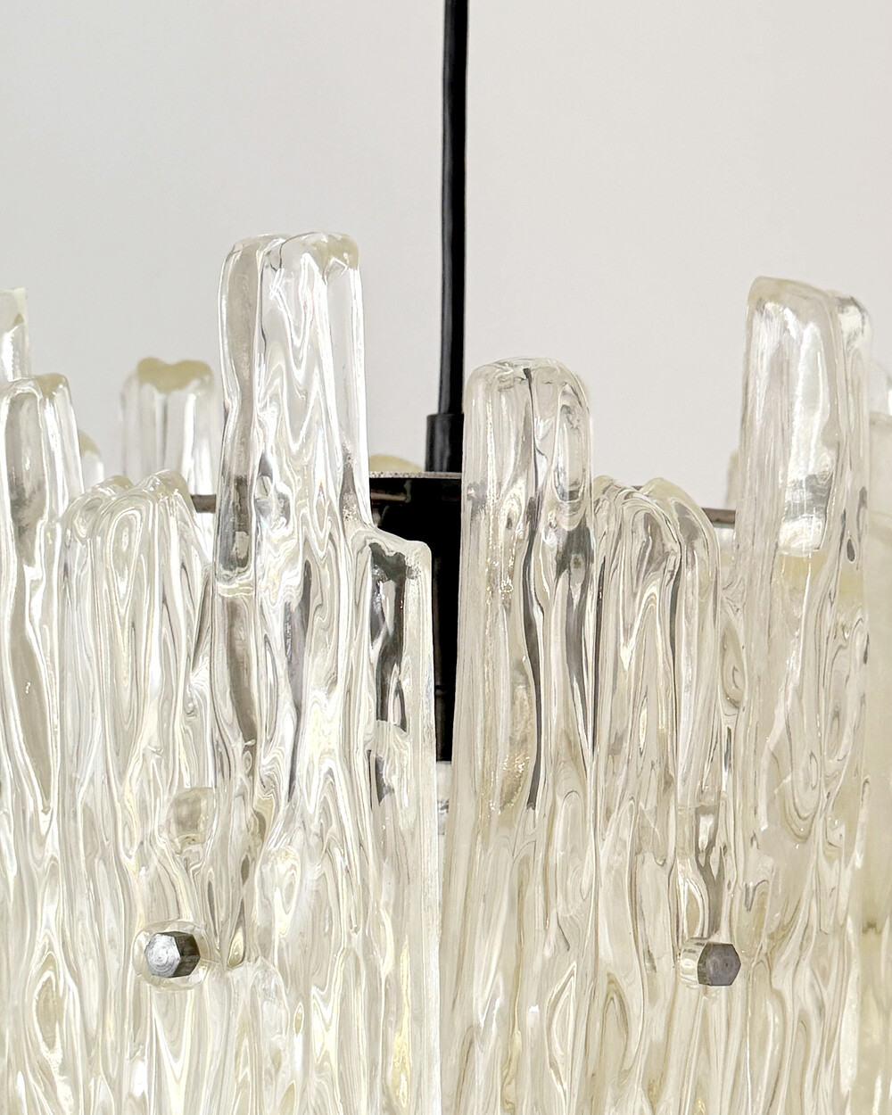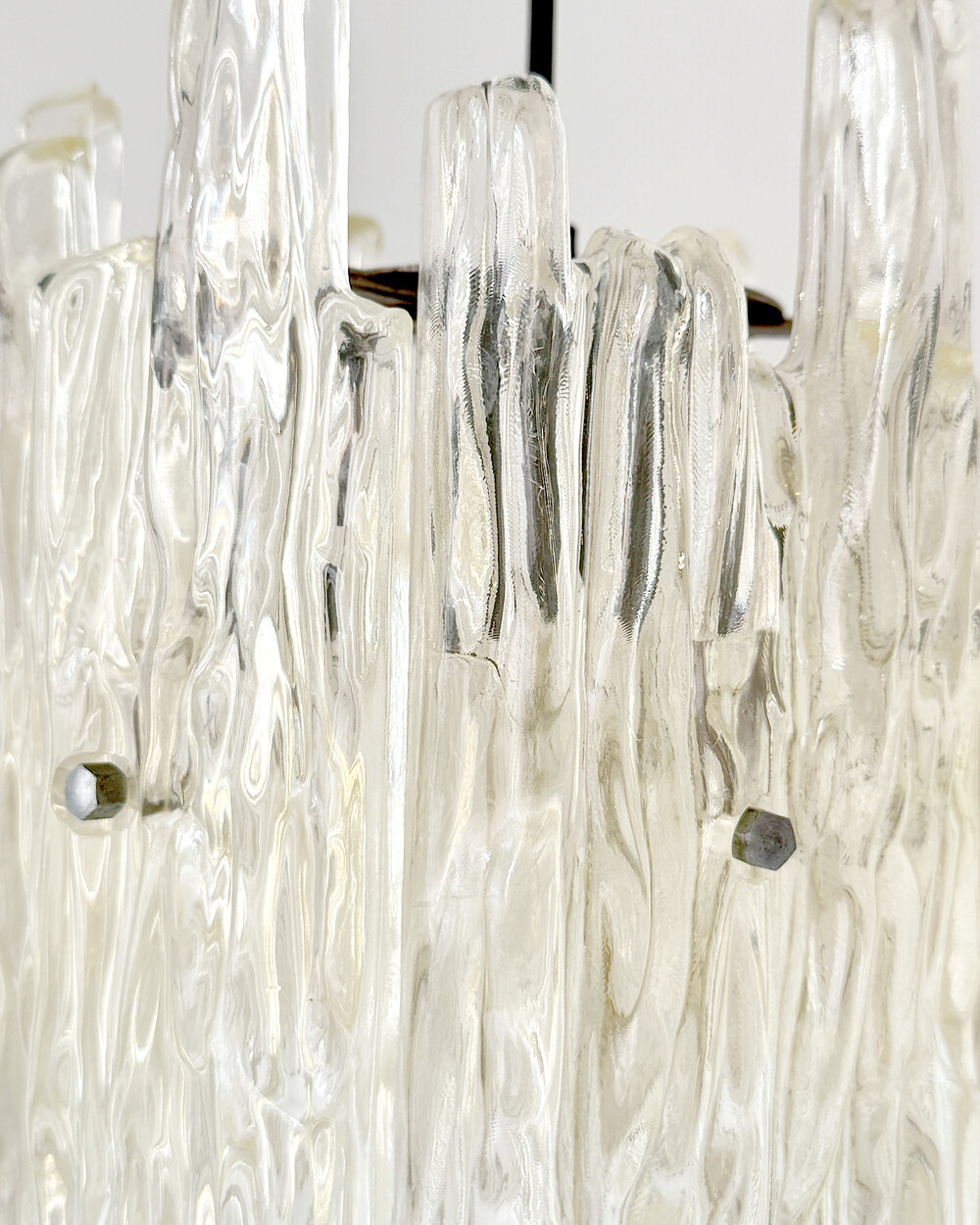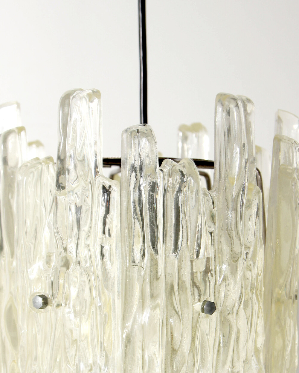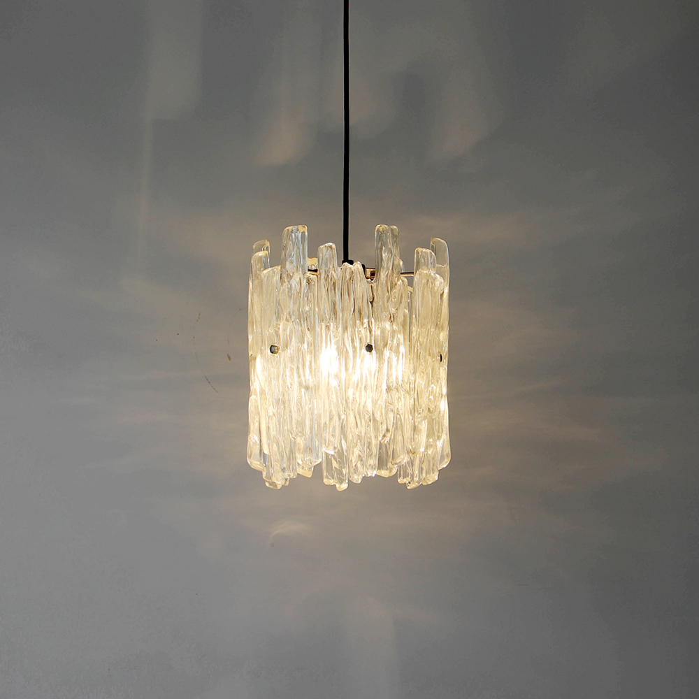 투명한 얼음 기둥을 형상화한 1960년대 오스트리아 J.T. Kalmar에서 제작된 아크릴 아이스 펜던트 램프입니다.러프한 굴곡을 지닌 아크릴 모듈들이 겹겹이 배열되어, 고드름이 매달린 듯한 조형을 이룹니다.점등 시 빛이 아크릴 단면을 따라 부드럽게 굴절·확산되며, 공간에 은은한 반사와 깊이를 더합니다.