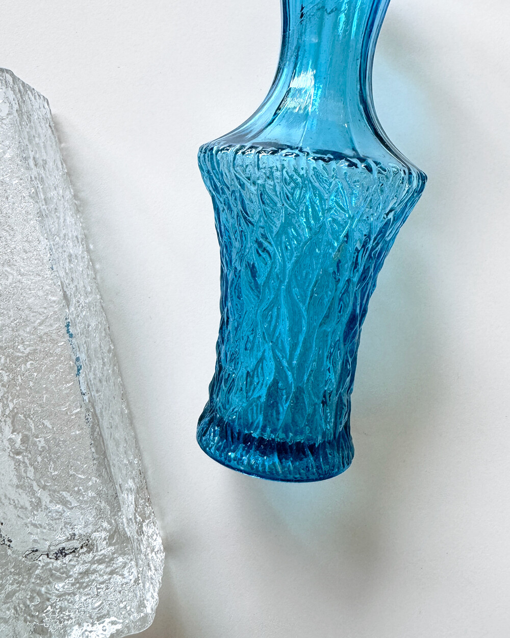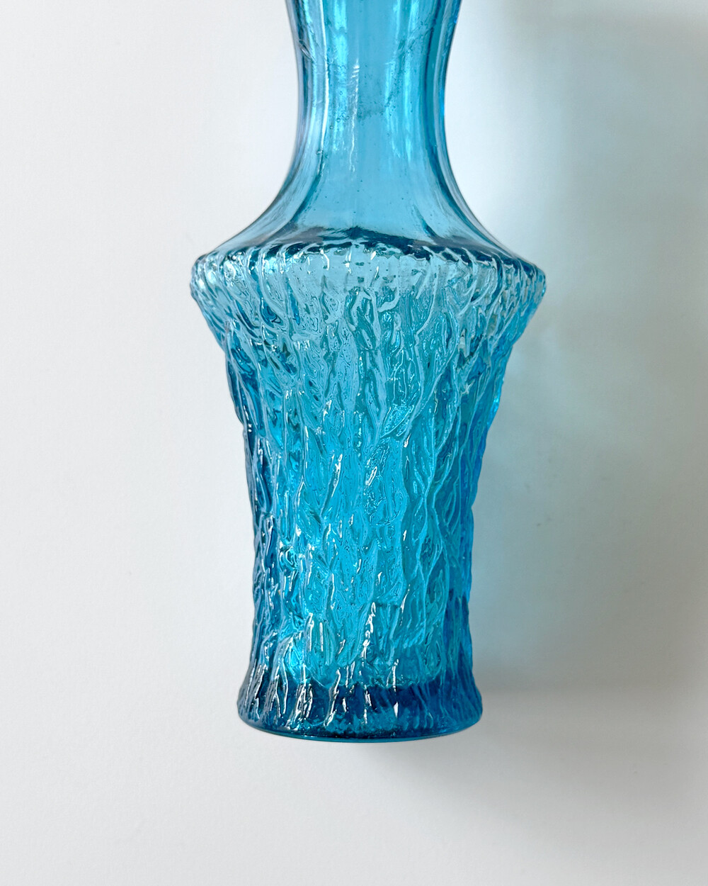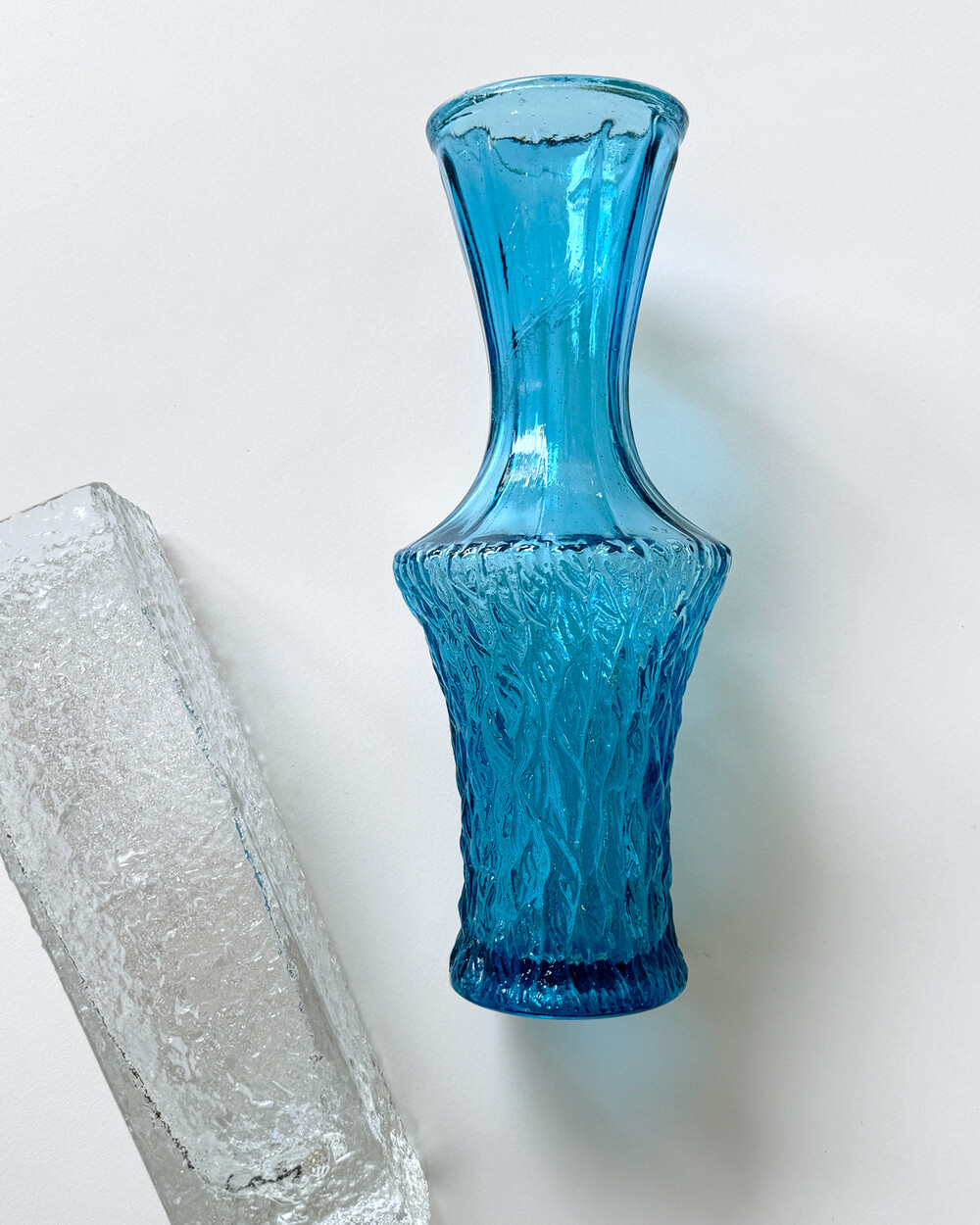 17세기 런던에서 설립된 유리공방 Whitefriars Glass에서 1967년도부터 전개한 Textured Glass 시리즈로 흔히 쓰이지 않던 나무껍질, 철망, 촛농 등 일상적인 오브제를 이용한 형태와 블루, 딥그린, 퍼플 등의 존재감이 강한 컬러가 특징입니다.