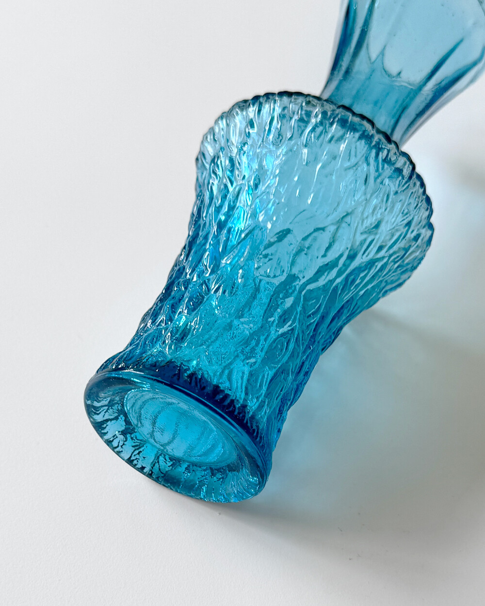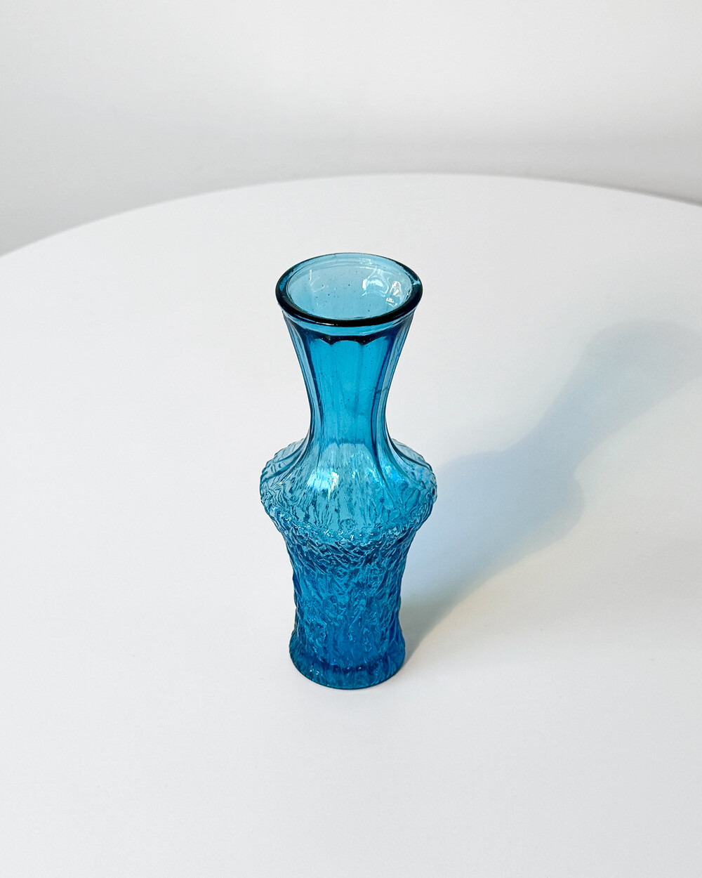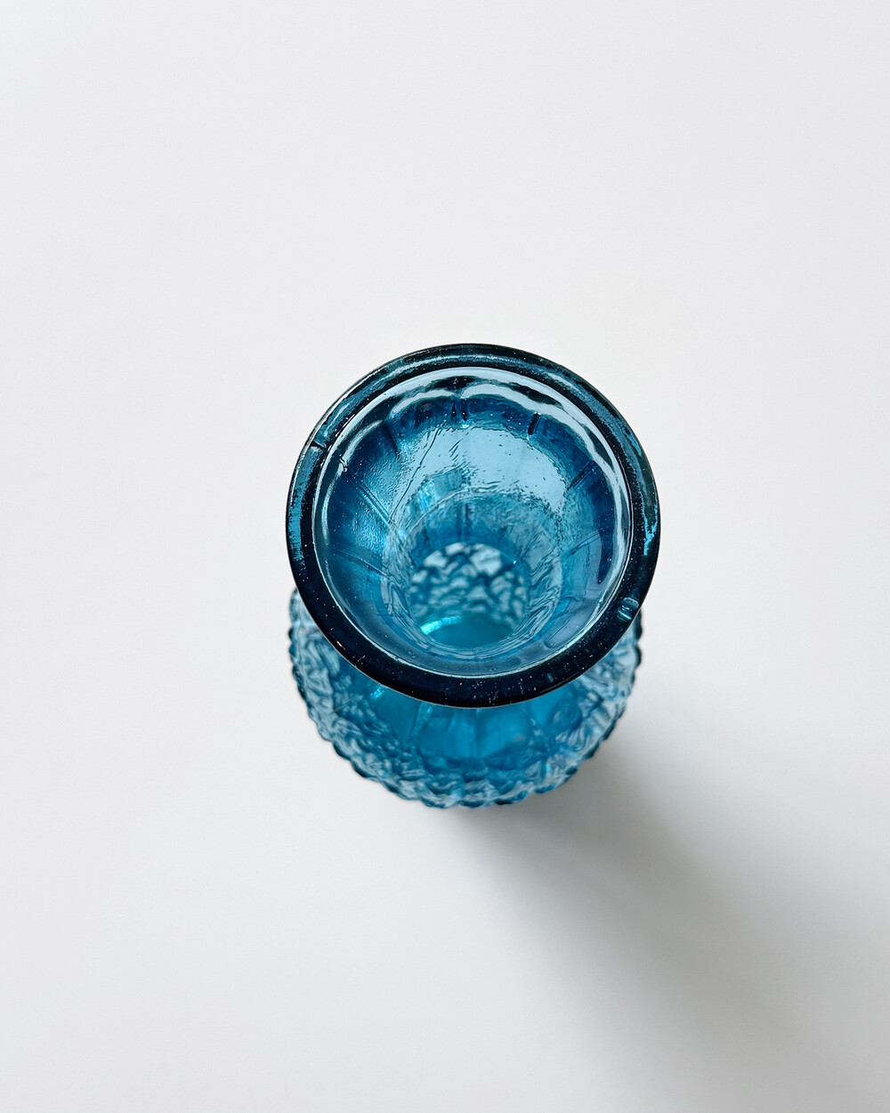 독특한 입체감과 유기적인 무늬, 짙은 푸른빛의 유리가 아름답게 어우러진 유리 화병입니다.