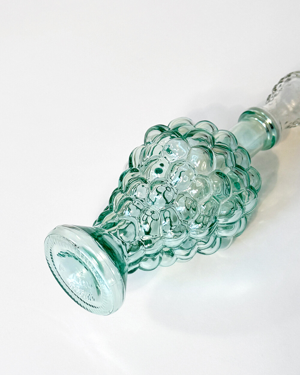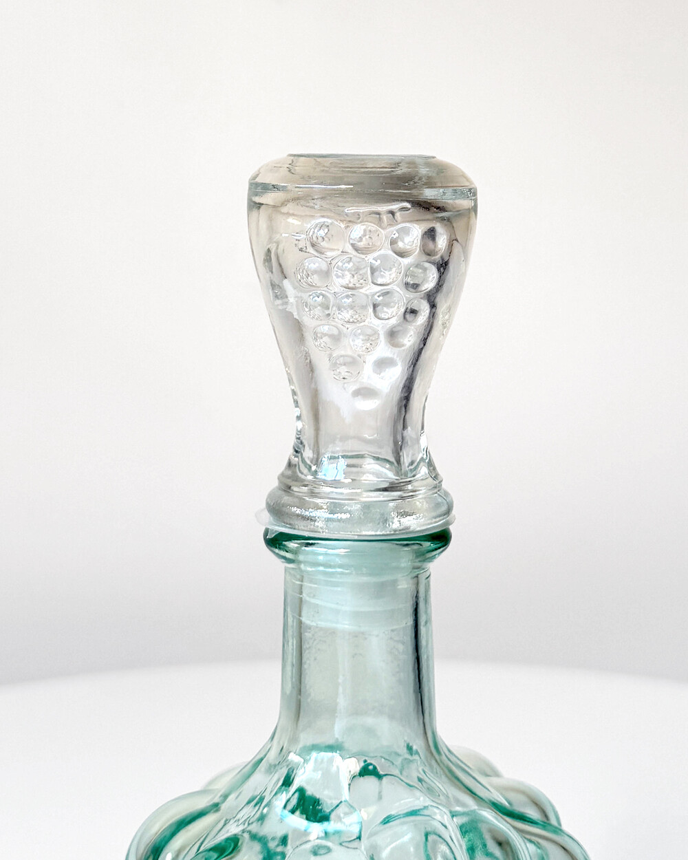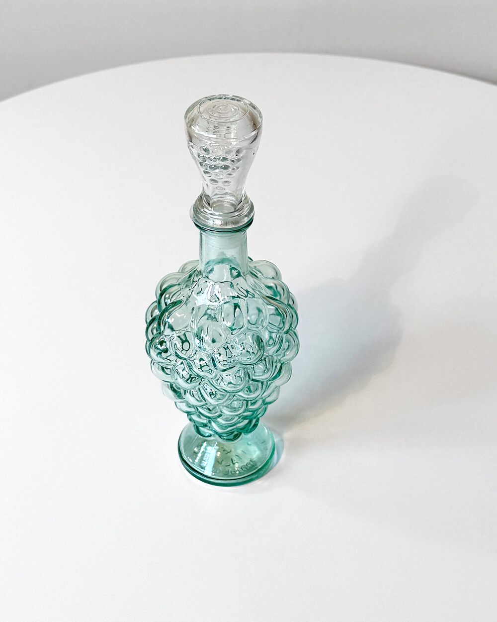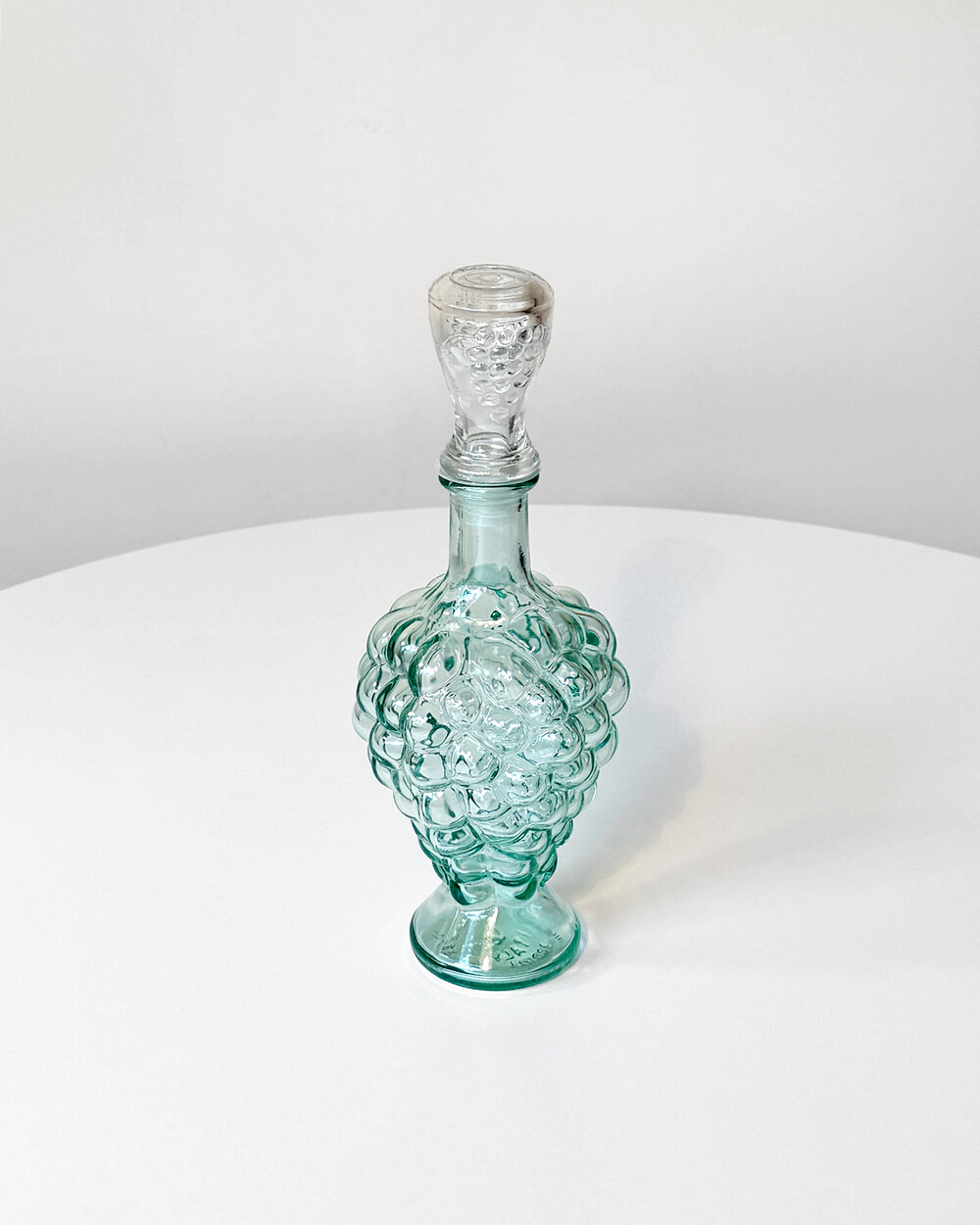 1960년대 이탈리아 유리 공방 Vetreria Etrusca에서 제작된 아쿠아 글라스 데칸터입니다. 포도송이 모양의 입체적인 패턴이 스토퍼까지 이어지며, 바닥에는 “Mod. Dep.”(등록 디자인) 마크가 새겨져 있습니다. 와인이나 리큐어를 담는 용도는 물론, 화병이나 장식 오브제로도 활용할 수 있습니다.