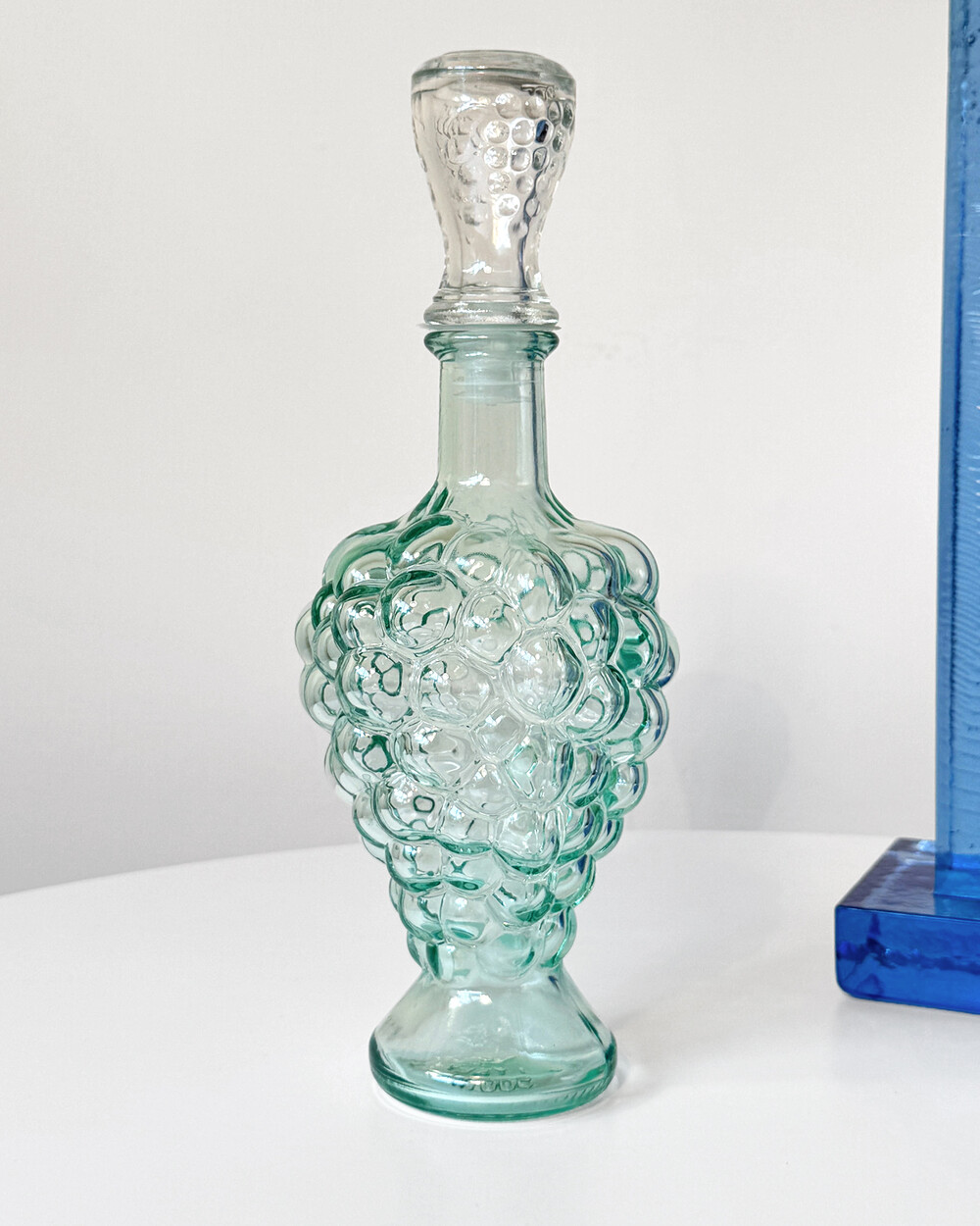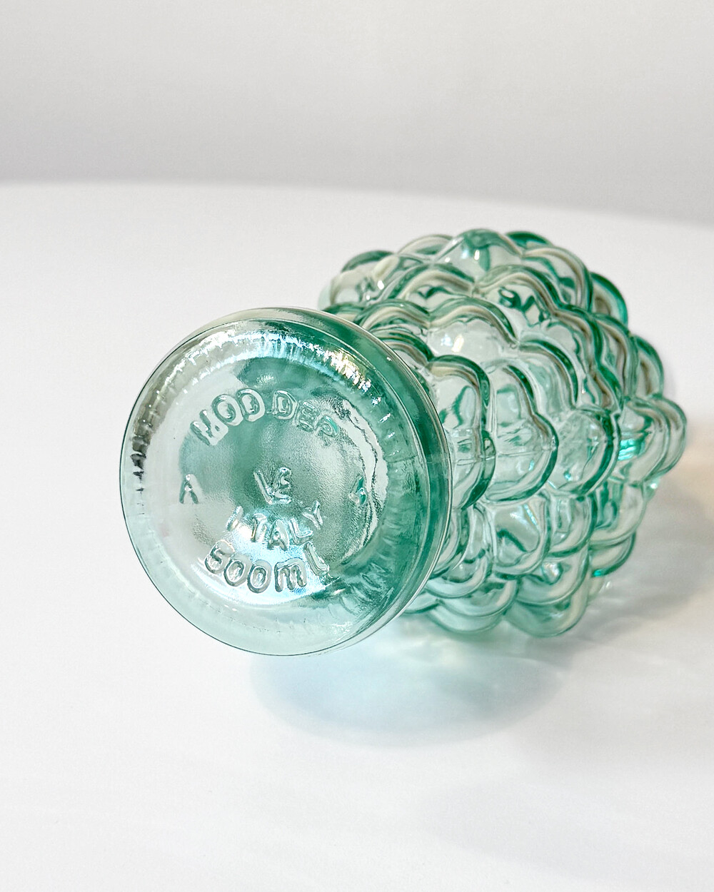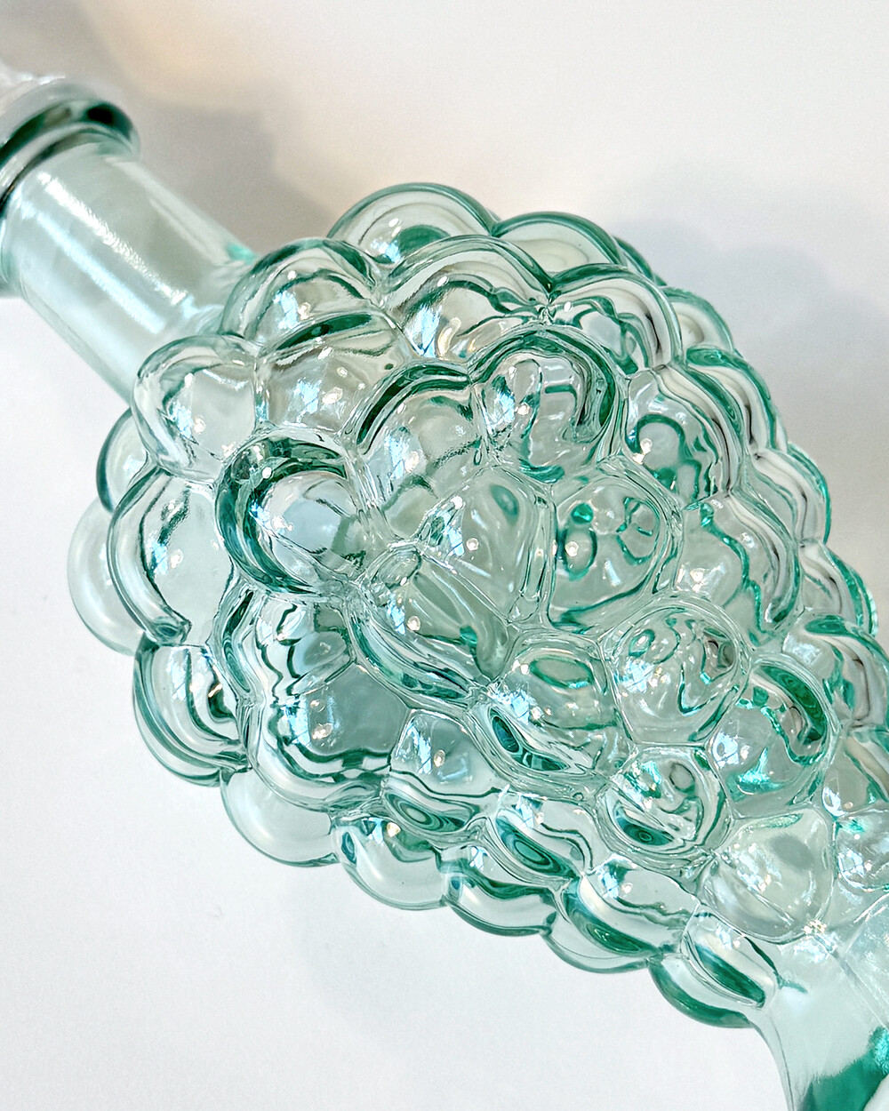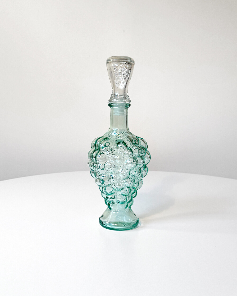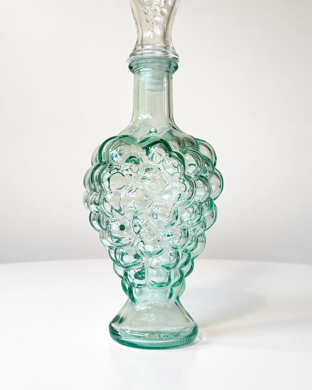 1960년대 이탈리아 유리 공방 Vetreria Etrusca에서 제작된 아쿠아 글라스 데칸터입니다. 포도송이 모양의 입체적인 패턴이 스토퍼까지 이어지며, 바닥에는 “Mod. Dep.”(등록 디자인) 마크가 새겨져 있습니다. 와인이나 리큐어를 담는 용도는 물론, 화병이나 장식 오브제로도 활용할 수 있습니다.