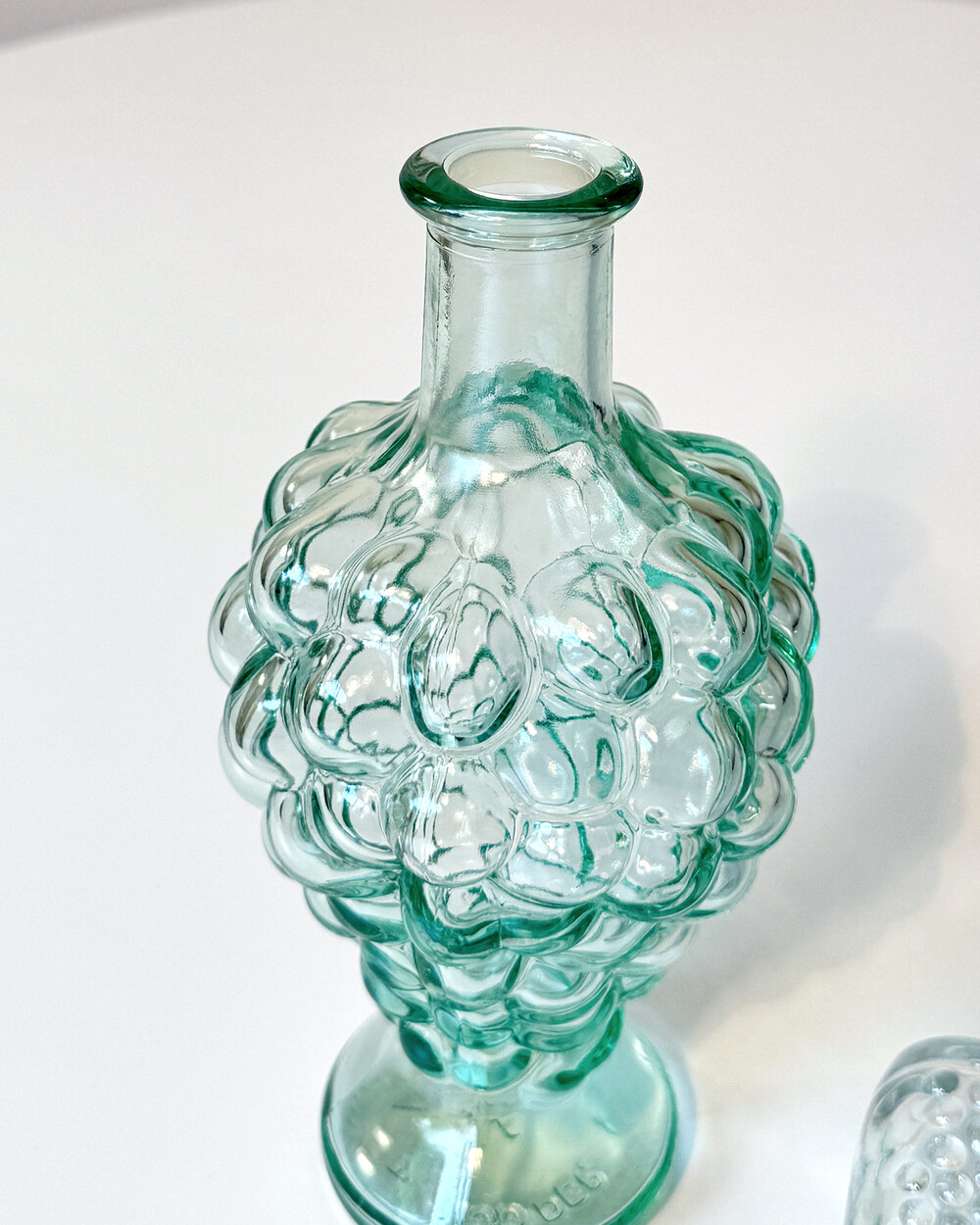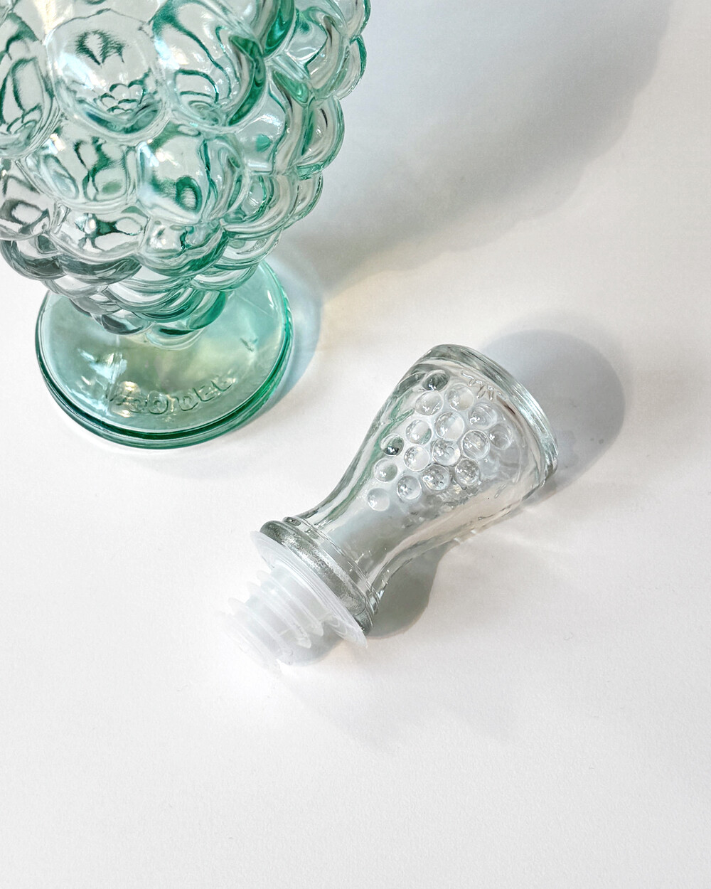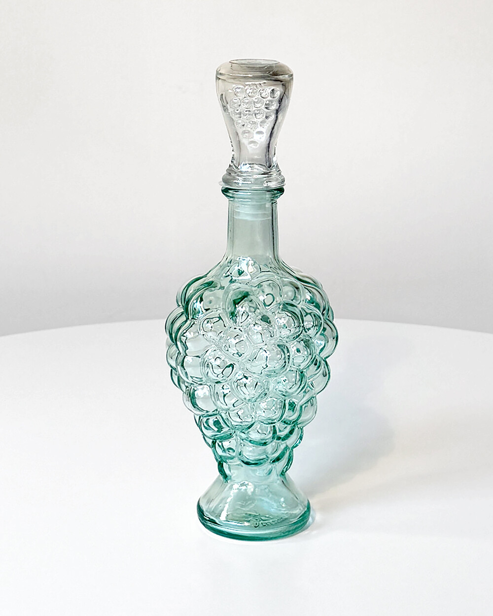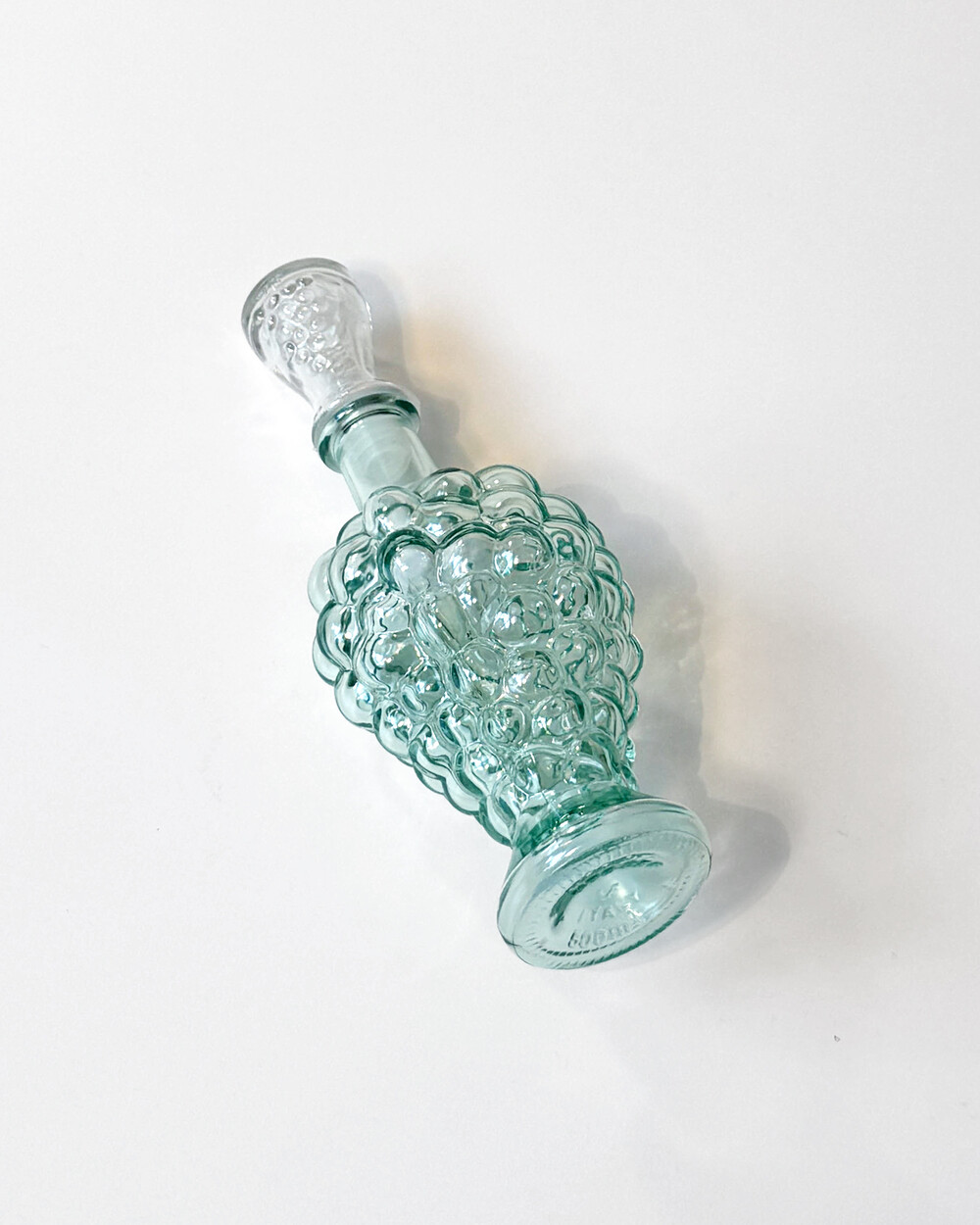 1960년대 이탈리아 유리 공방 Vetreria Etrusca에서 제작된 아쿠아 글라스 데칸터입니다. 포도송이 모양의 입체적인 패턴이 스토퍼까지 이어지며, 바닥에는 “Mod. Dep.”(등록 디자인) 마크가 새겨져 있습니다. 와인이나 리큐어를 담는 용도는 물론, 화병이나 장식 오브제로도 활용할 수 있습니다.