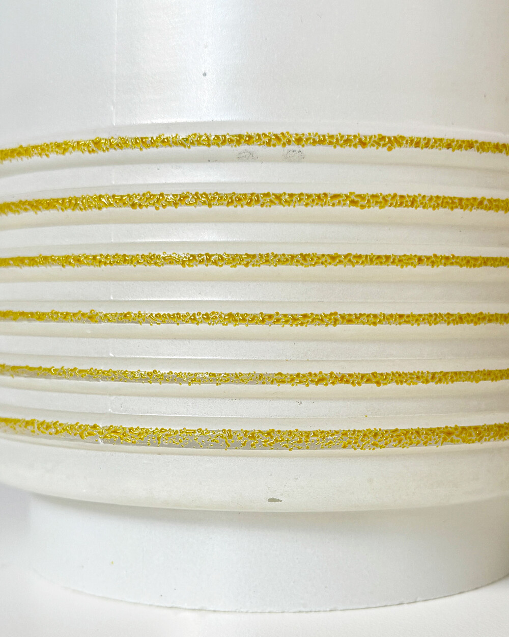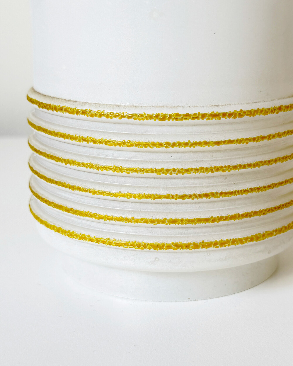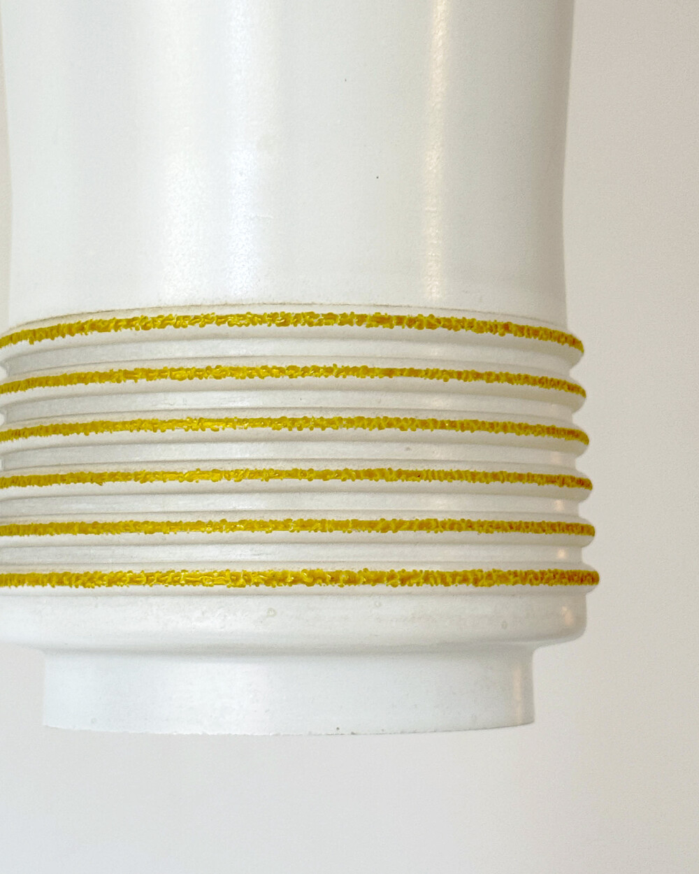 심플한 실린더 실루엣의 글라스 펜던트 램프로, 1960년대 독일에서 만들어졌습니다. 화이트 컬러 베이스에 입체적인 텍스처의 옐로 스트라이프 장식이 더해졌습니다. 다이닝 공간이나 은은한 빛이 필요한 아늑한 공간에 잘 어우러지는 크기입니다.