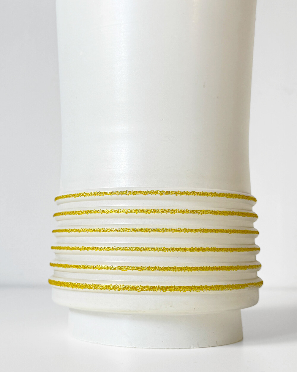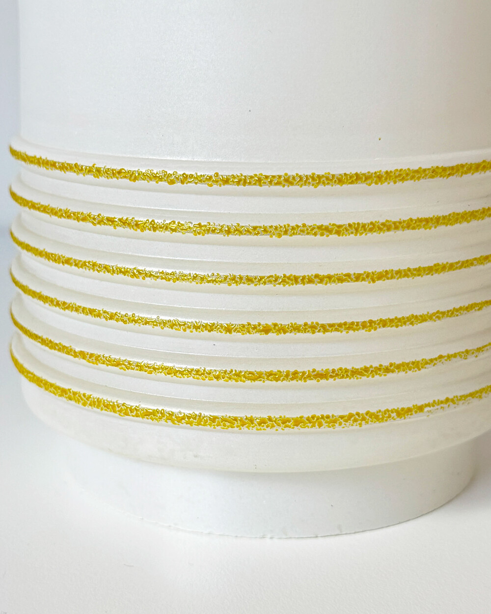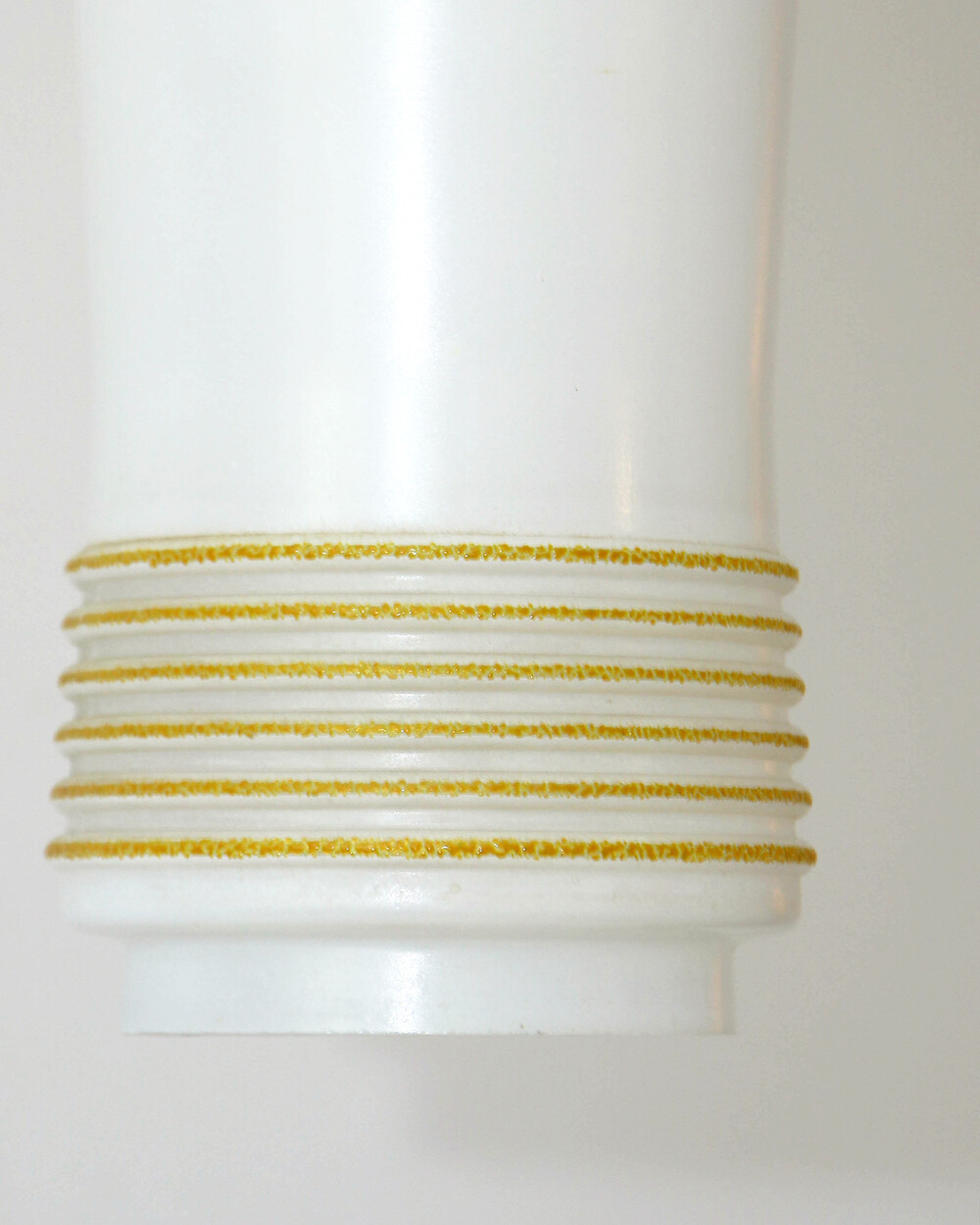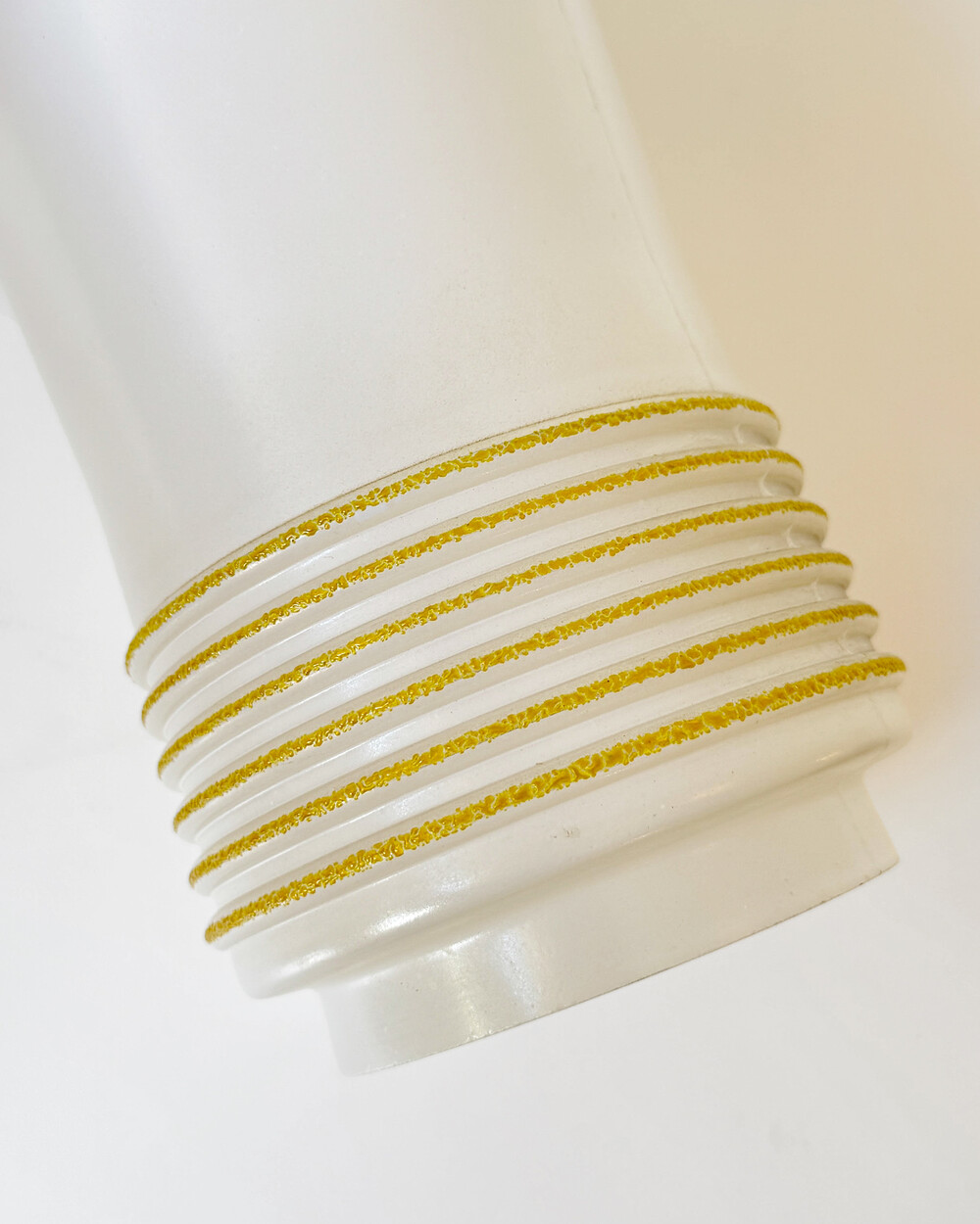심플한 실린더 실루엣의 글라스 펜던트 램프로, 1960년대 독일에서 만들어졌습니다. 화이트 컬러 베이스에 입체적인 텍스처의 옐로 스트라이프 장식이 더해졌습니다. 다이닝 공간이나 은은한 빛이 필요한 아늑한 공간에 잘 어우러지는 크기입니다.