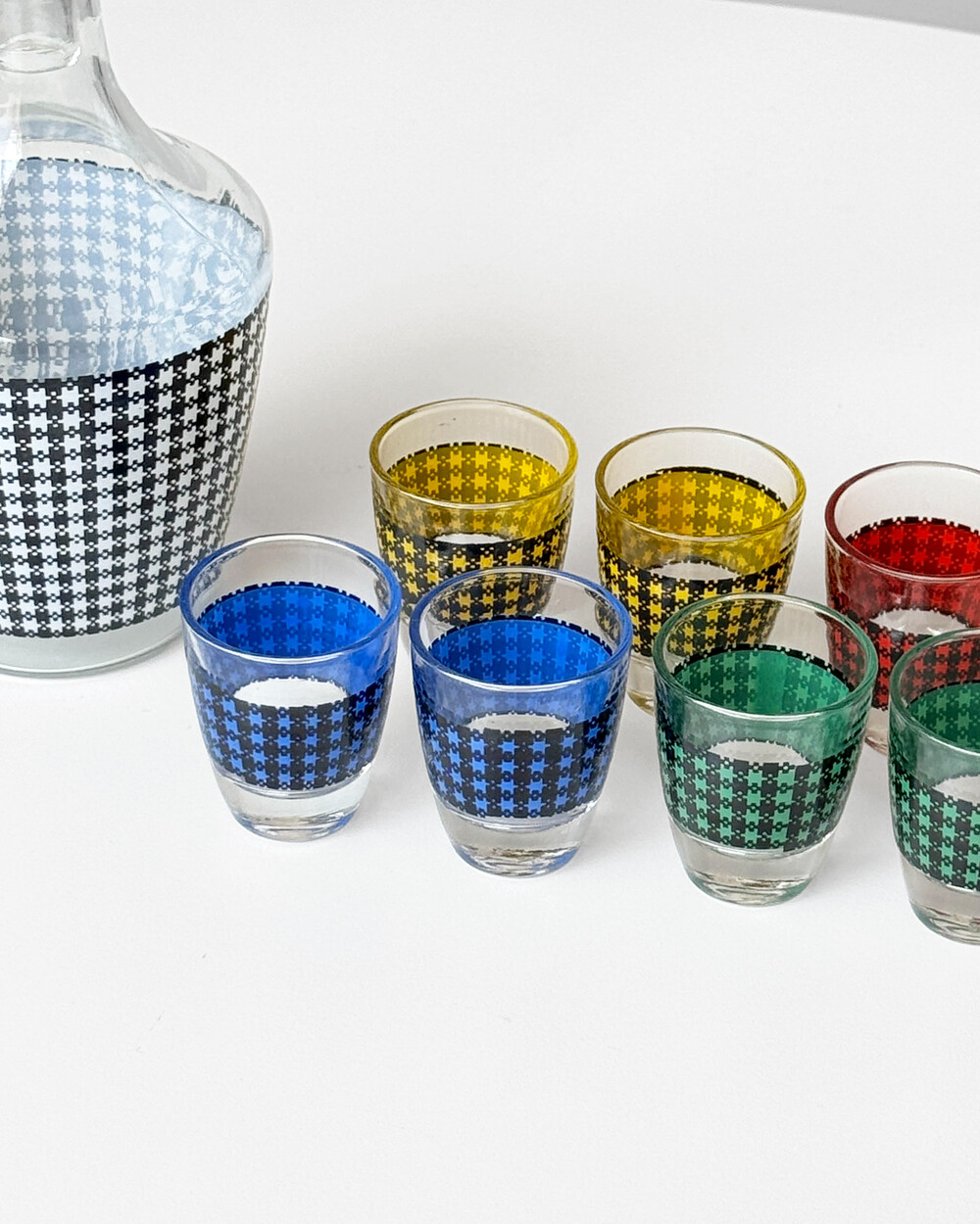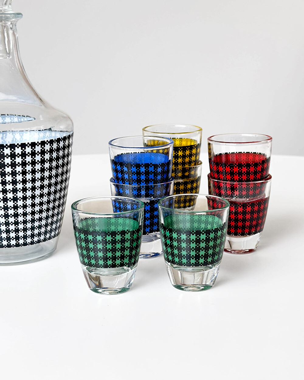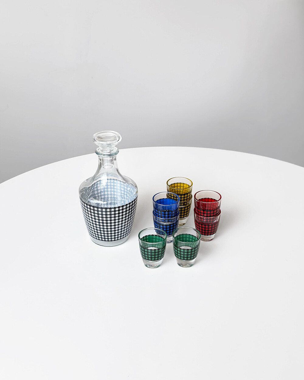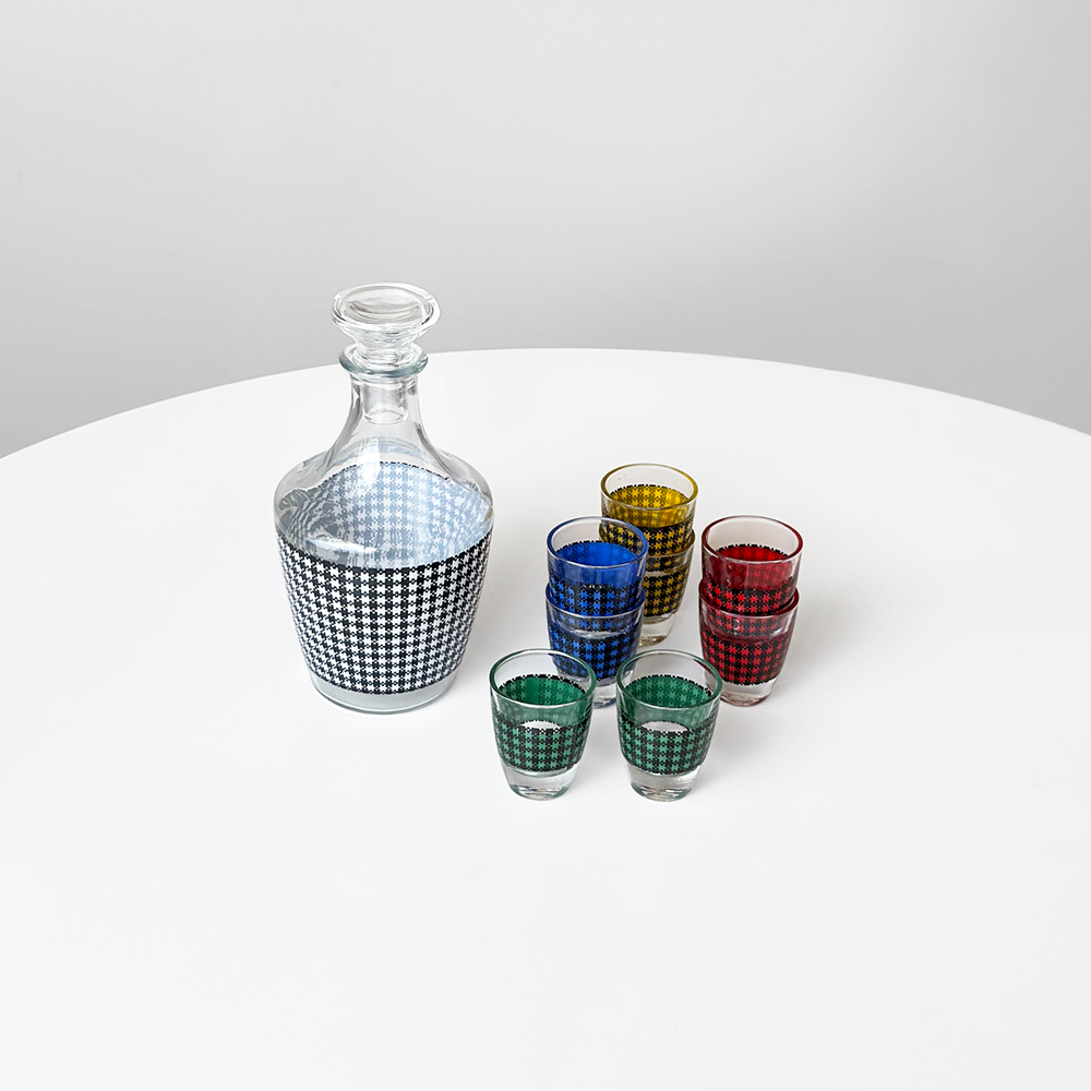 선명한 컬러 글라스와 블랙 진저햄 패턴이 조합된 1960년대 프랑스 Crystal d'Arques 리큐어 서비스 세트입니다. 옐로우, 그린, 블루, 레드 컬러가 각각 두 점씩 구성된 글라스와 디켄터로 이루어져 있습니다.
