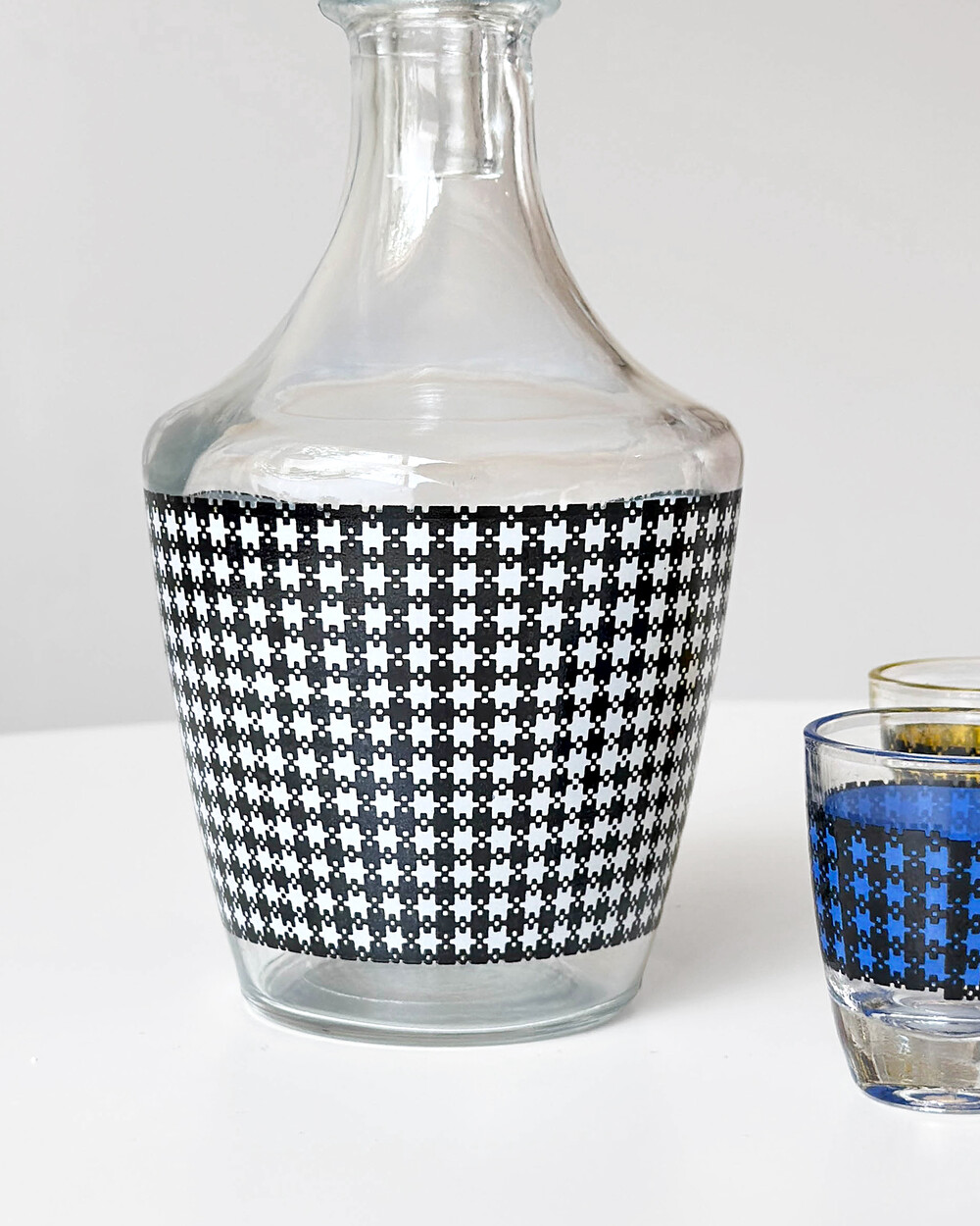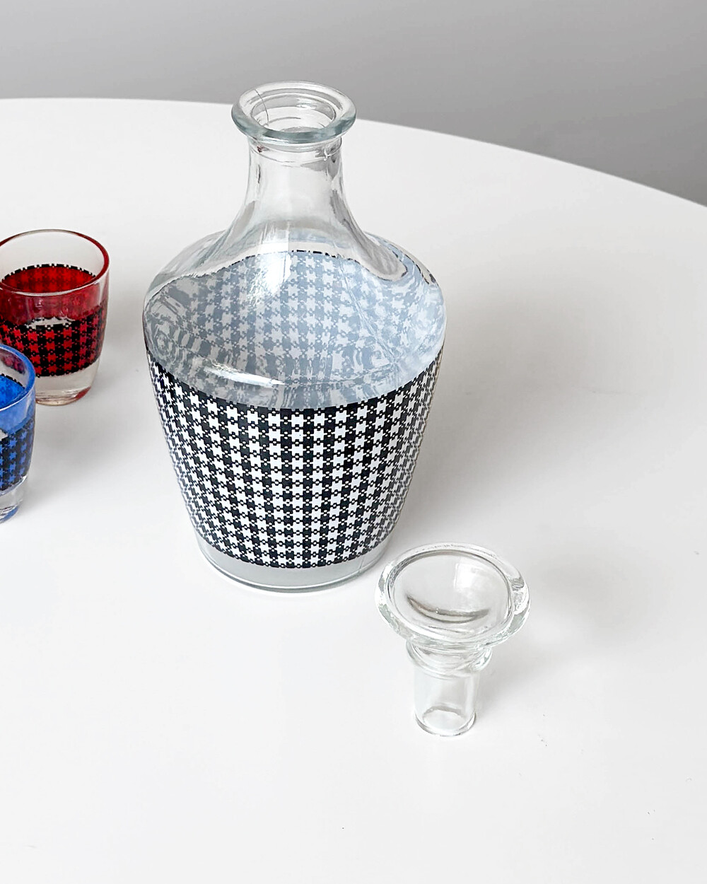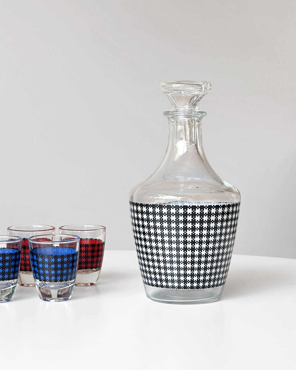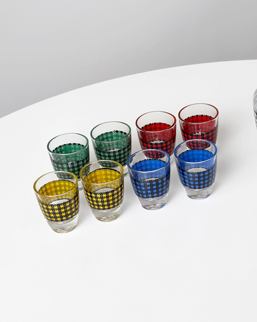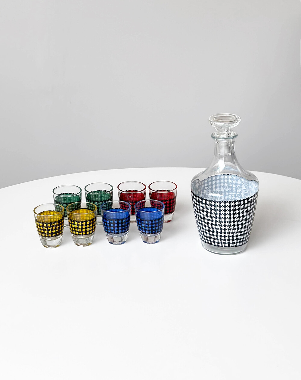 선명한 컬러 글라스와 블랙 진저햄 패턴이 조합된 1960년대 프랑스 Crystal d'Arques 리큐어 서비스 세트입니다. 옐로우, 그린, 블루, 레드 컬러가 각각 두 점씩 구성된 글라스와 디켄터로 이루어져 있습니다.