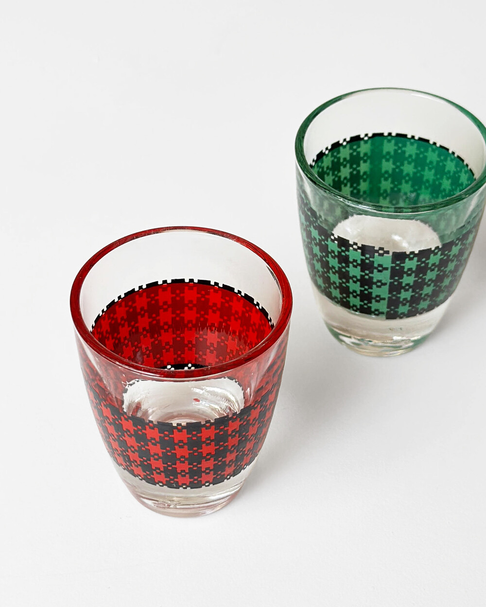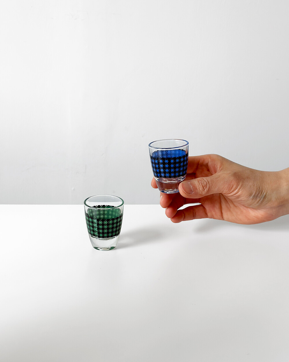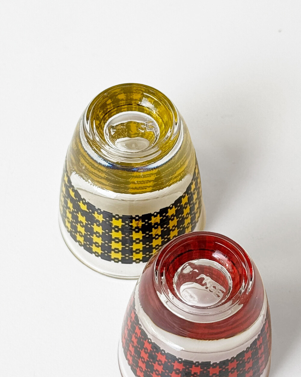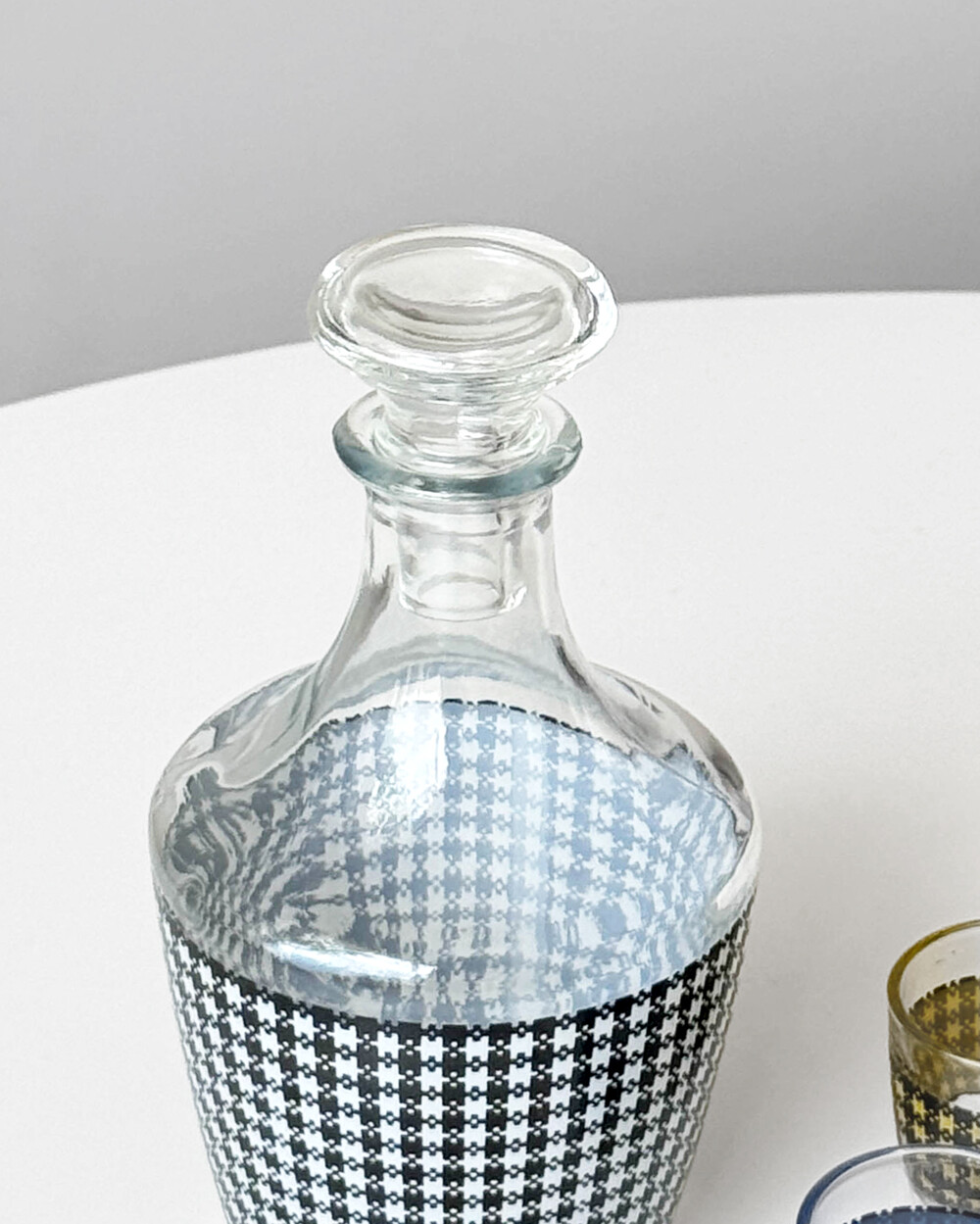 선명한 컬러 글라스와 블랙 진저햄 패턴이 조합된 1960년대 프랑스 Crystal d'Arques 리큐어 서비스 세트입니다. 옐로우, 그린, 블루, 레드 컬러가 각각 두 점씩 구성된 글라스와 디켄터로 이루어져 있습니다.