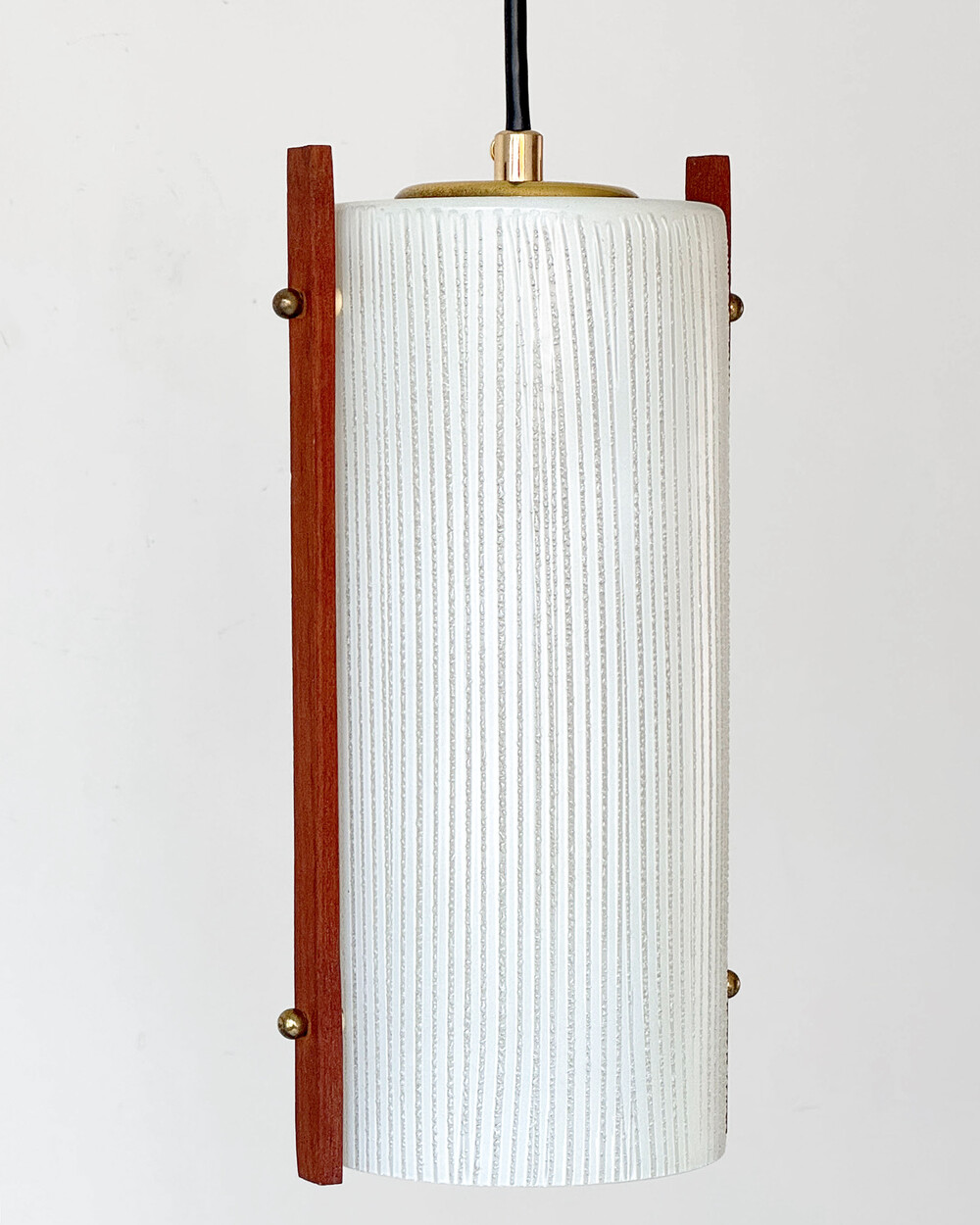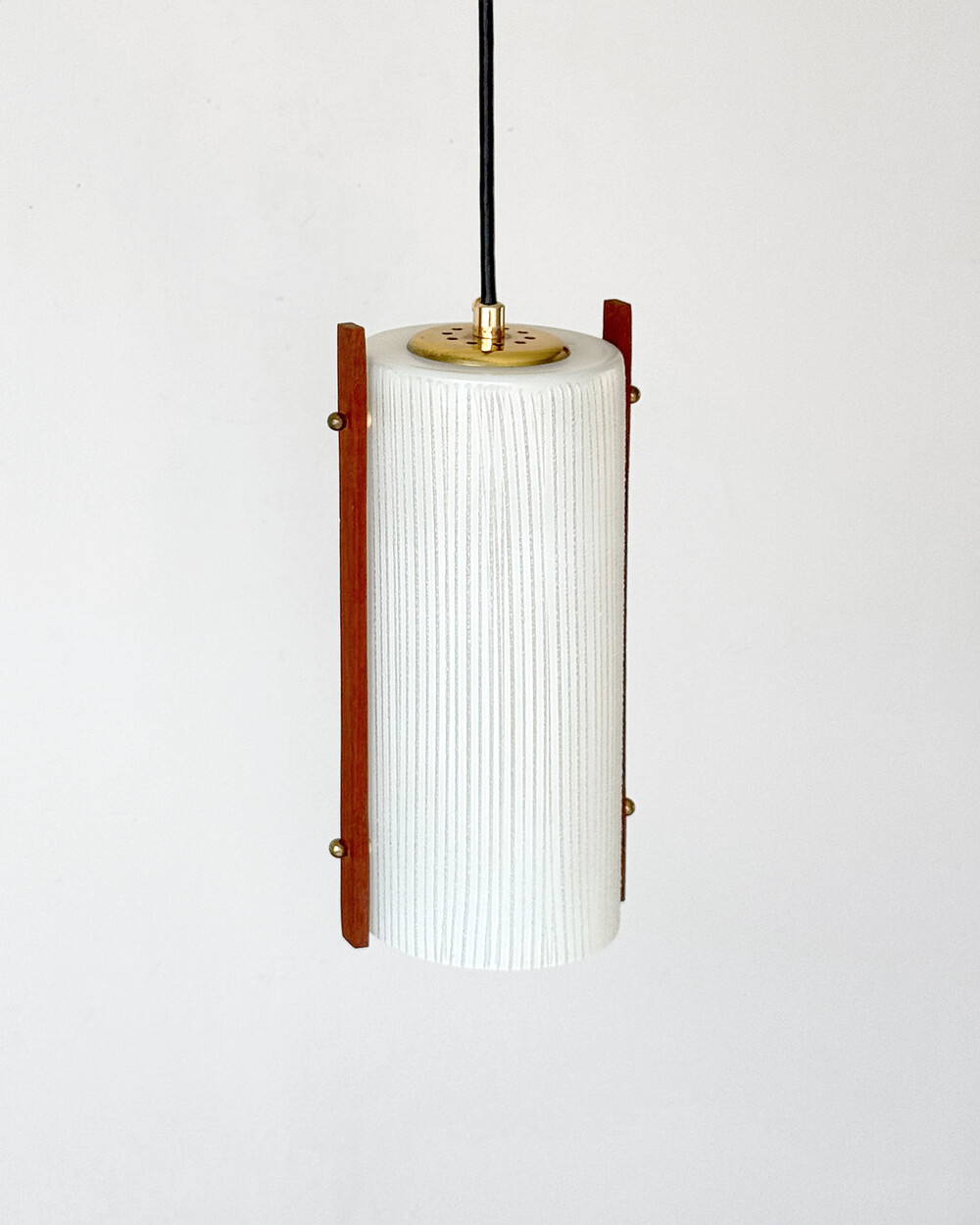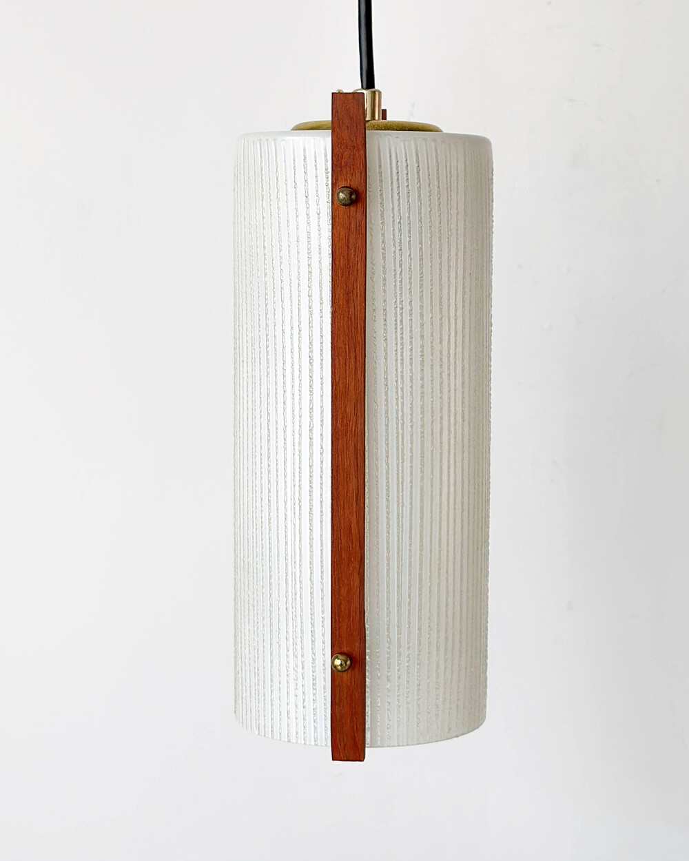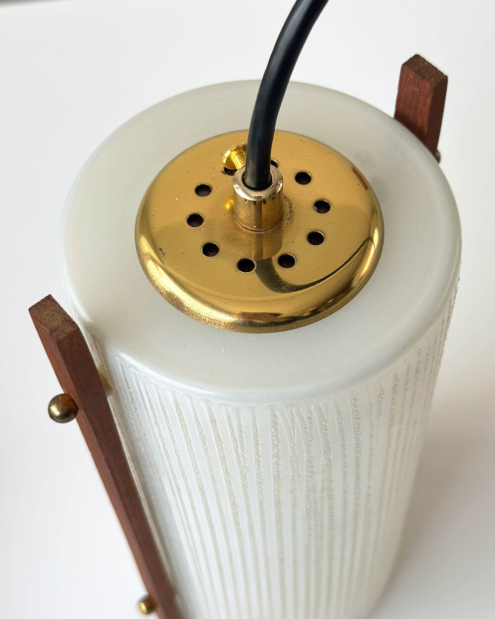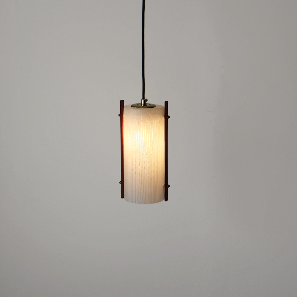 티크 우드 장식과 세로 패턴의 텍스처드 글라스가 조합된 1960년대 독일 펜던트 램프입니다. 점등 시 빛이 글라스 결을 따라 부드럽게 퍼지며, 작은 공간이나 식탁 위에 차분한 분위기를 더합니다.