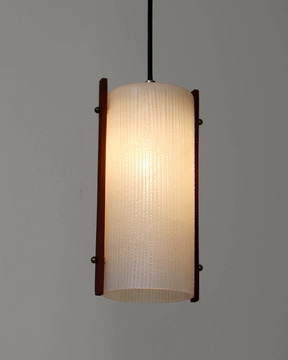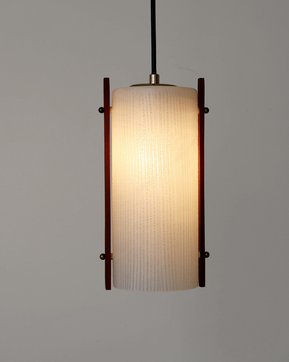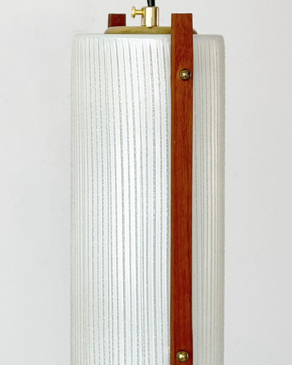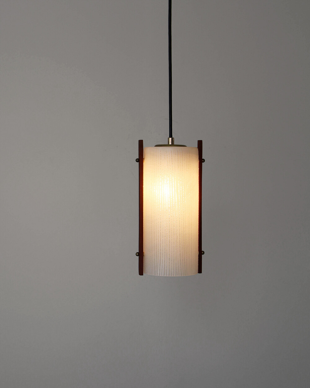 티크 우드 장식과 세로 패턴의 텍스처드 글라스가 조합된 1960년대 독일 펜던트 램프입니다. 점등 시 빛이 글라스 결을 따라 부드럽게 퍼지며, 작은 공간이나 식탁 위에 차분한 분위기를 더합니다.