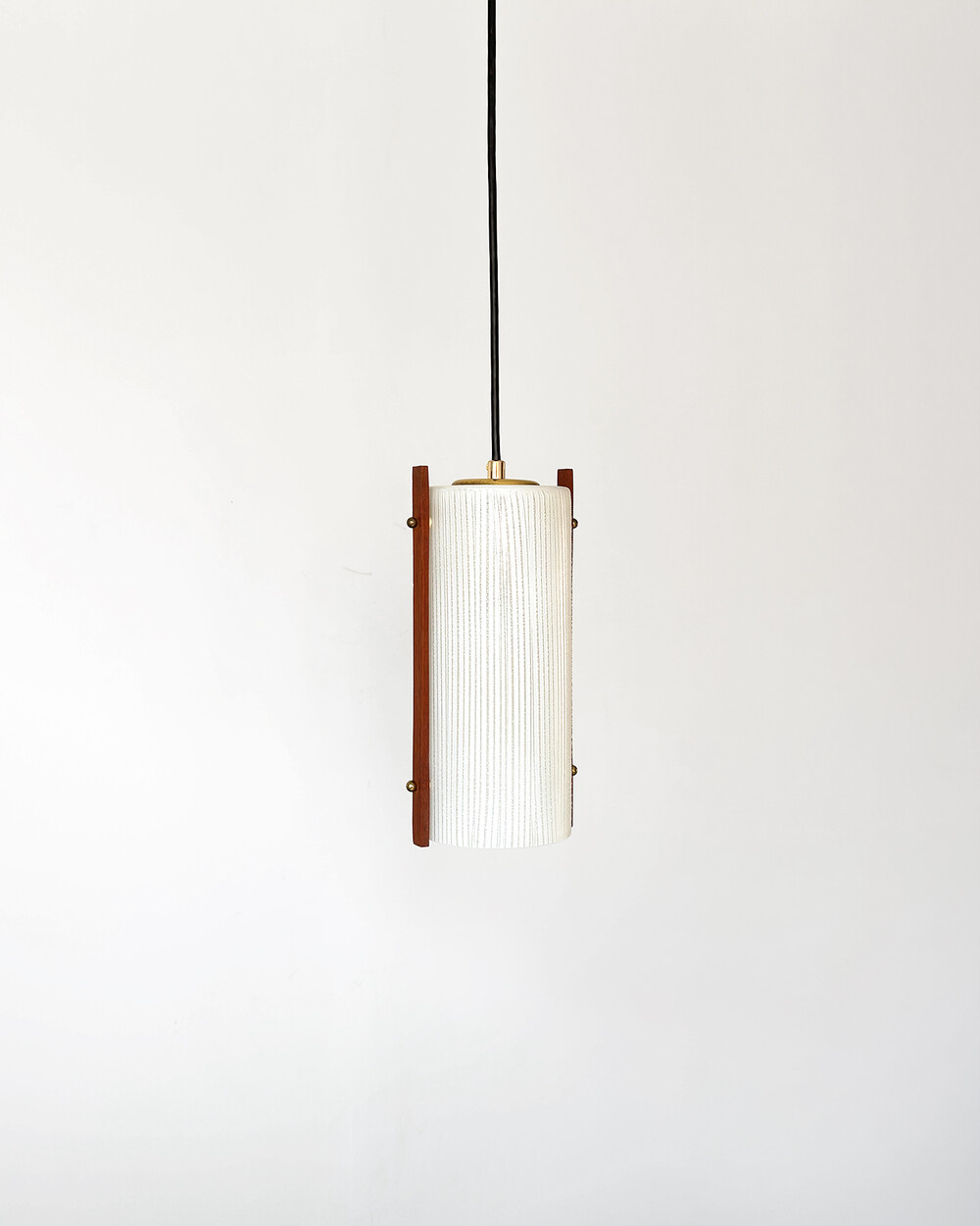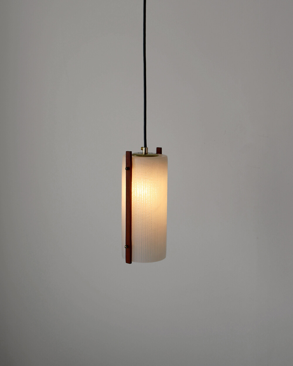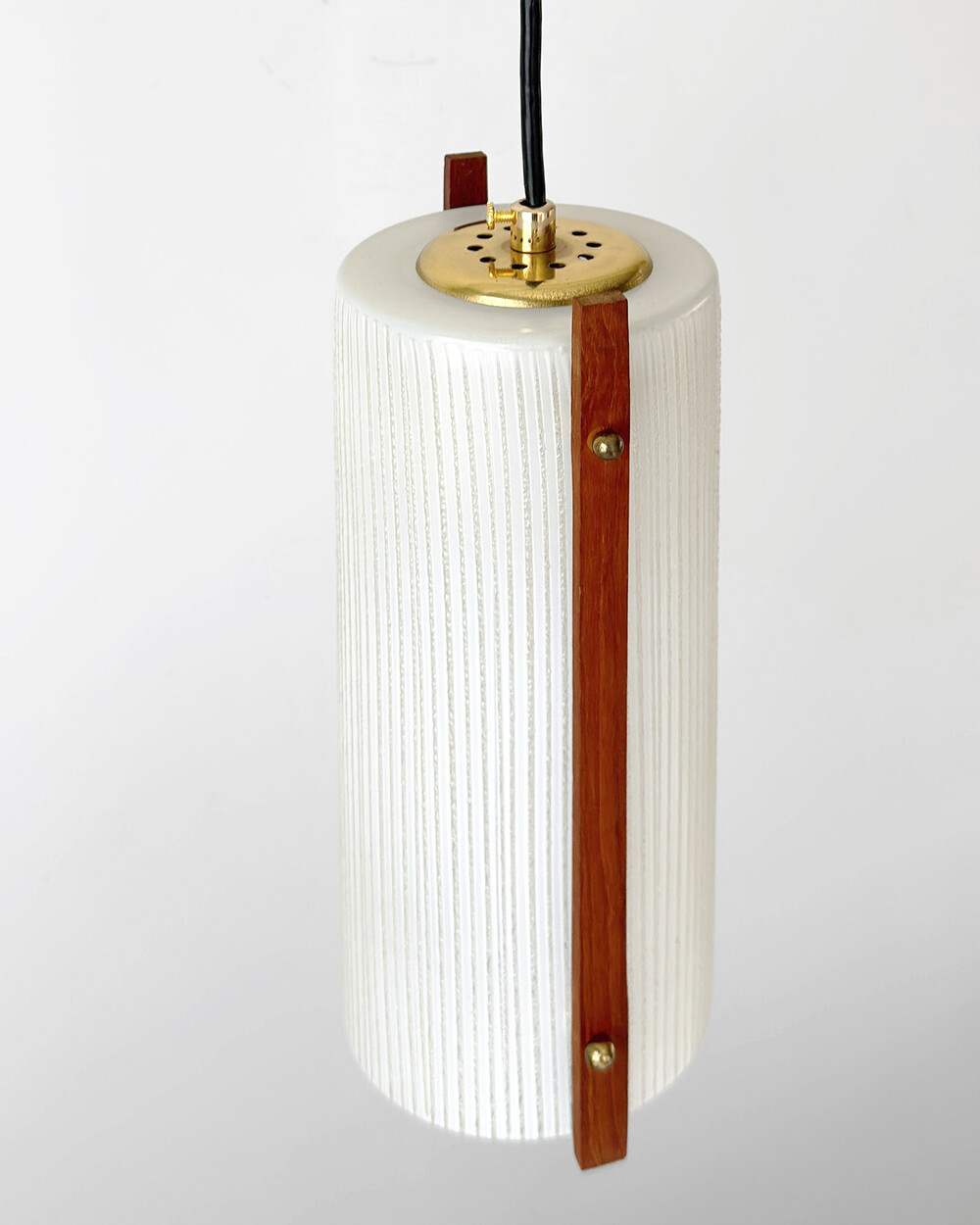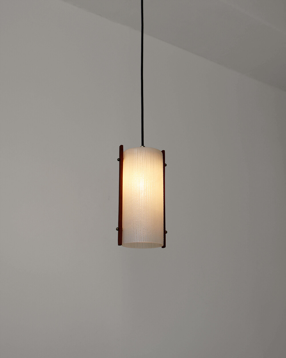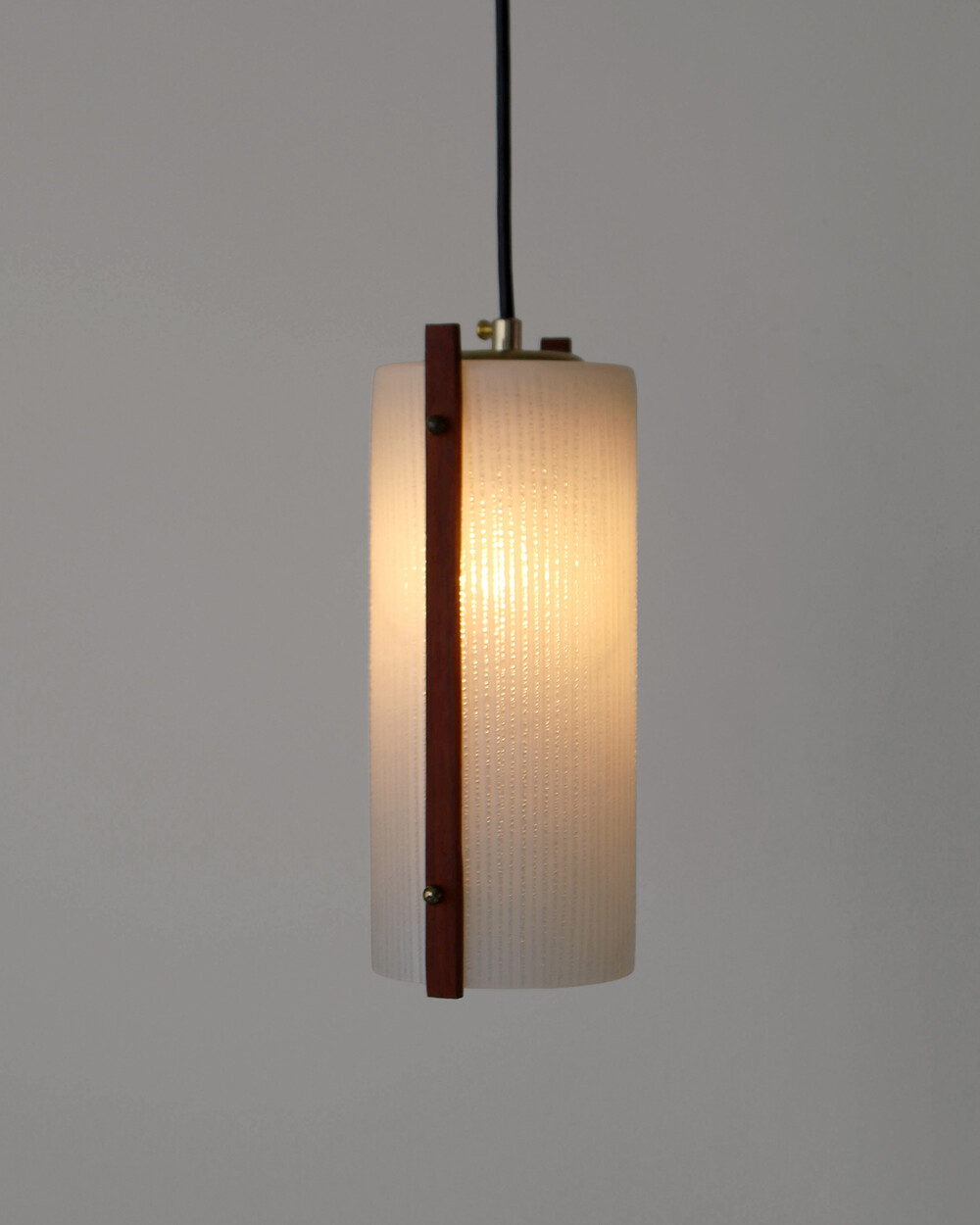 티크 우드 장식과 세로 패턴의 텍스처드 글라스가 조합된 1960년대 독일 펜던트 램프입니다. 점등 시 빛이 글라스 결을 따라 부드럽게 퍼지며, 작은 공간이나 식탁 위에 차분한 분위기를 더합니다.