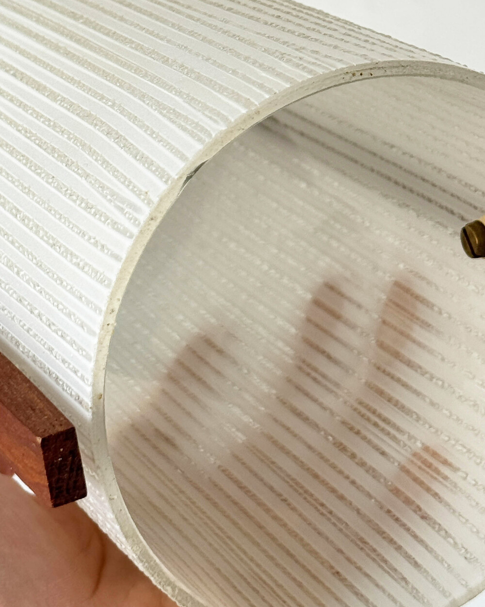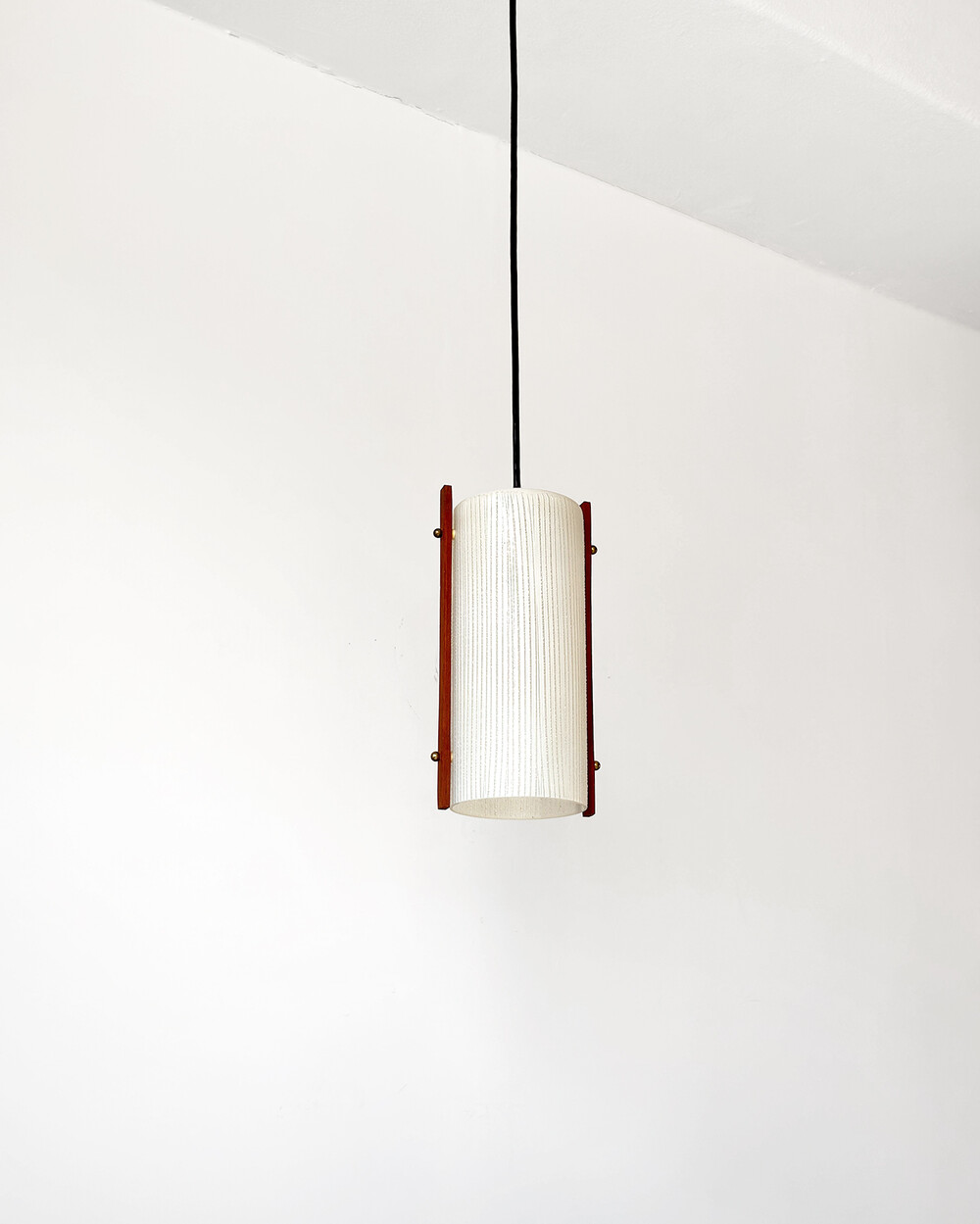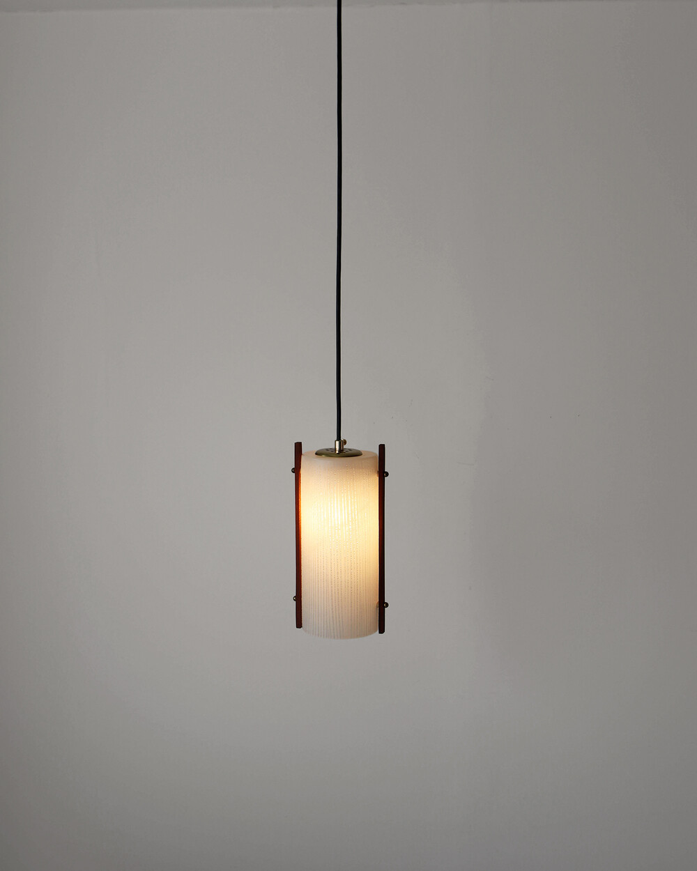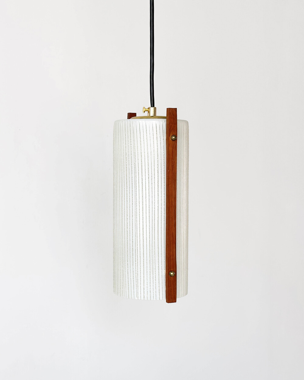 티크 우드 장식과 세로 패턴의 텍스처드 글라스가 조합된 1960년대 독일 펜던트 램프입니다. 점등 시 빛이 글라스 결을 따라 부드럽게 퍼지며, 작은 공간이나 식탁 위에 차분한 분위기를 더합니다.