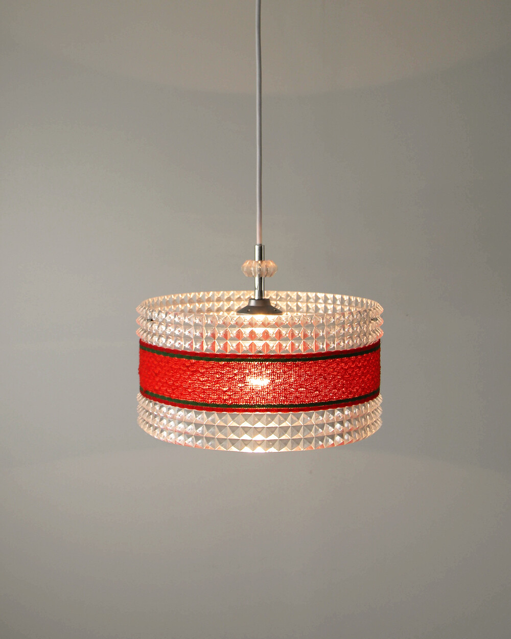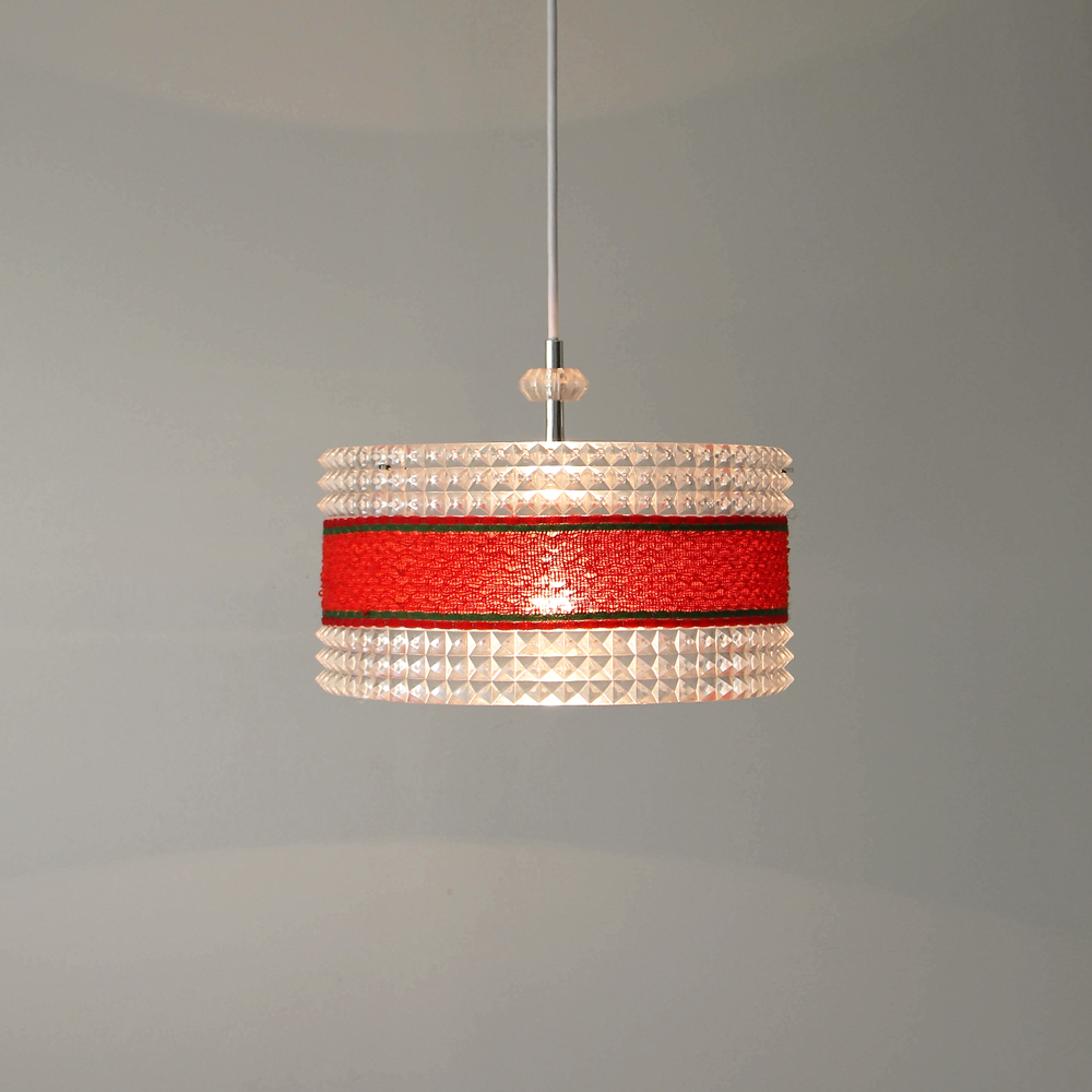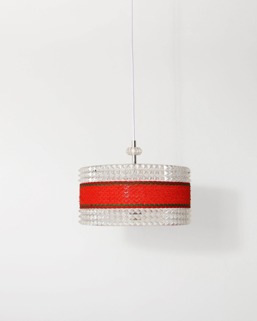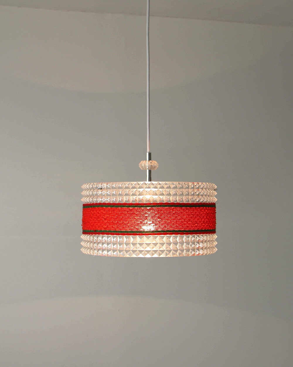 레드 패브릭 밴드 장식이 더해진 플렉시글라스 펜던트 조명으로, 1925년 독일에서 설립된 조명 회사 Marbach Leuchten에서 1970년대 제작되었습니다.
