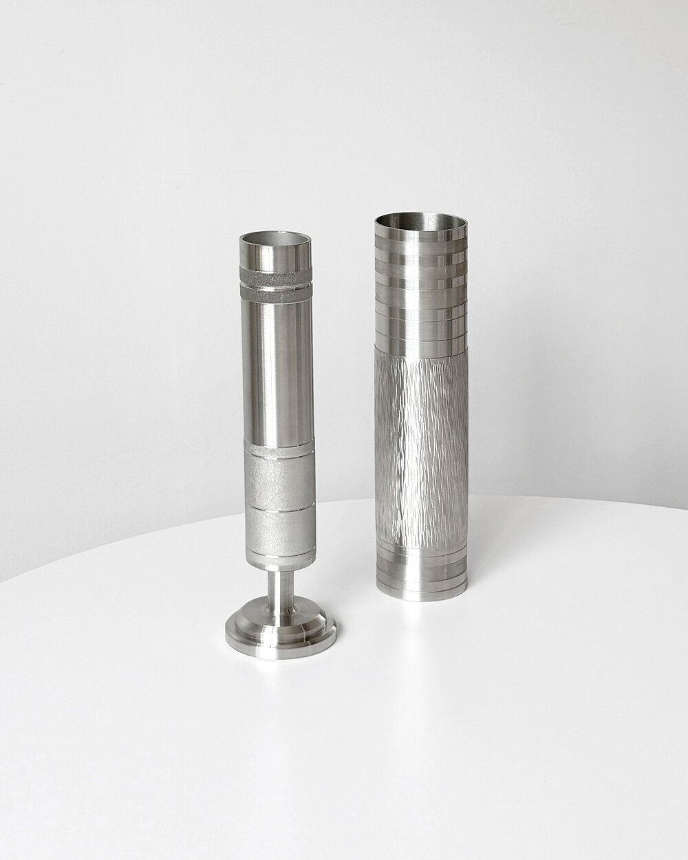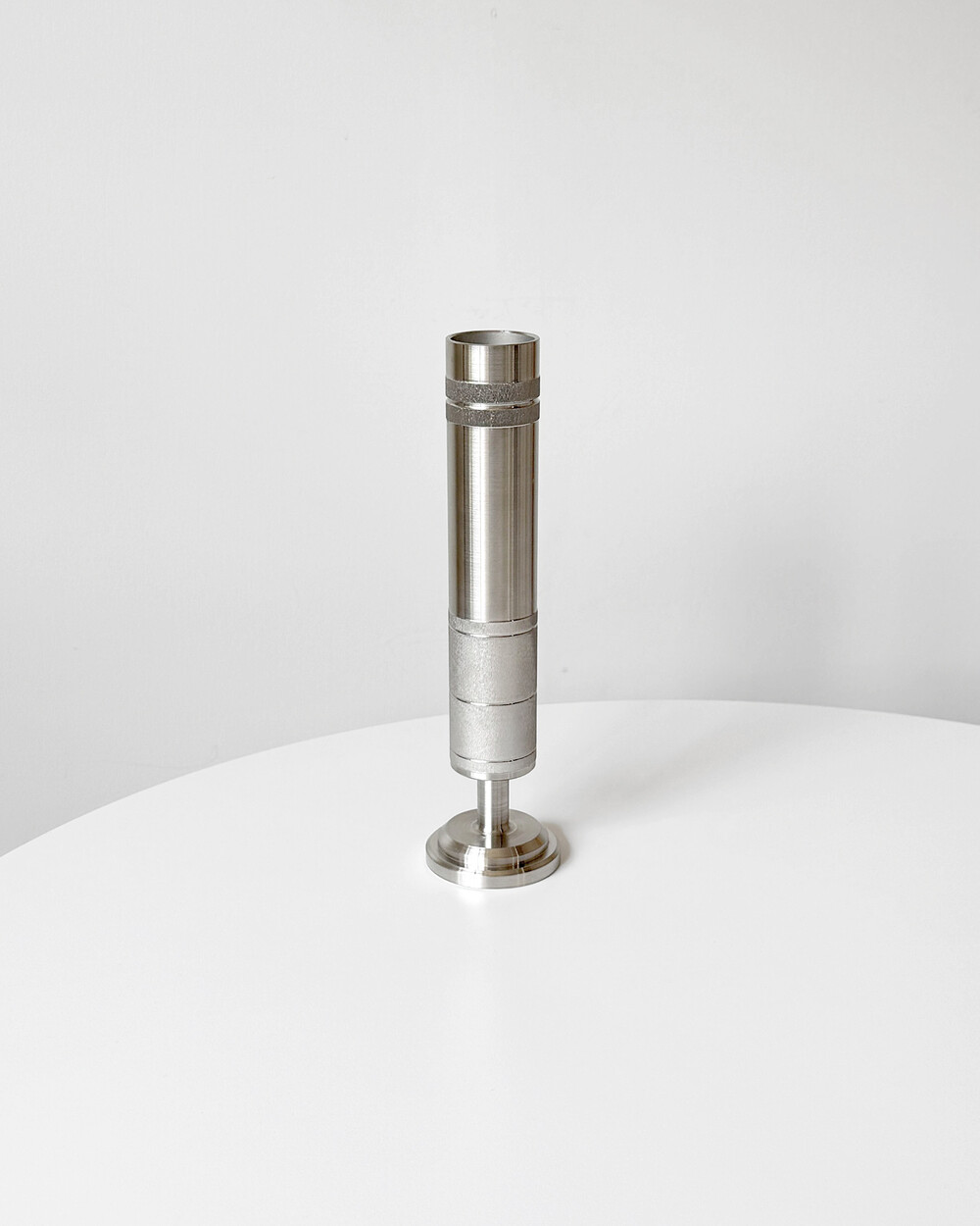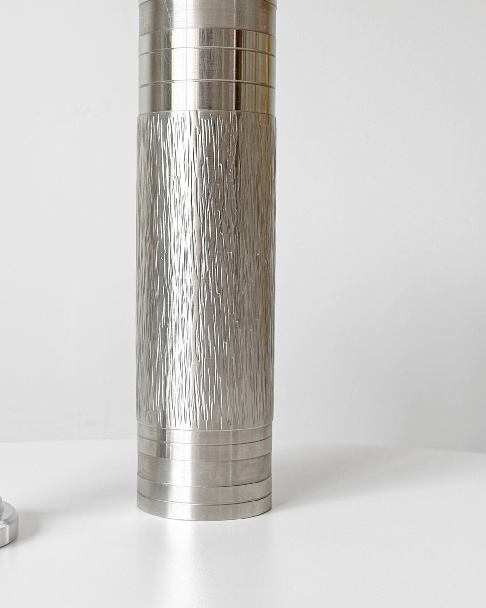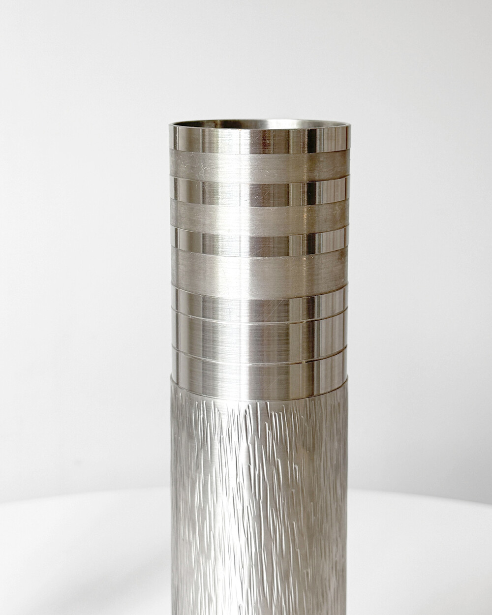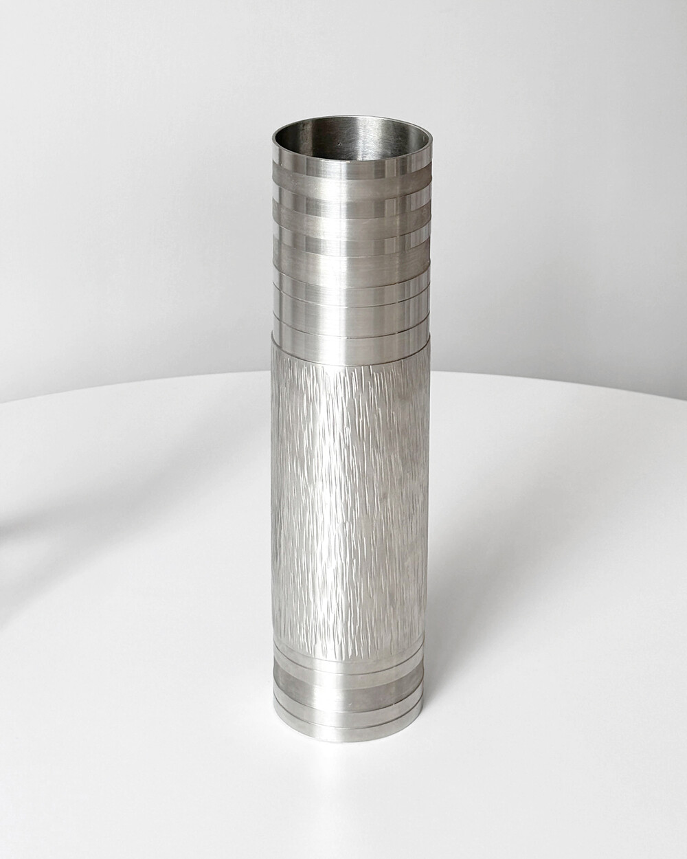 건축 양식에서 비롯된 구조적 아름다움과 금속성이 어우러진 브루탈리스트 스타일의 메탈 실린더 화병입니다. 1970년대 서독의 금속공예 브랜드 BMF(Bayerische Metallwarenfabrik)에서 기능성과 실험적 디자인을 결합해 선보인 오브제입니다.