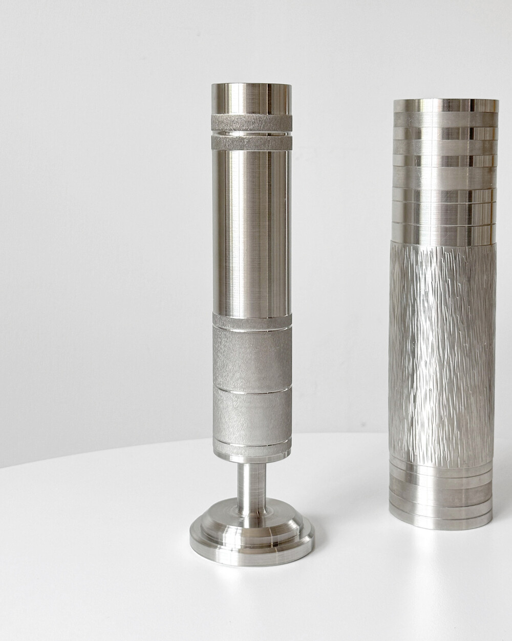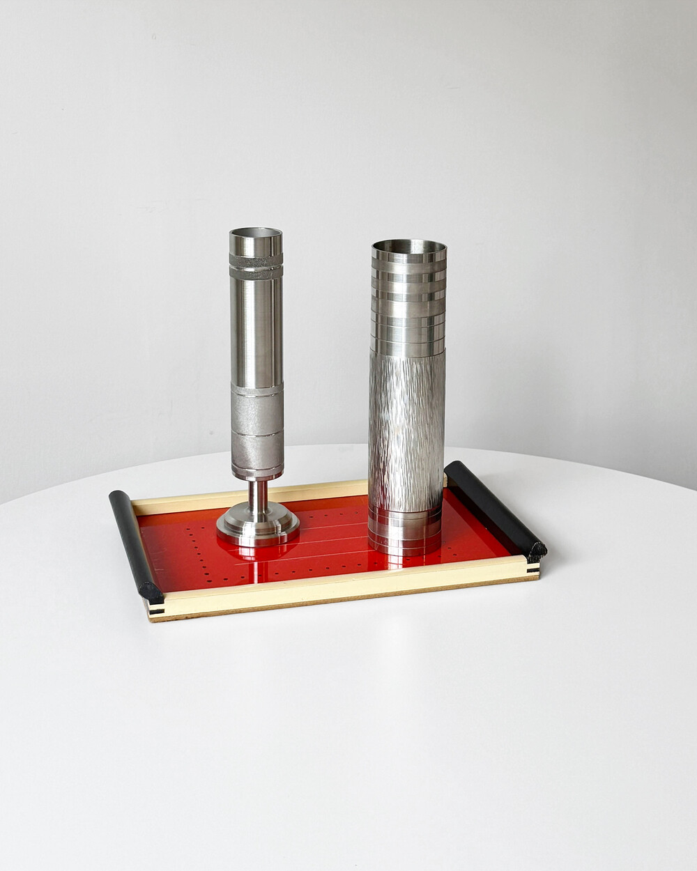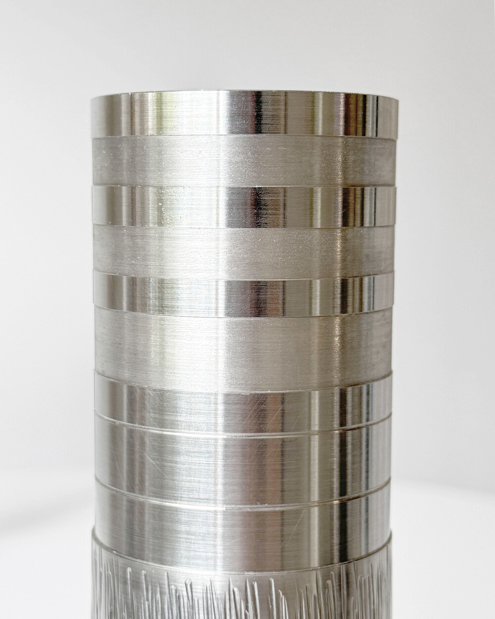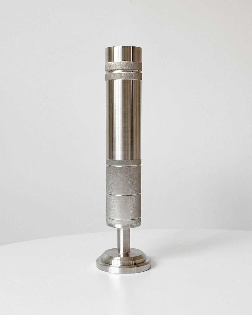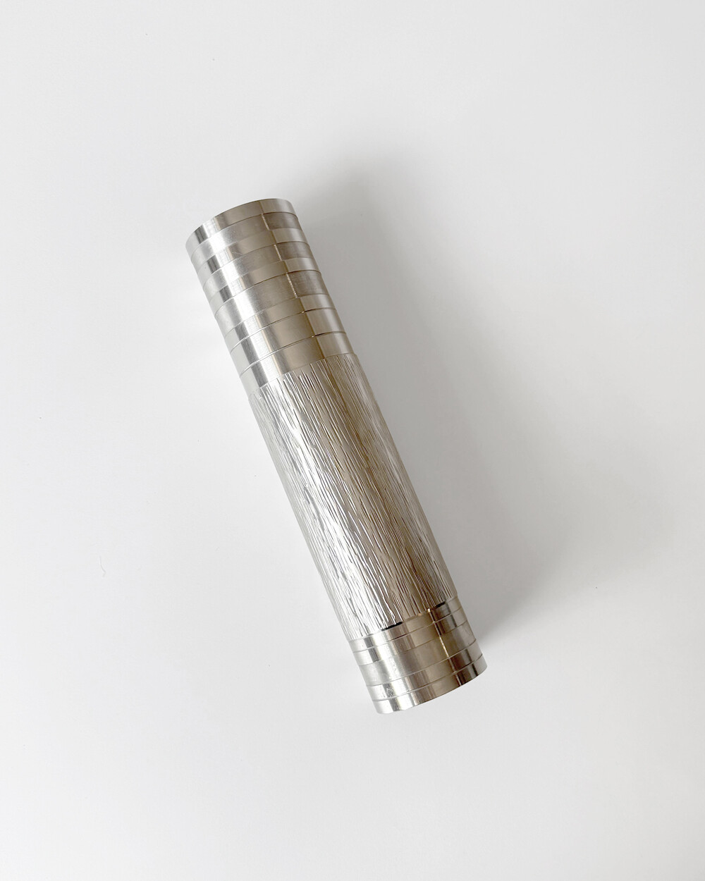 건축 양식에서 비롯된 구조적 아름다움과 금속성이 어우러진 브루탈리스트 스타일의 메탈 실린더 화병입니다. 1970년대 서독의 금속공예 브랜드 BMF(Bayerische Metallwarenfabrik)에서 기능성과 실험적 디자인을 결합해 선보인 오브제입니다.