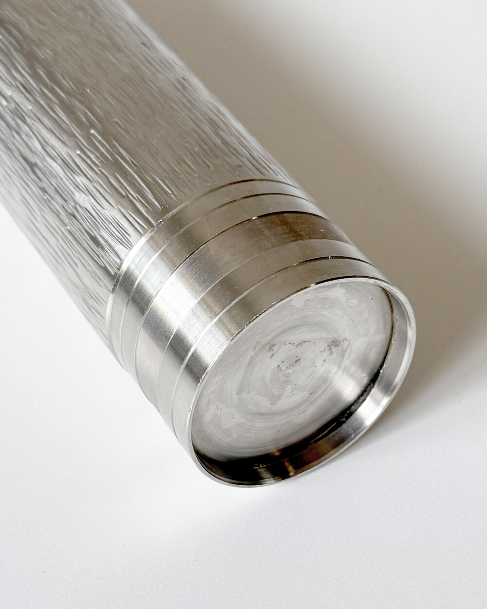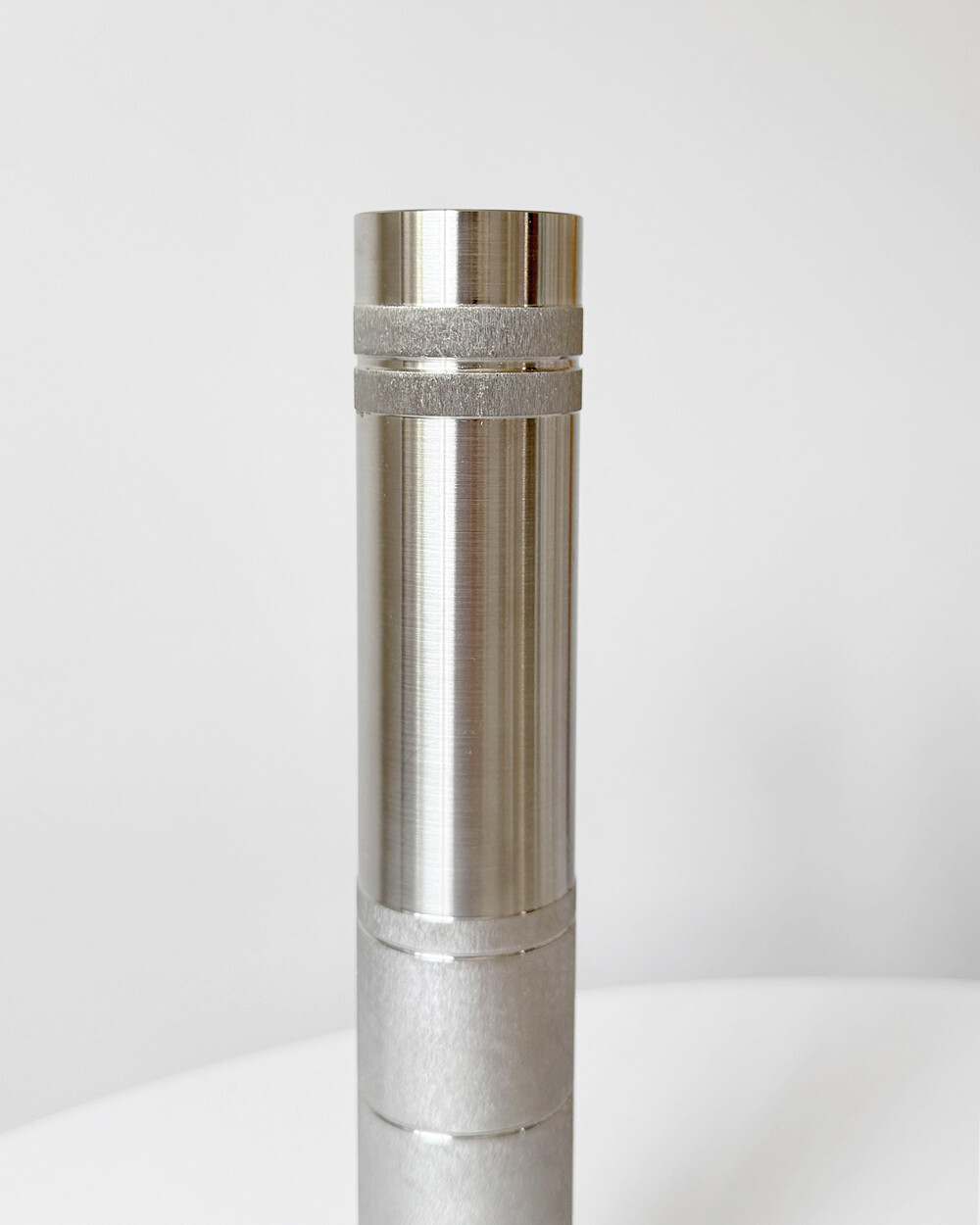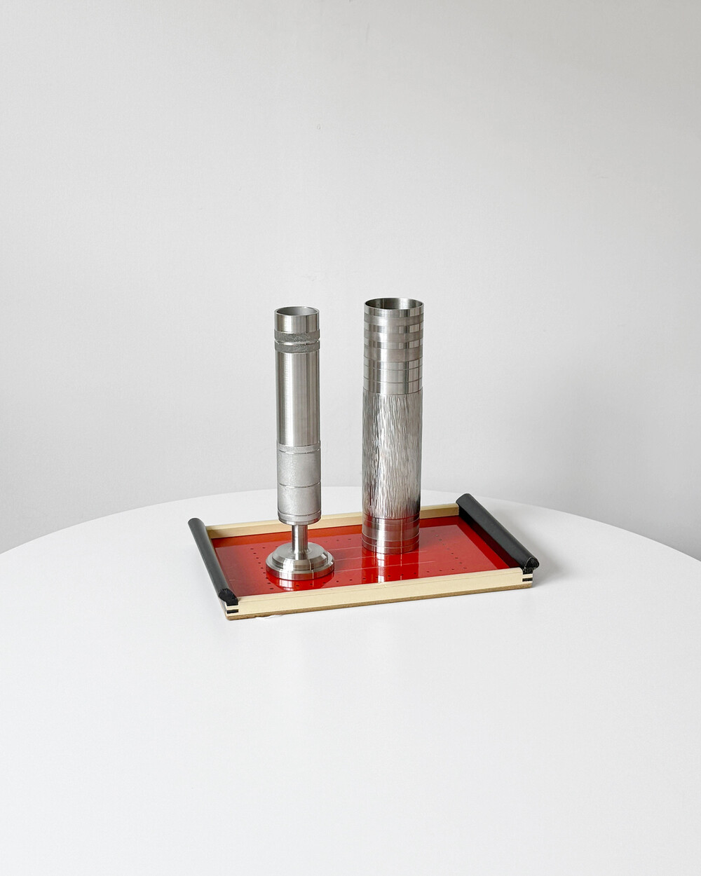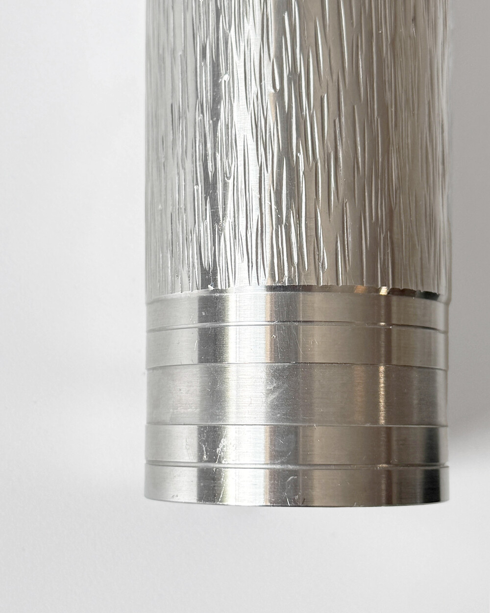 건축 양식에서 비롯된 구조적 아름다움과 금속성이 어우러진 브루탈리스트 스타일의 메탈 실린더 화병입니다. 1970년대 서독의 금속공예 브랜드 BMF(Bayerische Metallwarenfabrik)에서 기능성과 실험적 디자인을 결합해 선보인 오브제입니다.