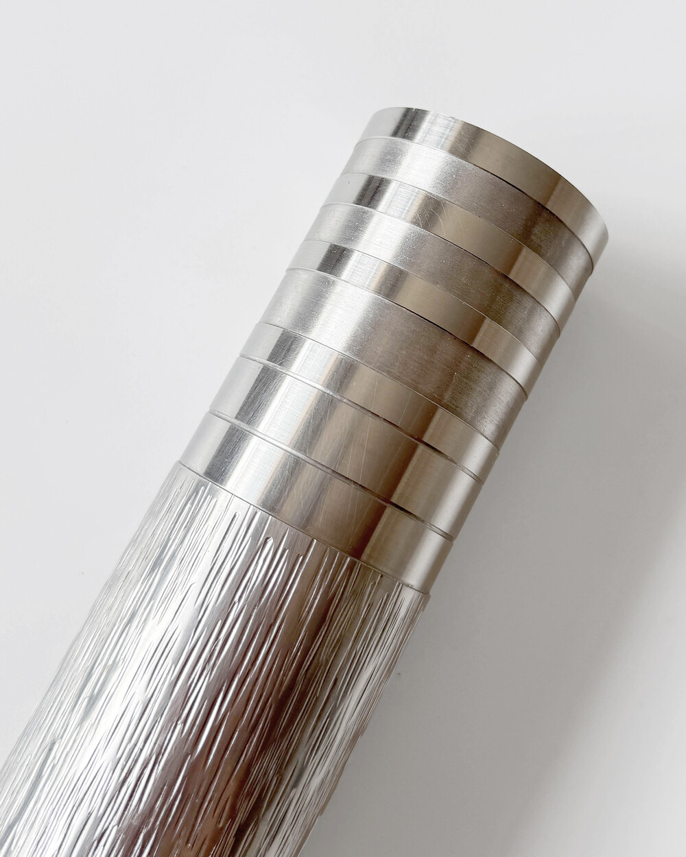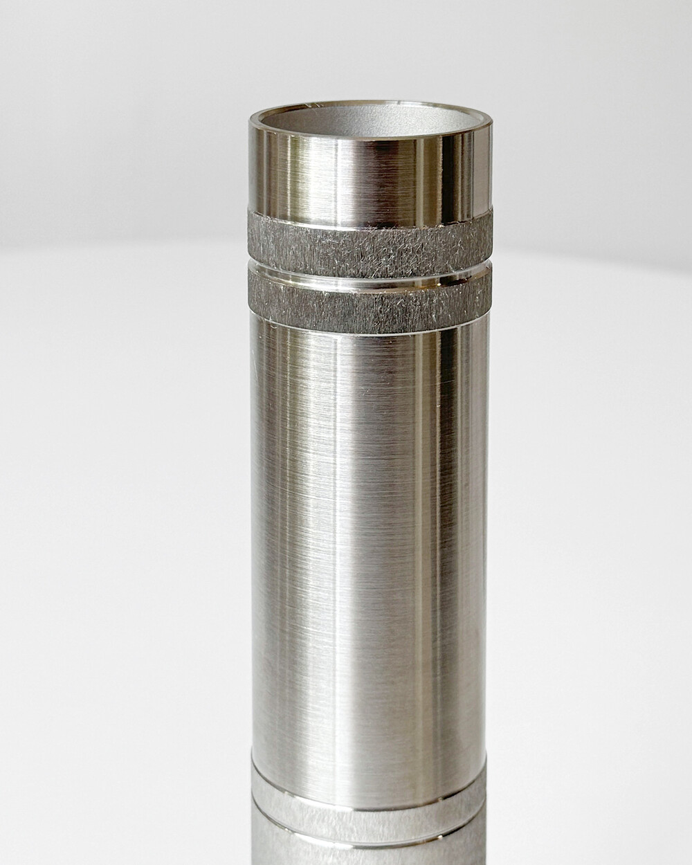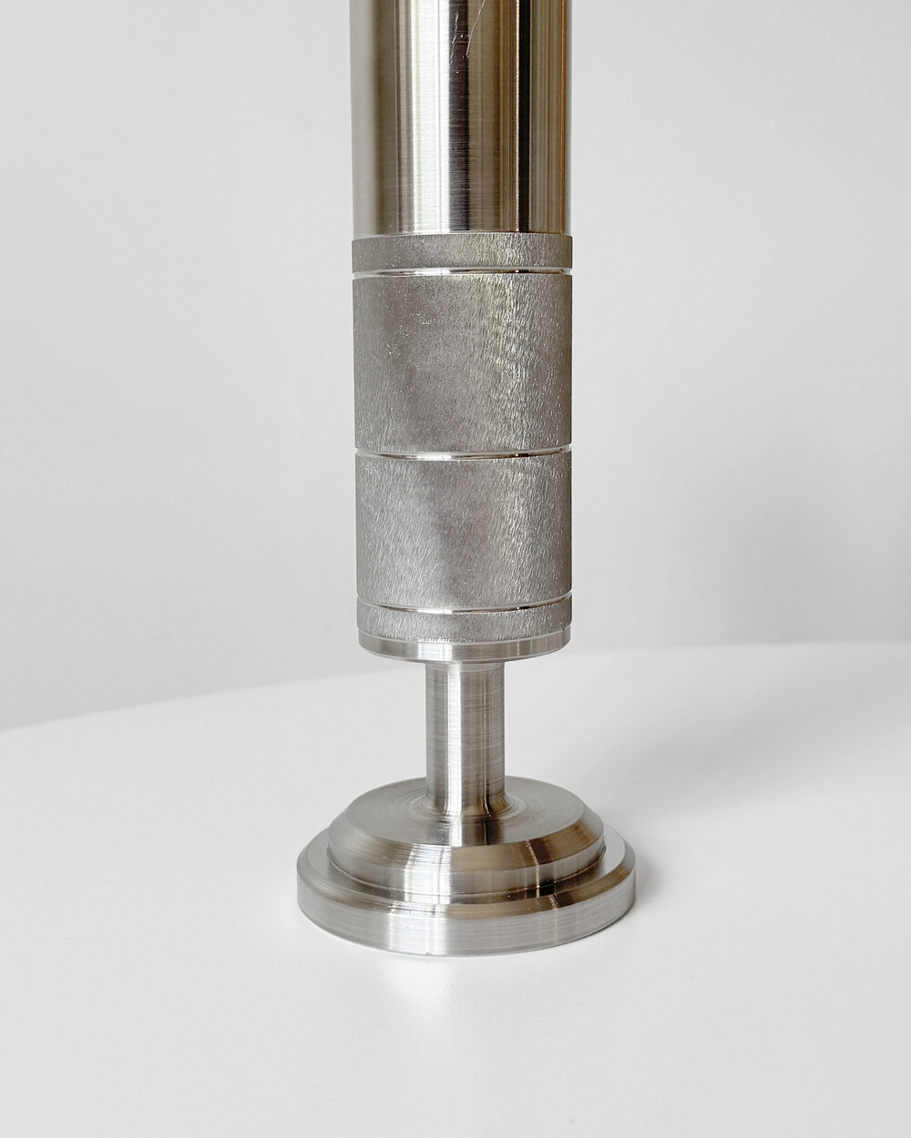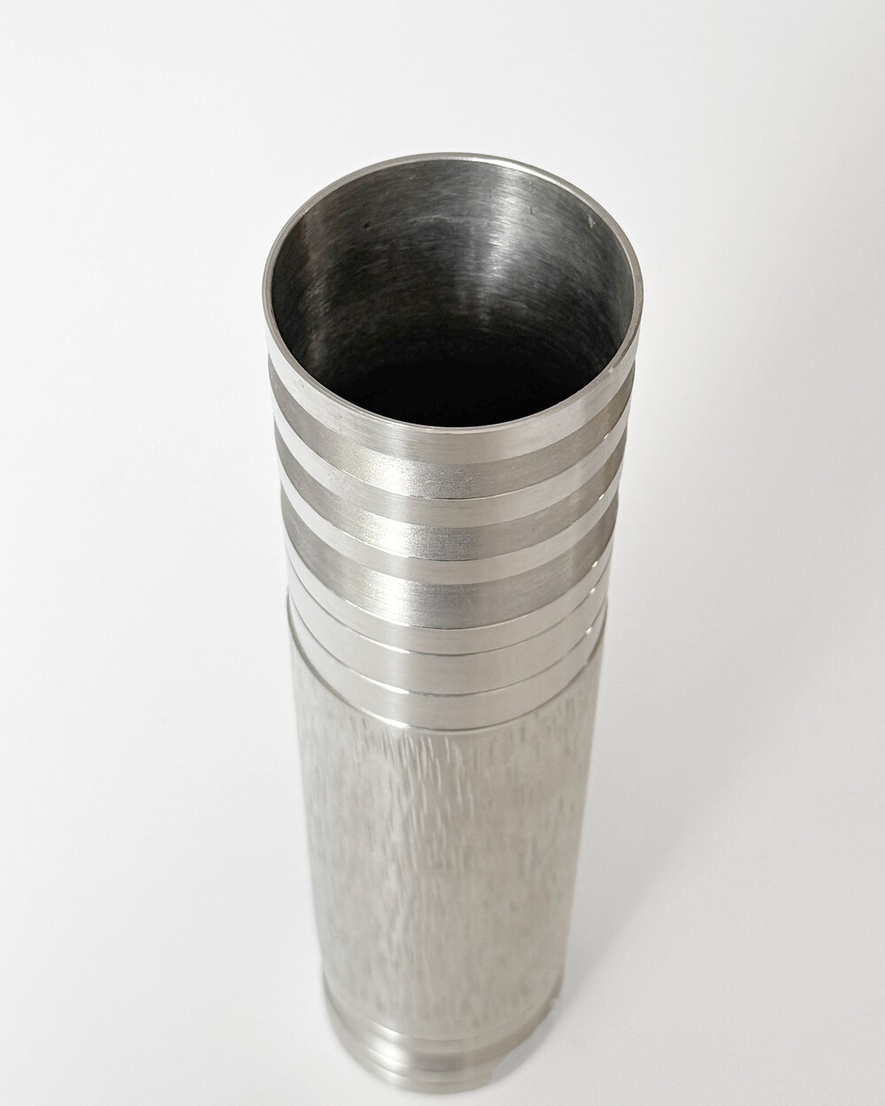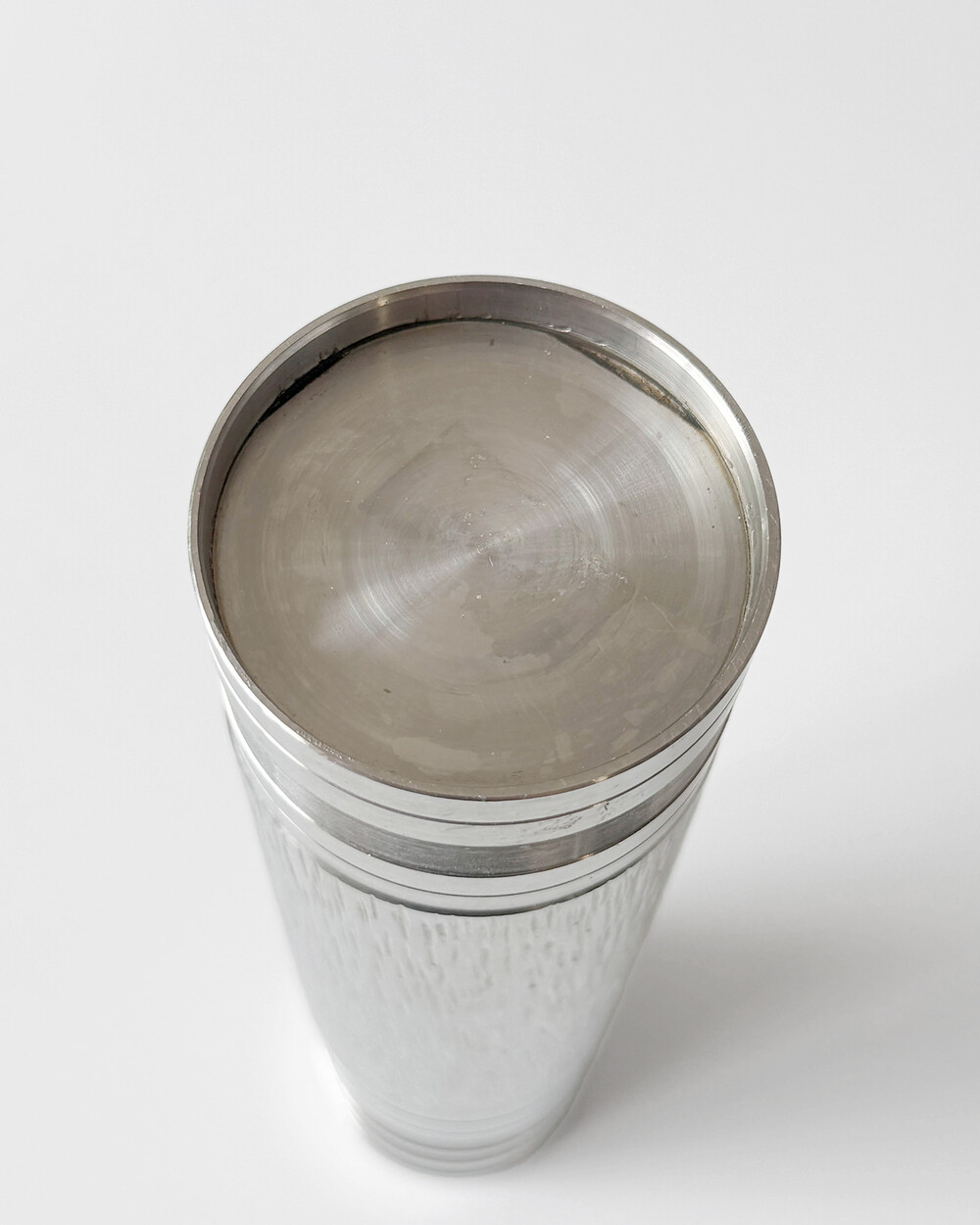 건축 양식에서 비롯된 구조적 아름다움과 금속성이 어우러진 브루탈리스트 스타일의 메탈 실린더 화병입니다. 1970년대 서독의 금속공예 브랜드 BMF(Bayerische Metallwarenfabrik)에서 기능성과 실험적 디자인을 결합해 선보인 오브제입니다.