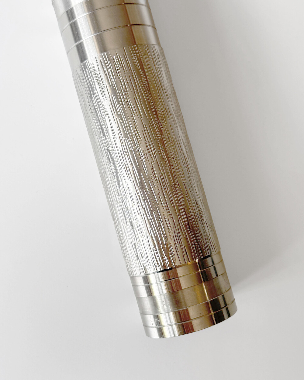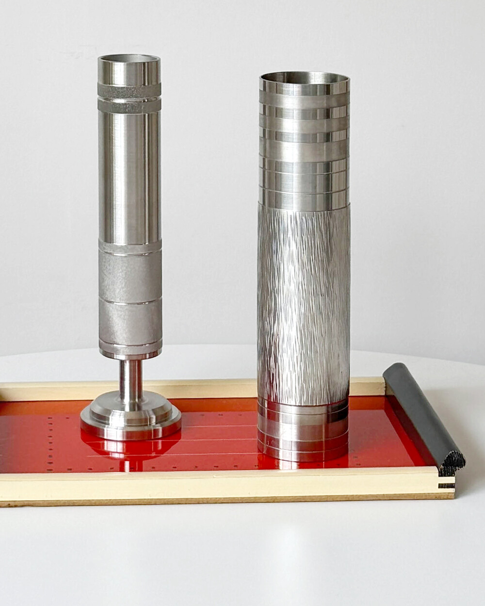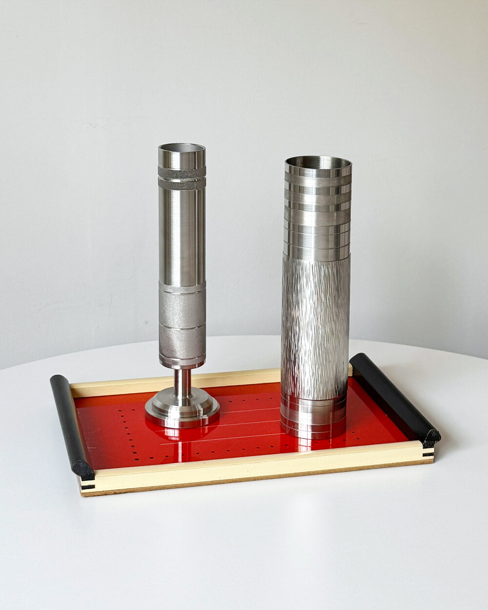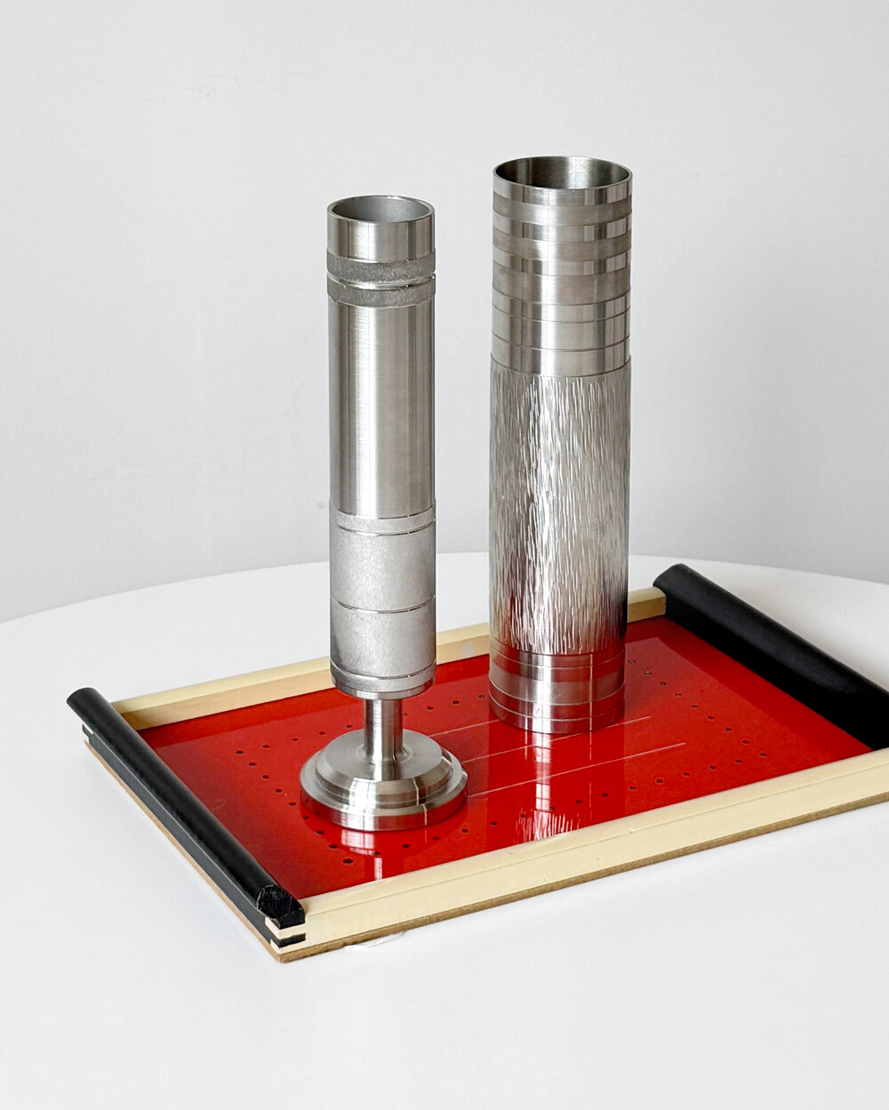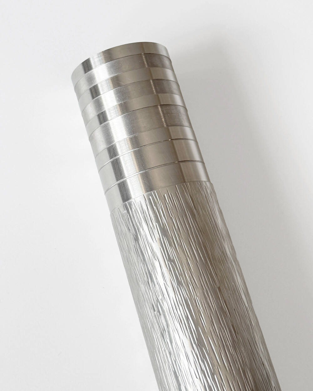 건축 양식에서 비롯된 구조적 아름다움과 금속성이 어우러진 브루탈리스트 스타일의 메탈 실린더 화병입니다. 1970년대 서독의 금속공예 브랜드 BMF(Bayerische Metallwarenfabrik)에서 기능성과 실험적 디자인을 결합해 선보인 오브제입니다.