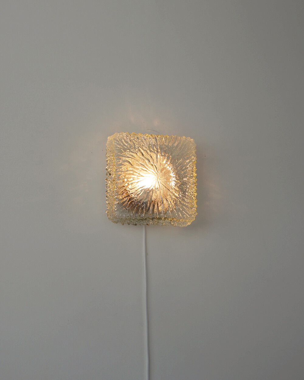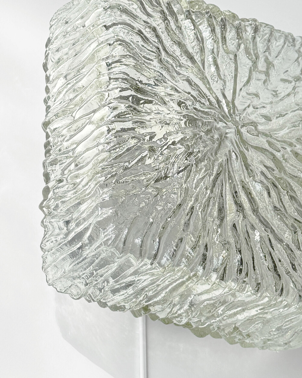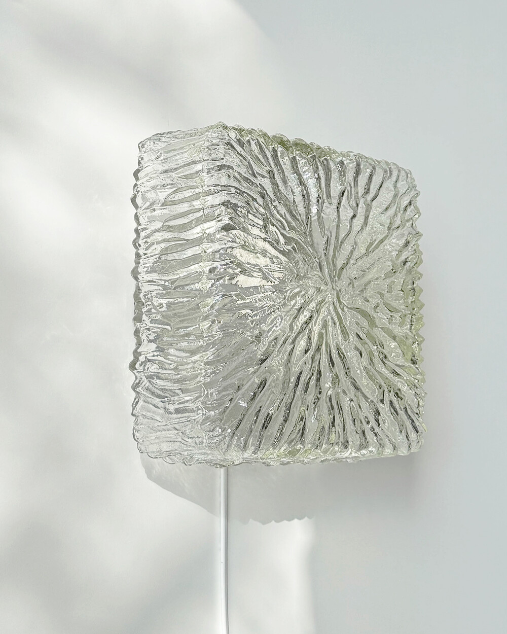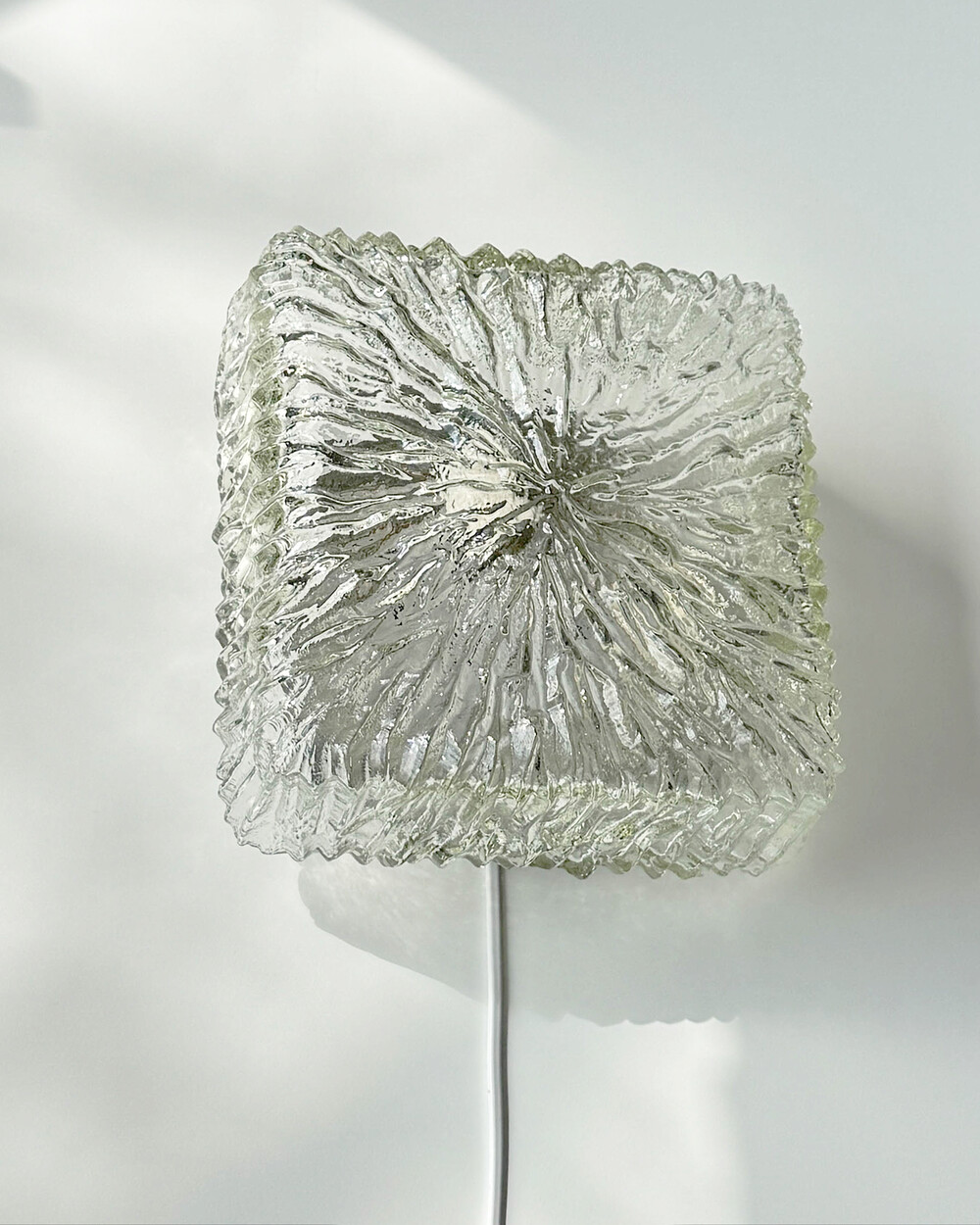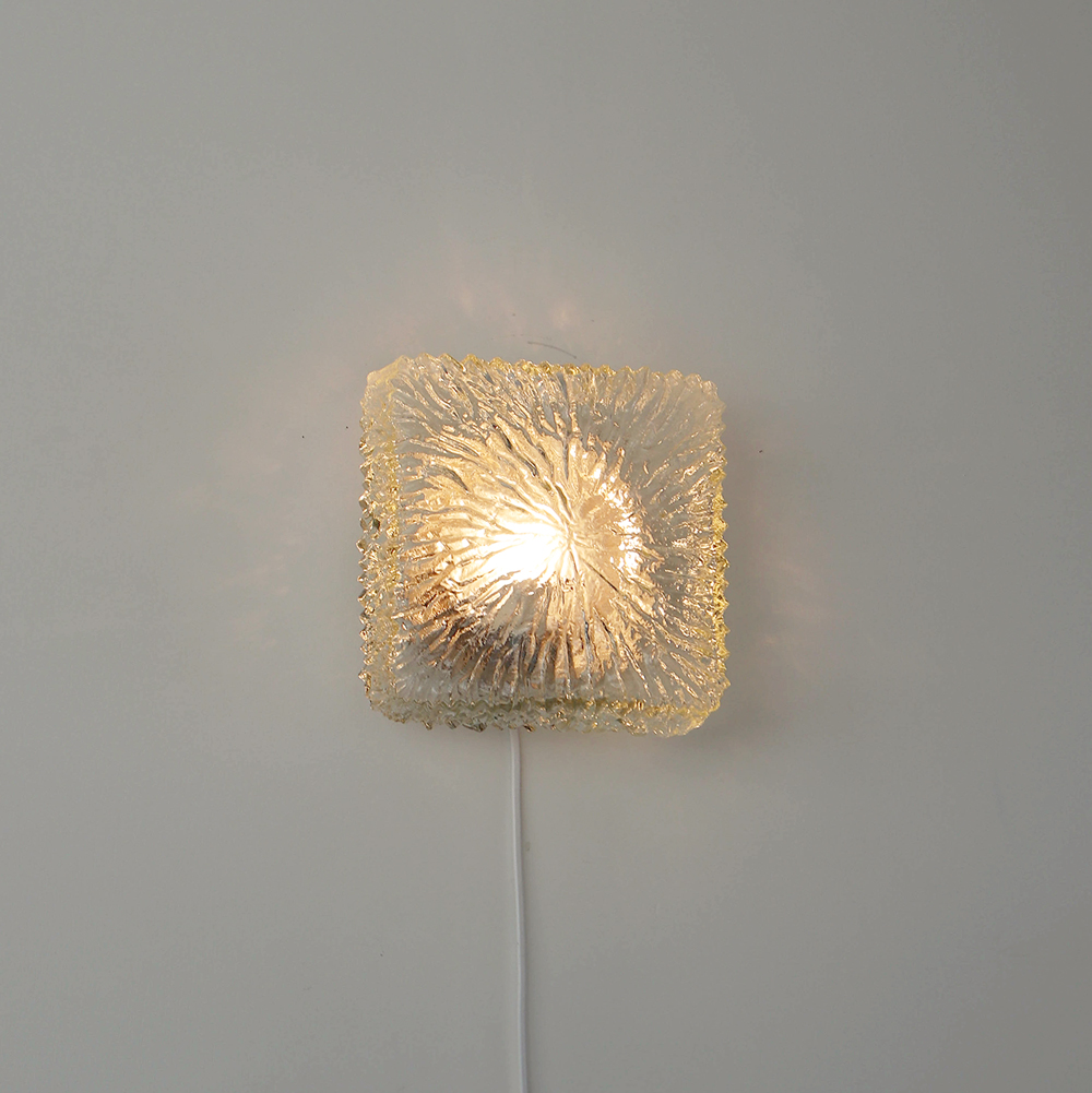 세밀한 주름 텍스처가 돋보이는 스퀘어 글라스 조명으로, 1970년대 독일에서 제작되었습니다. 점등 시 벽면에 풍부한 빛의 그림자를 드리우며, 공간에 섬세한 아름다움을 더해주는 오브제입니다. 벽과 천장에 설치하거나 테이블 조명으로 사용할 수 있습니다.