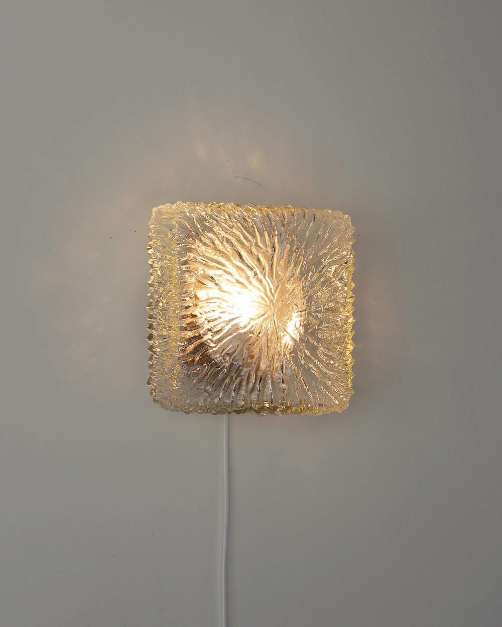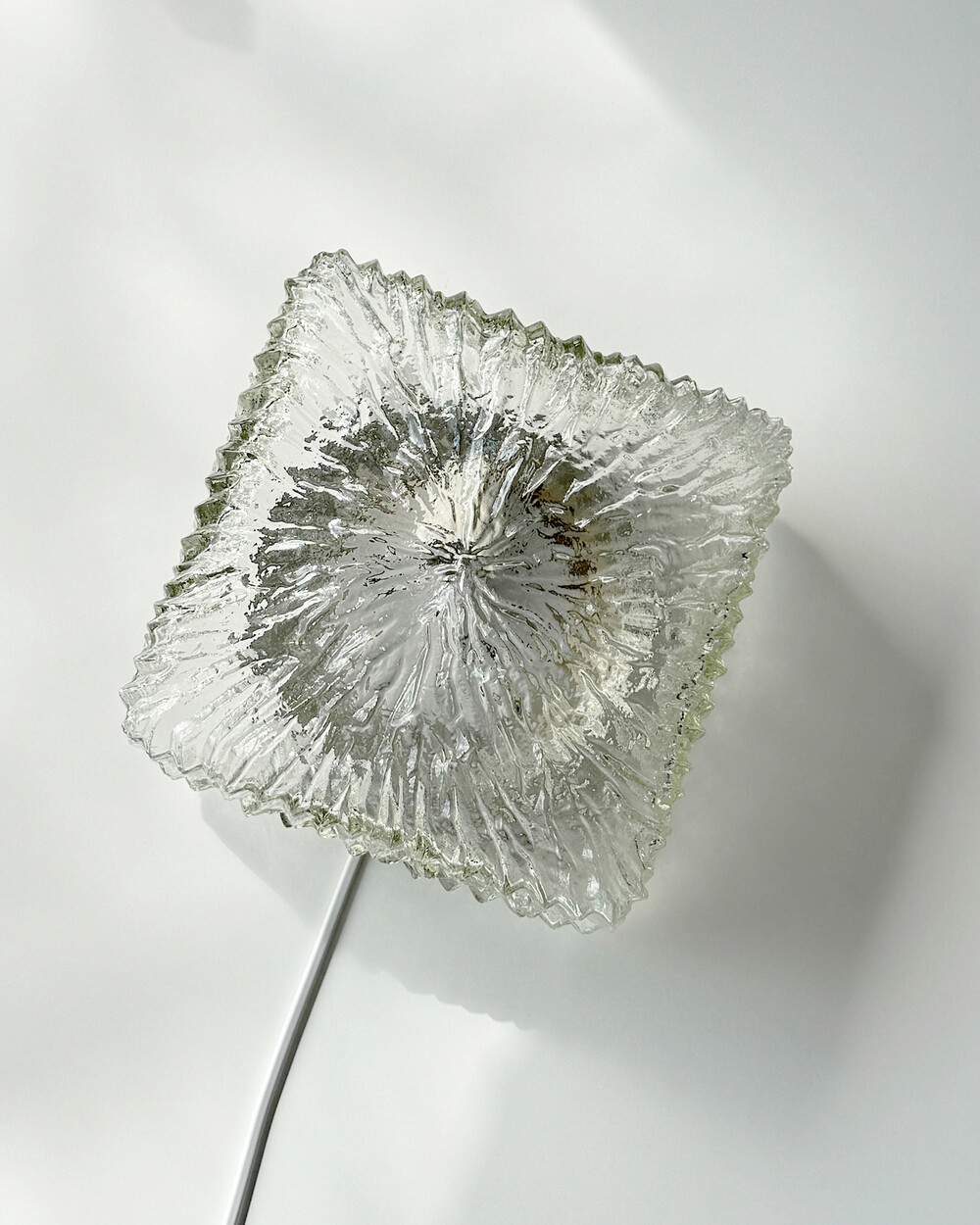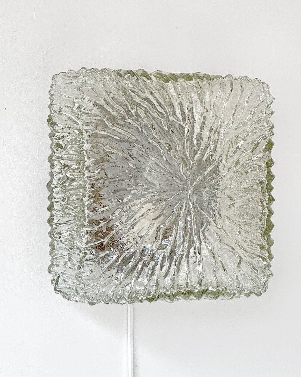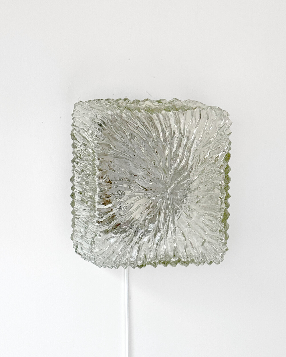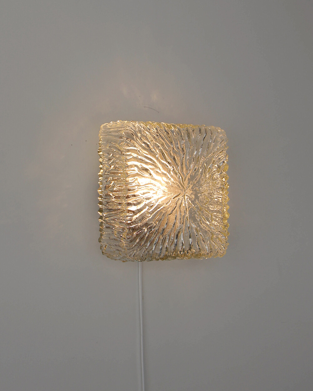 세밀한 주름 텍스처가 돋보이는 스퀘어 글라스 조명으로, 1970년대 독일에서 제작되었습니다. 점등 시 벽면에 풍부한 빛의 그림자를 드리우며, 공간에 섬세한 아름다움을 더해주는 오브제입니다. 벽과 천장에 설치하거나 테이블 조명으로 사용할 수 있습니다.