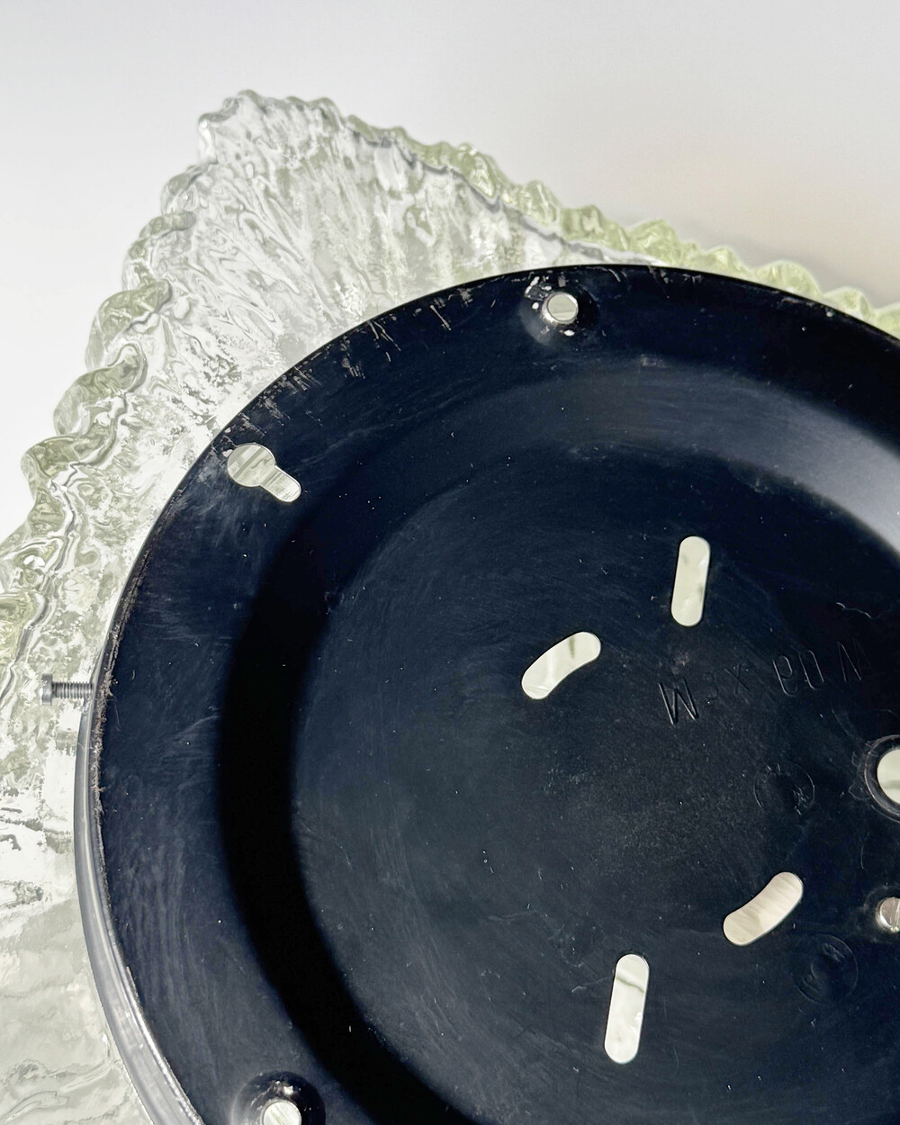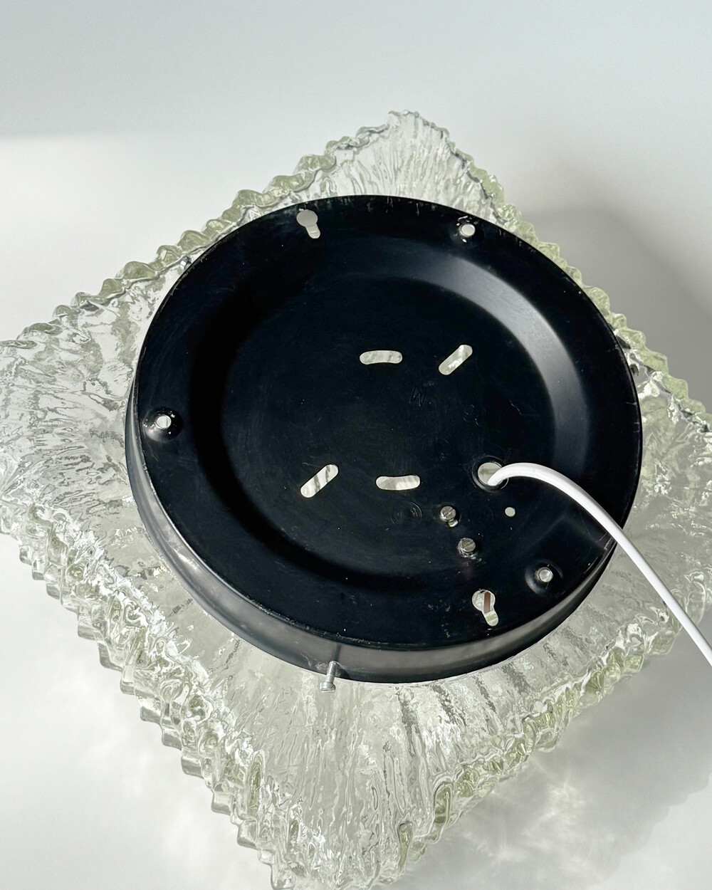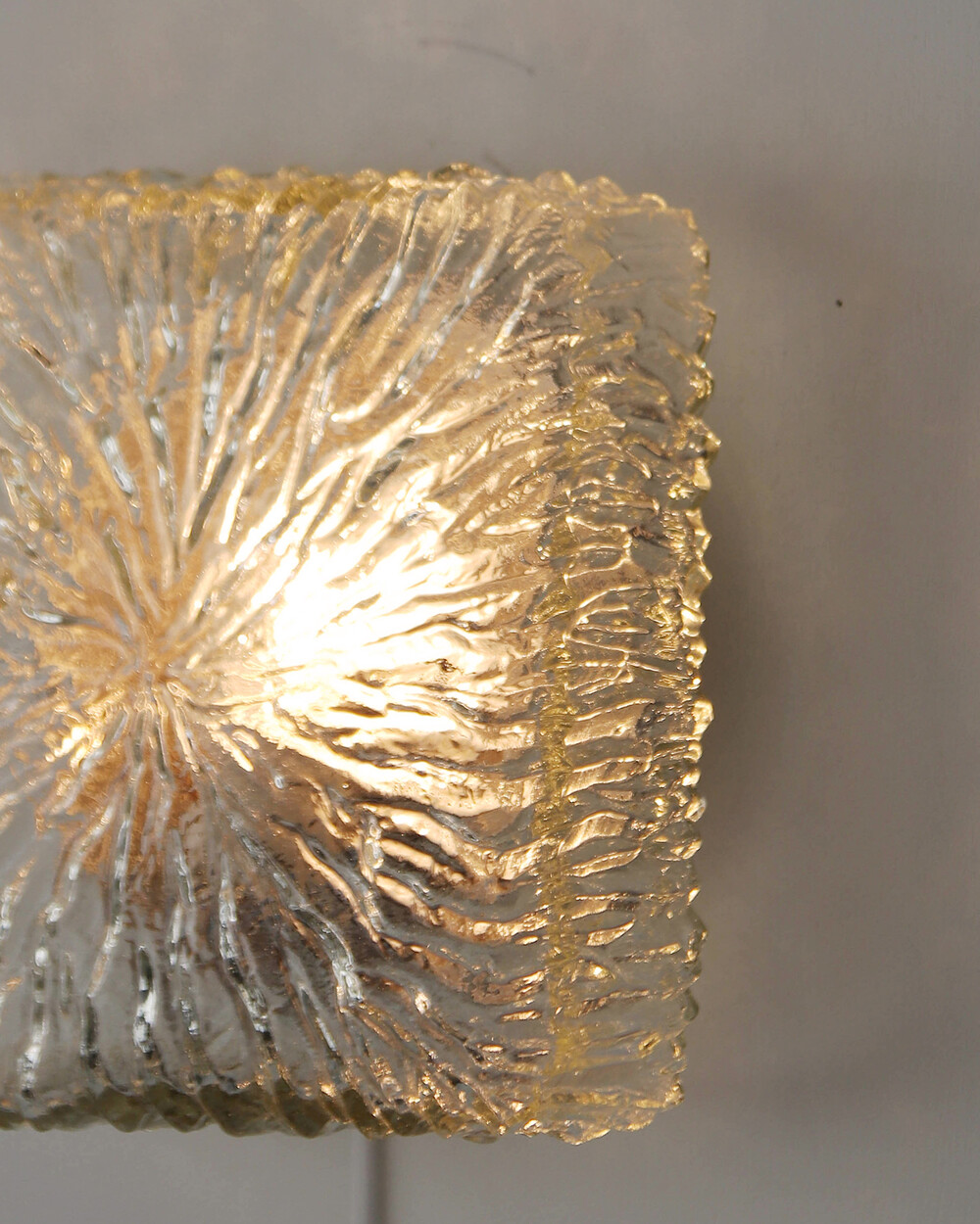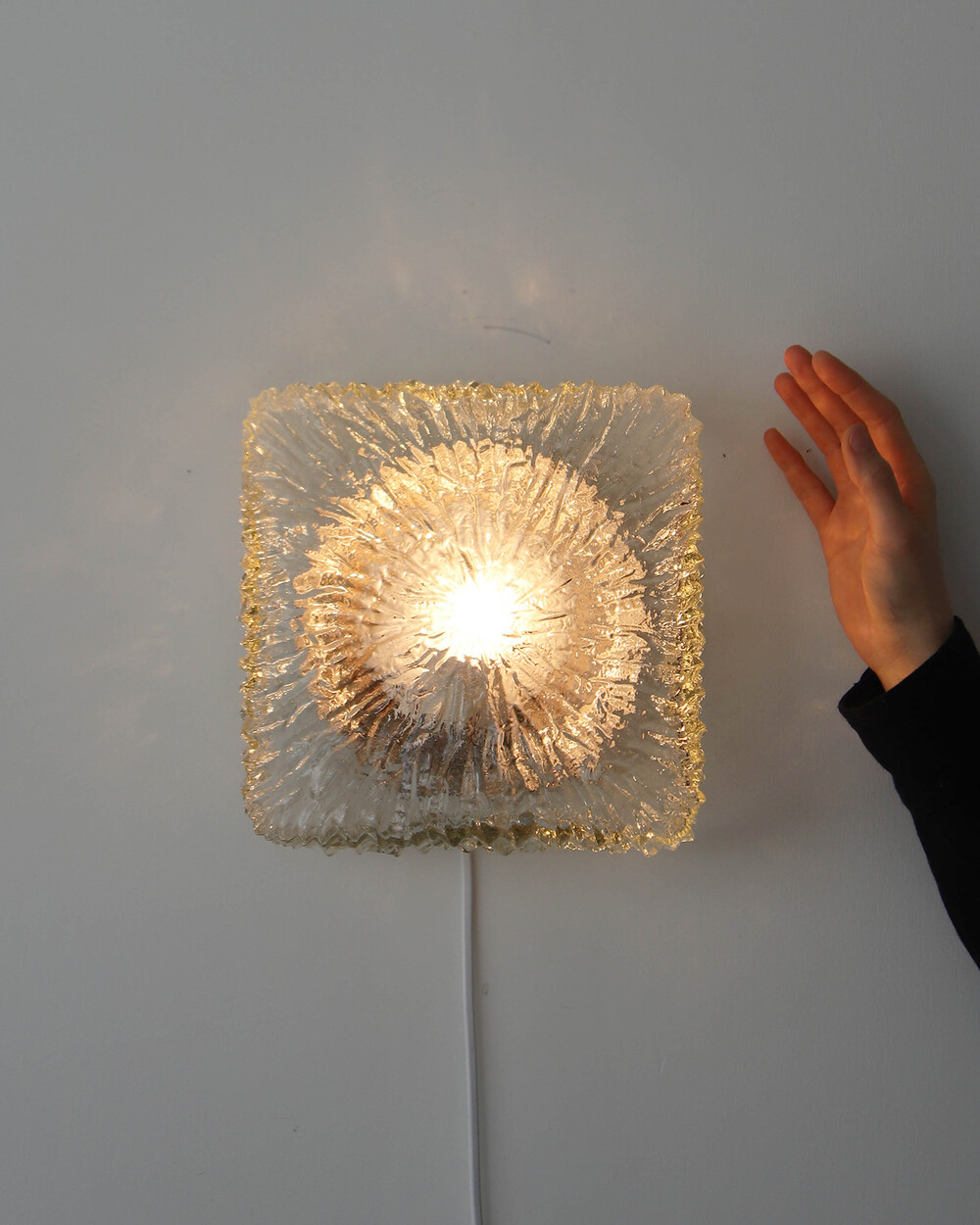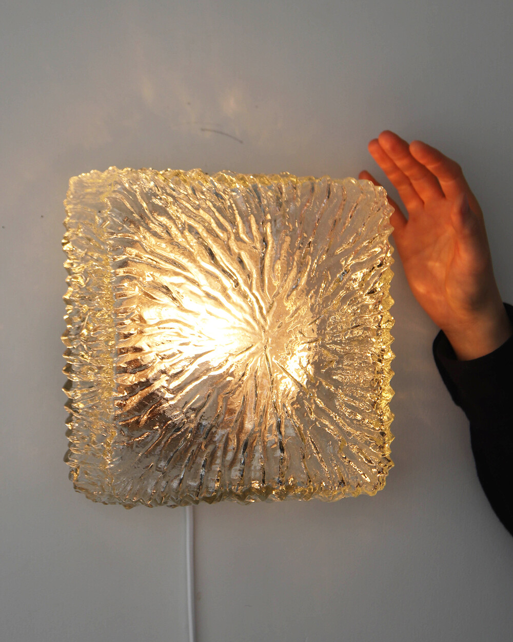 세밀한 주름 텍스처가 돋보이는 스퀘어 글라스 조명으로, 1970년대 독일에서 제작되었습니다. 점등 시 벽면에 풍부한 빛의 그림자를 드리우며, 공간에 섬세한 아름다움을 더해주는 오브제입니다. 벽과 천장에 설치하거나 테이블 조명으로 사용할 수 있습니다.