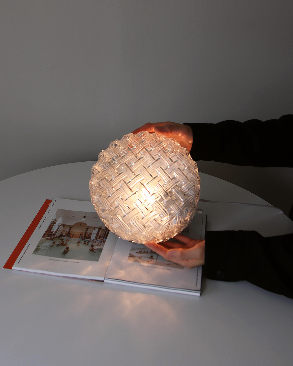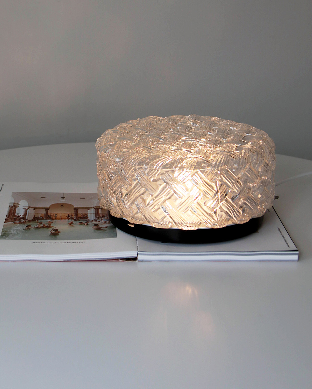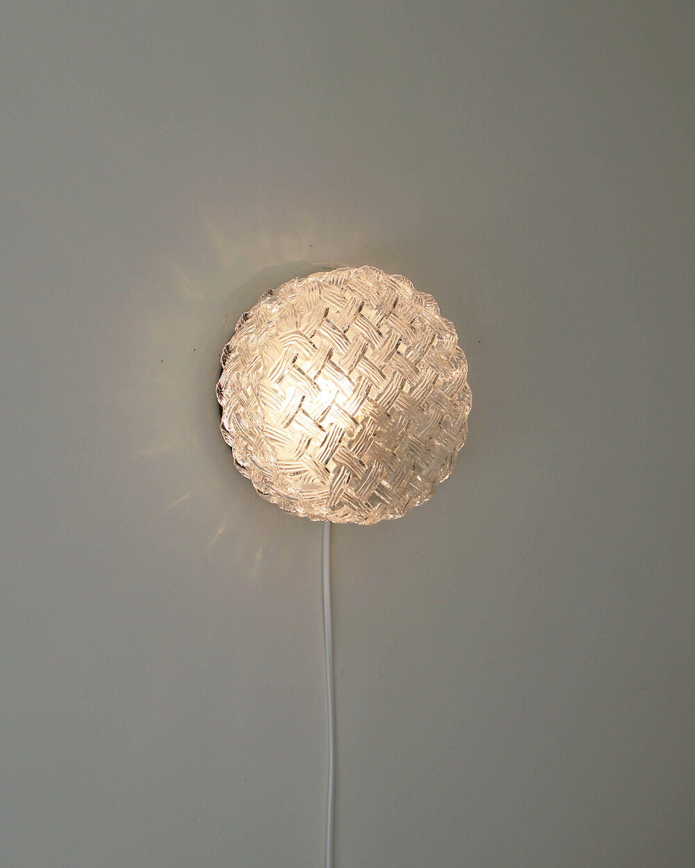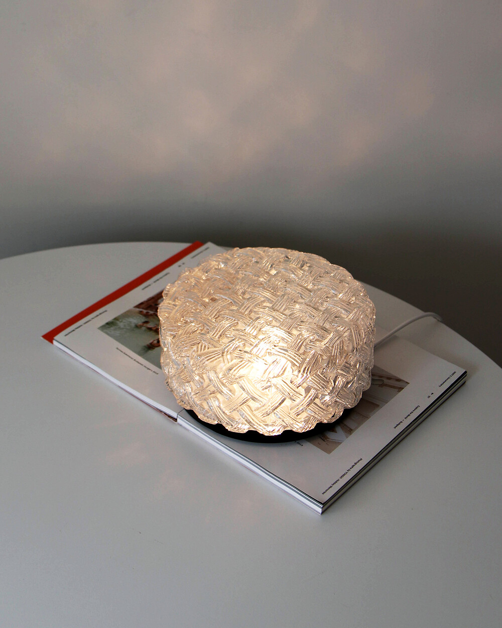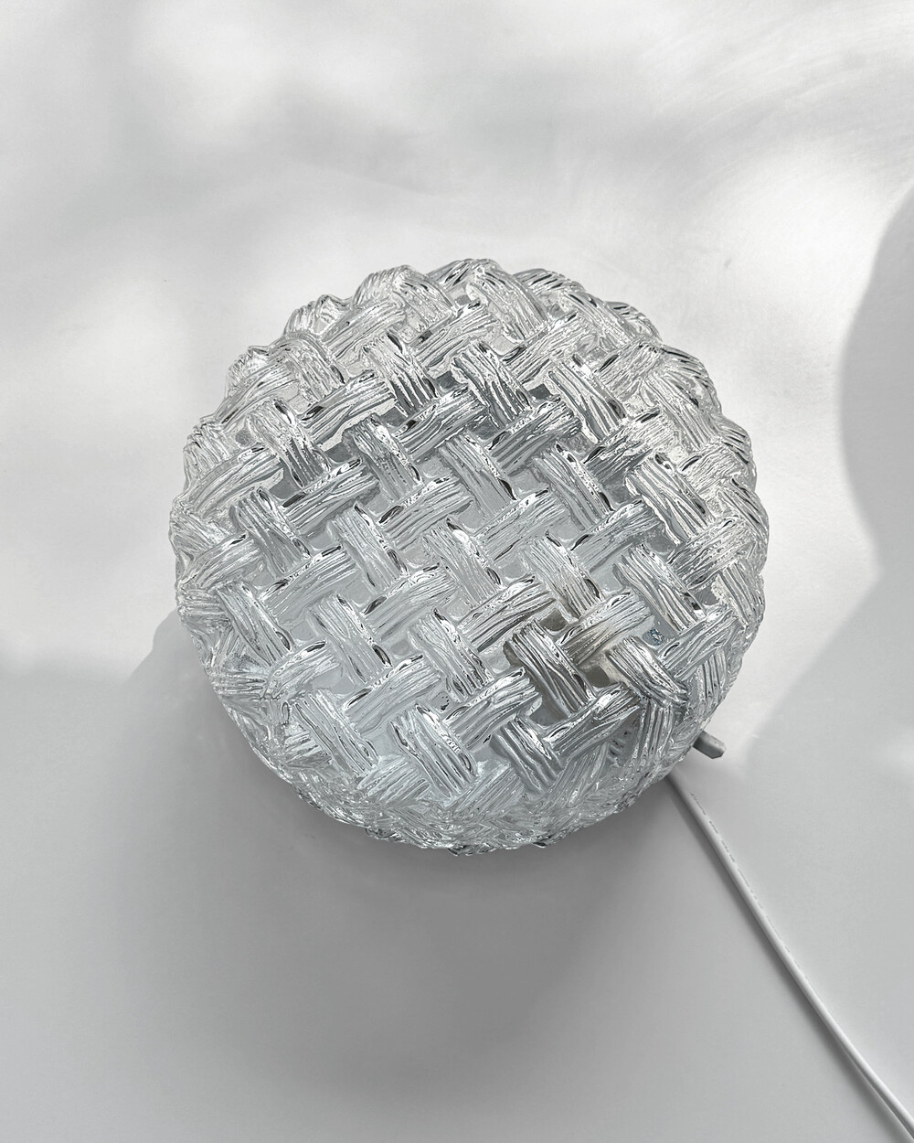 투명한 라운드 글라스에 니트 패턴이 섬세하게 표현되어 있는 테이블 & 벽 조명으로, 1970년대 독일에서 제작되었습니다. 점등 시 벽면에 풍부한 빛의 그림자를 드리우며, 공간에 고전적인 아름다움을 더해주는 오브제입니다.