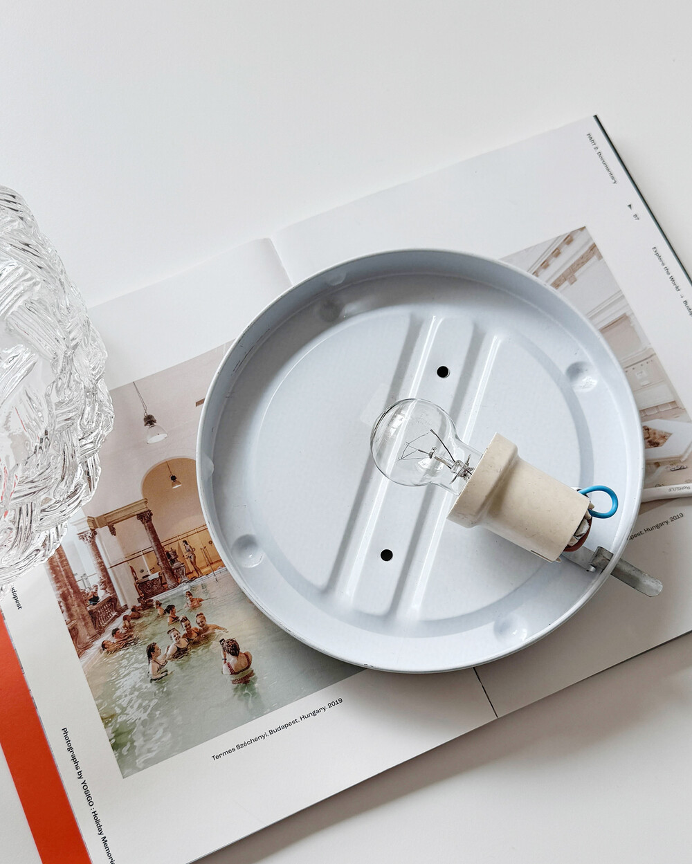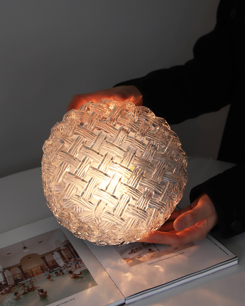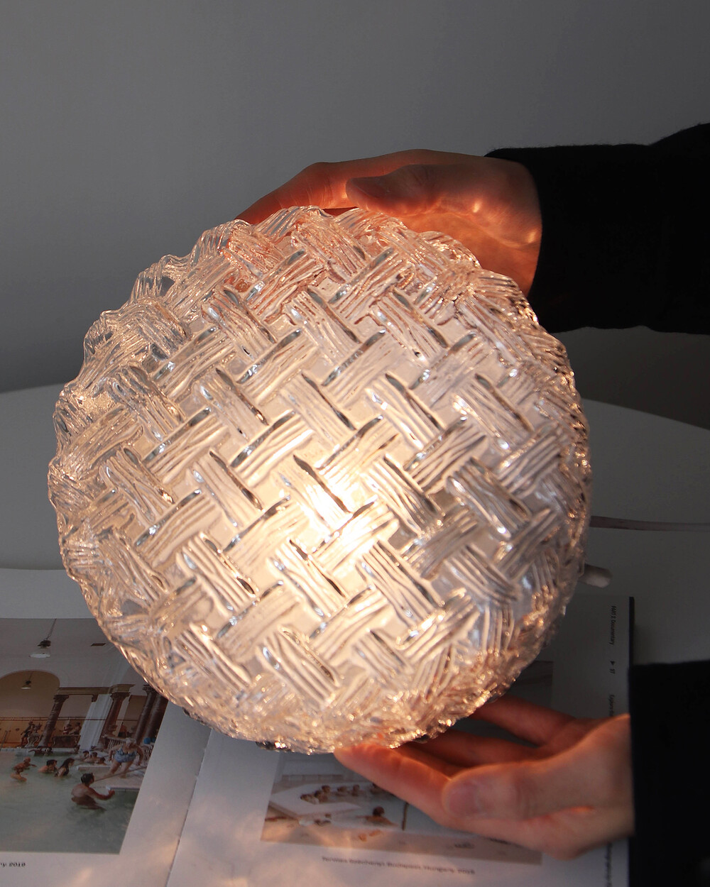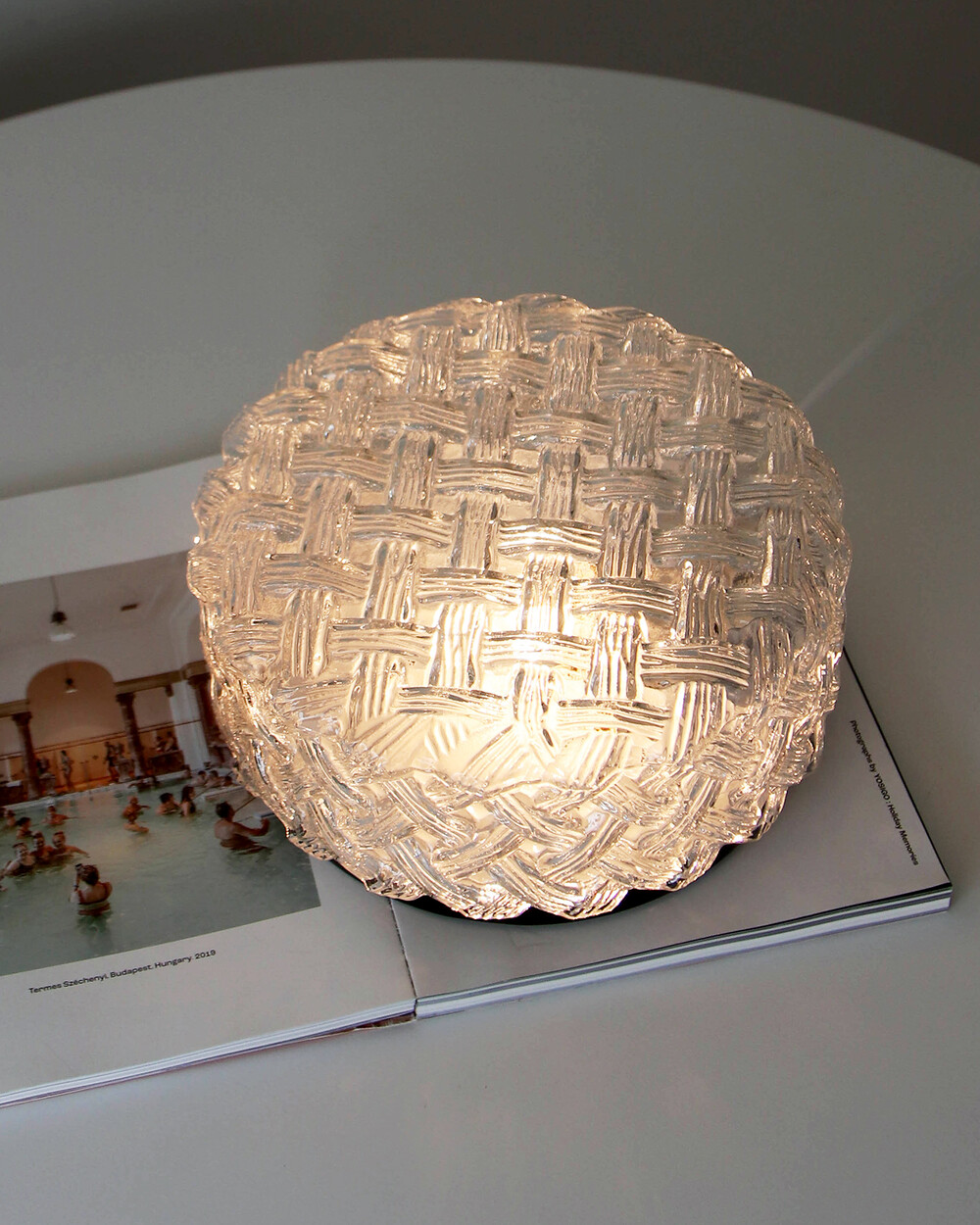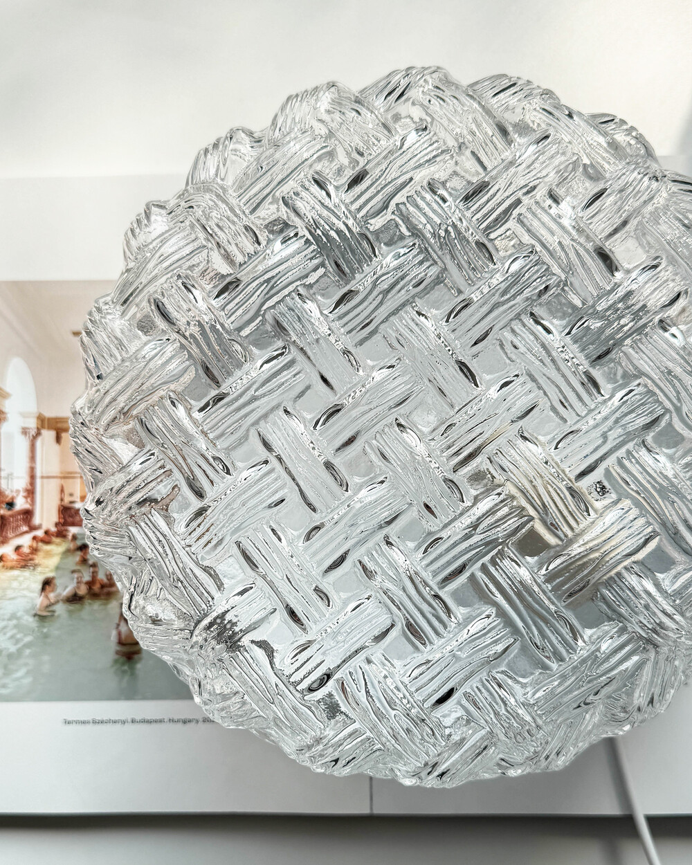 투명한 라운드 글라스에 니트 패턴이 섬세하게 표현되어 있는 테이블 & 벽 조명으로, 1970년대 독일에서 제작되었습니다. 점등 시 벽면에 풍부한 빛의 그림자를 드리우며, 공간에 고전적인 아름다움을 더해주는 오브제입니다.