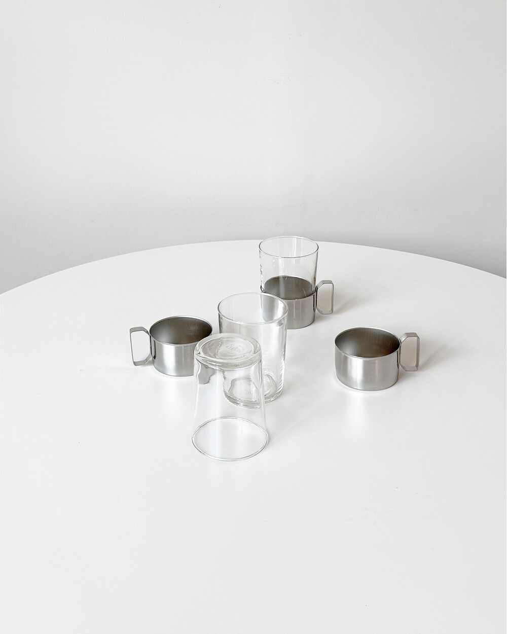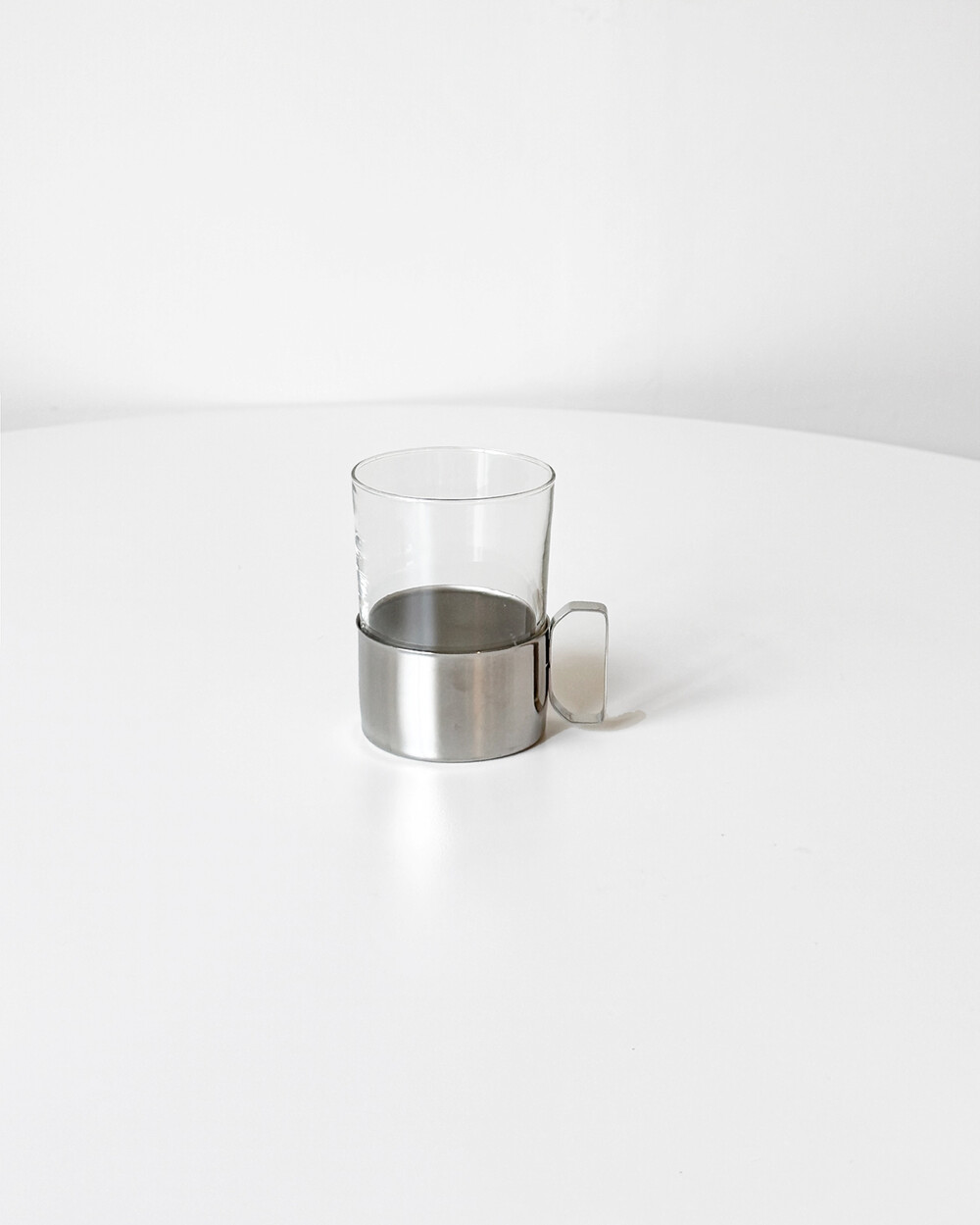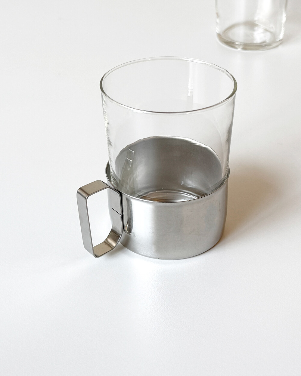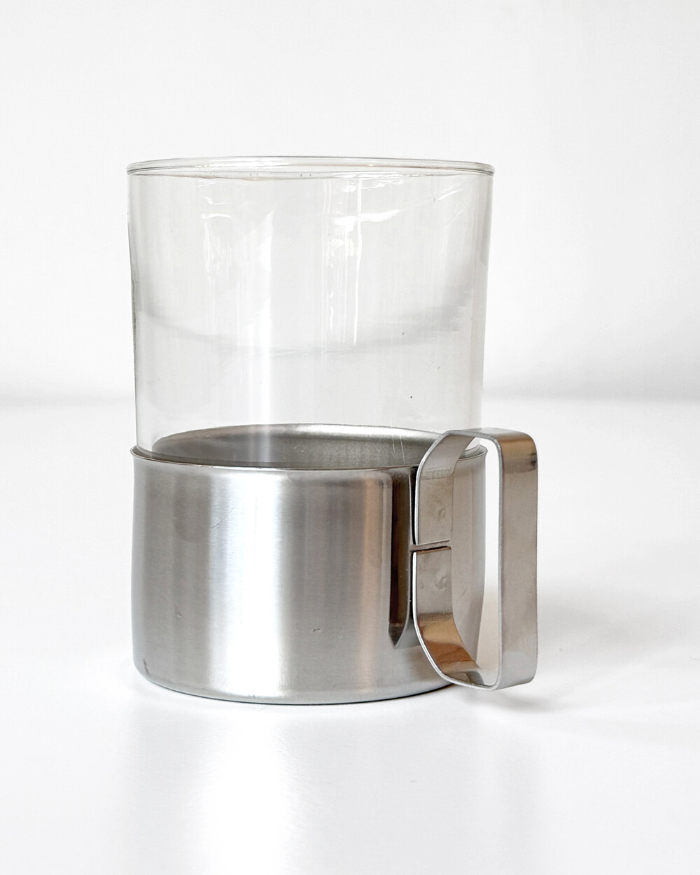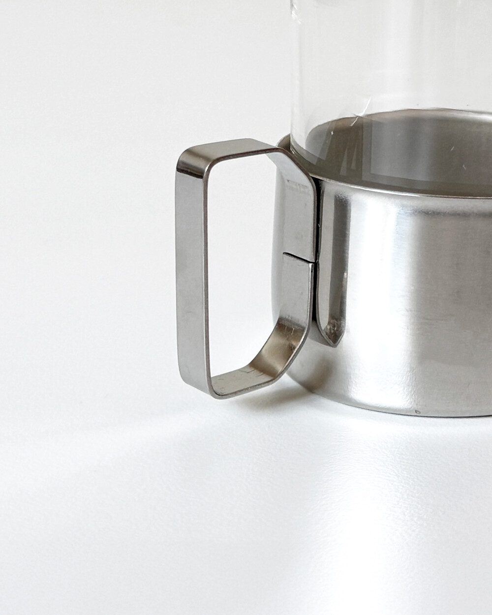 심플한 실루엣에 독특한 쉐입의 핸들이 더해진 70–80년대 Duralex의 빈티지 컵입니다. 직선적인 유리컵과 스테인리스 홀더가 조화를 이루는 모던한 디자인으로, 따뜻한 음료를 담을 수 있도록 내열유리가 사용되었습니다.