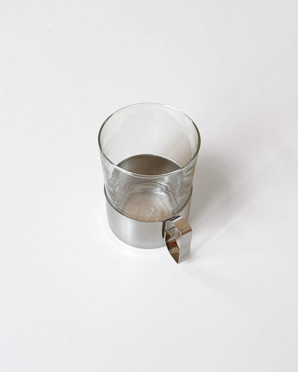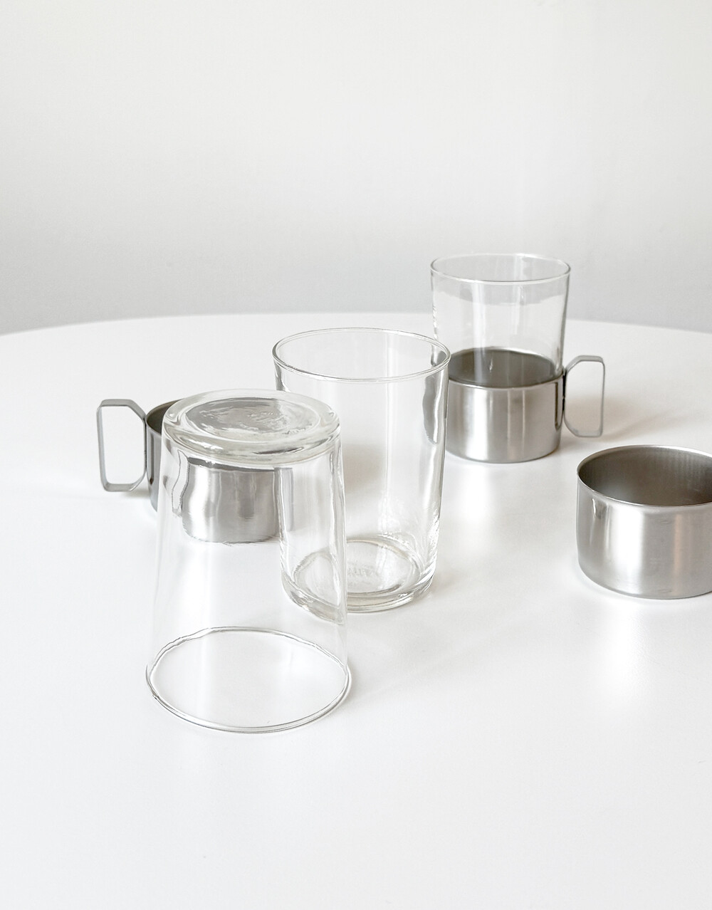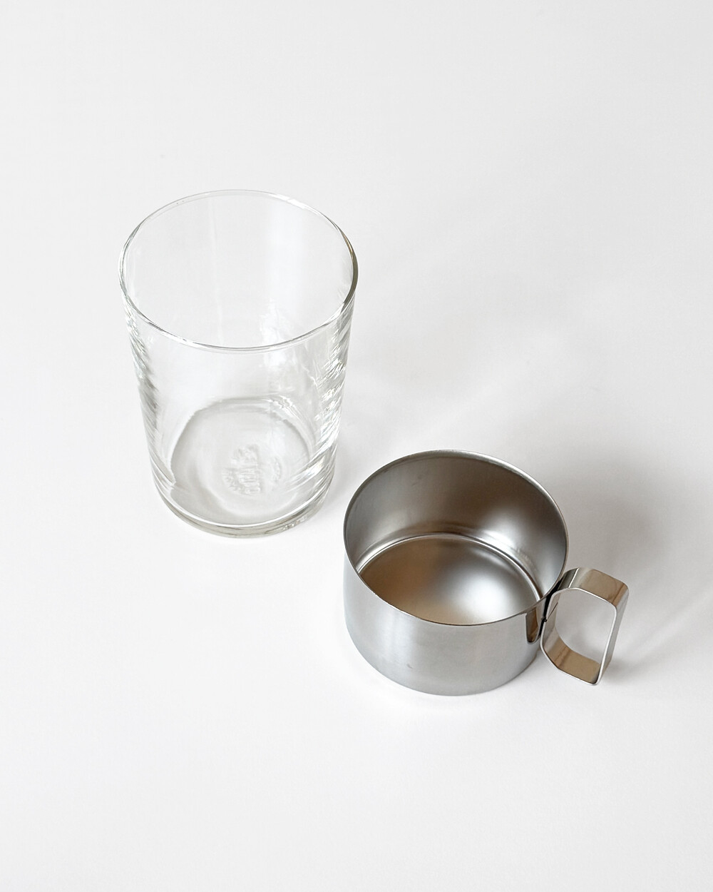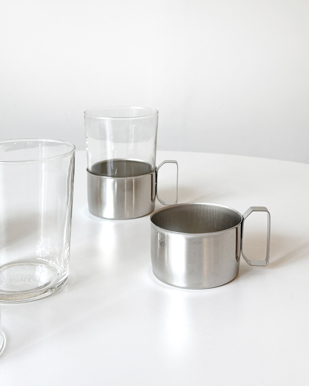 심플한 실루엣에 독특한 쉐입의 핸들이 더해진 70–80년대 Duralex의 빈티지 컵입니다. 직선적인 유리컵과 스테인리스 홀더가 조화를 이루는 모던한 디자인으로, 따뜻한 음료를 담을 수 있도록 내열유리가 사용되었습니다.